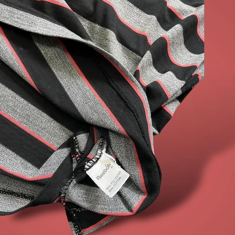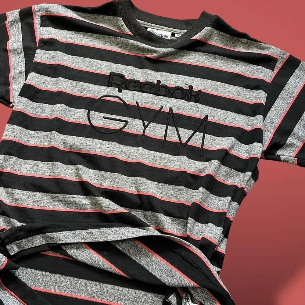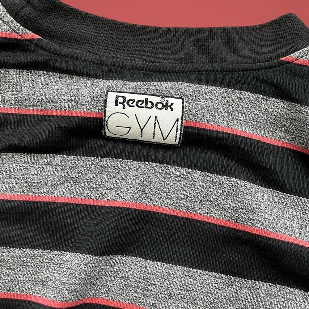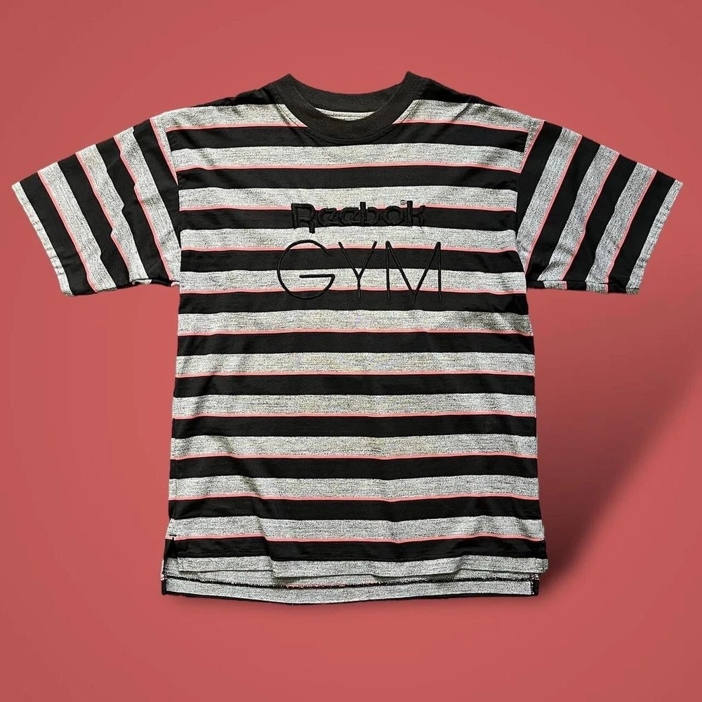 Reebok embroidered heavyweight t shirt | striped grey black 💡 good preloved condition / light general wear 💡 embroidered front 💡 heavyweight cotton/ polyester blend fabric 📐 size M p2p 21" l28" boxy fit