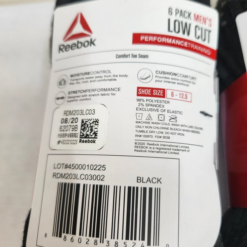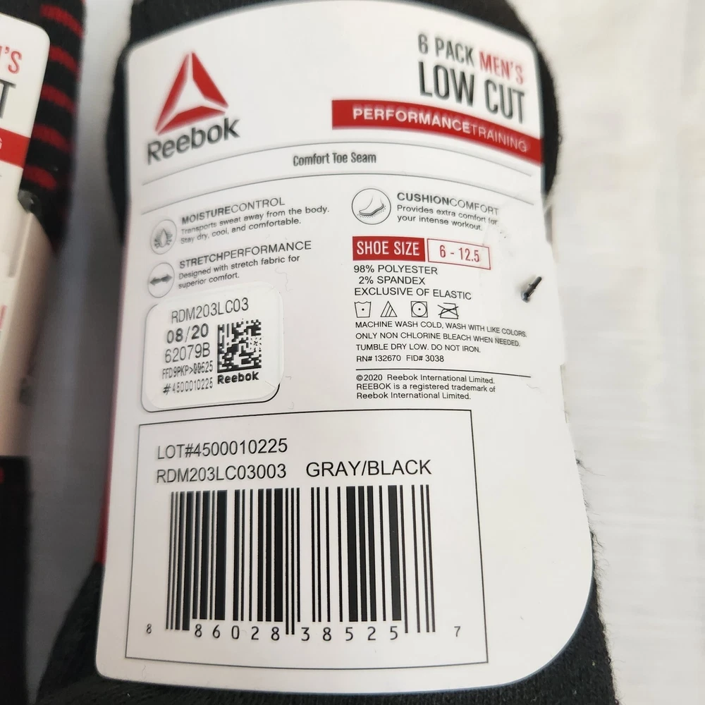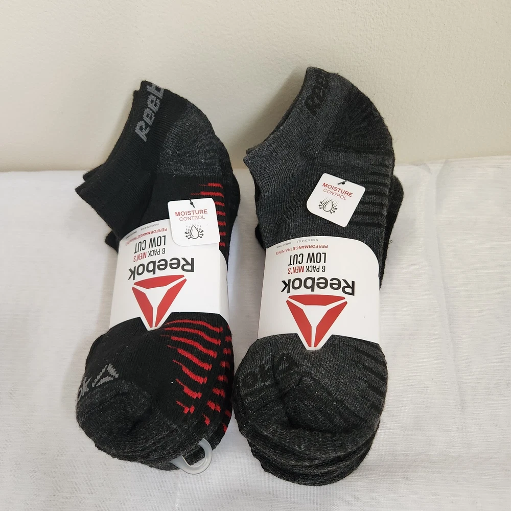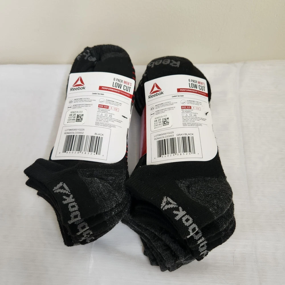 Brand: Reebok Performance/Activity: Cross Training, Gym & Training Style: Low Cut Number in Pack: 6 Pairs Size: Shoe Size 6 - 12.5 Theme: Sports Color: Black w/Red & Black w/Gray Type: Socks Garment Care: Machine Washable Features: All Seasons, Cushioned Sock Length: Low Cut Material: Polyester, Spandex Toe Style: Full Toe Season: Fall, Spring, Summer Occasion: Casual Character: N/A Pattern: Solid Size Type: Regular Department: Men