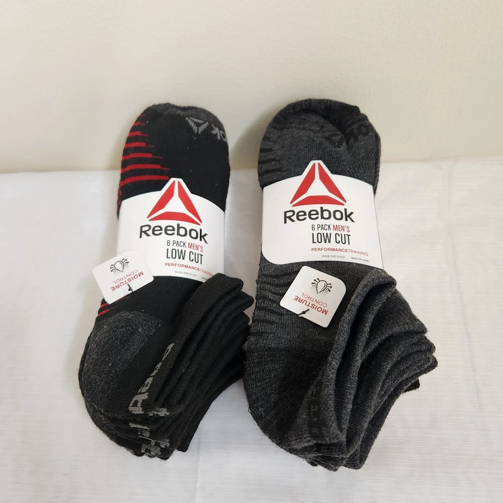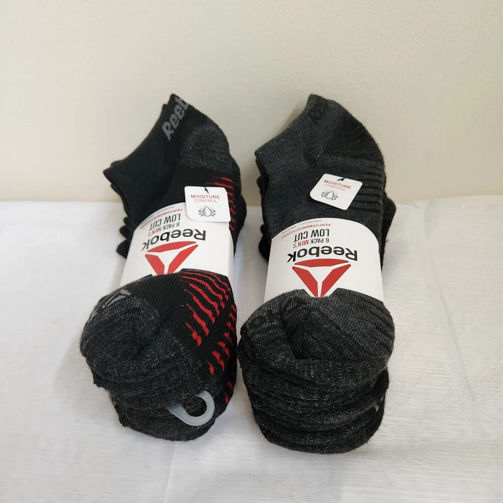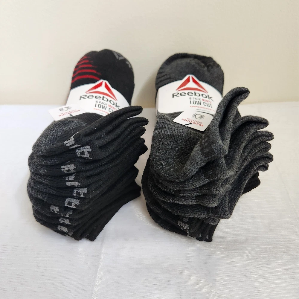 Reebok Socks Mens 6-12.5 Performance Training Low Cut Black/Red & Gray 2 6-Packs - NEW with Tags - Contains 2 - 6 Pack Reebok Mens Performance Training Low Cut Socks Black /w Red & Black /w Gray - Style Profile - Stretch, Moisture Control, Dry, Cool, Comfortable, Cushion, Comfort, Workout, Gym, Sports, Active - Returns acceptable within 30 days of purchase unopened in original packaging