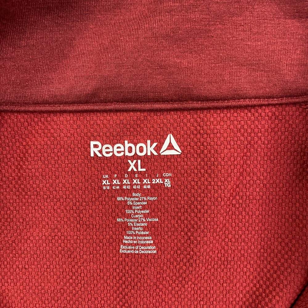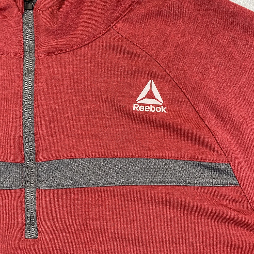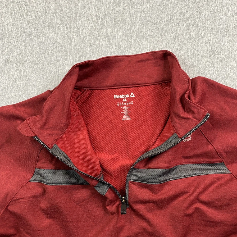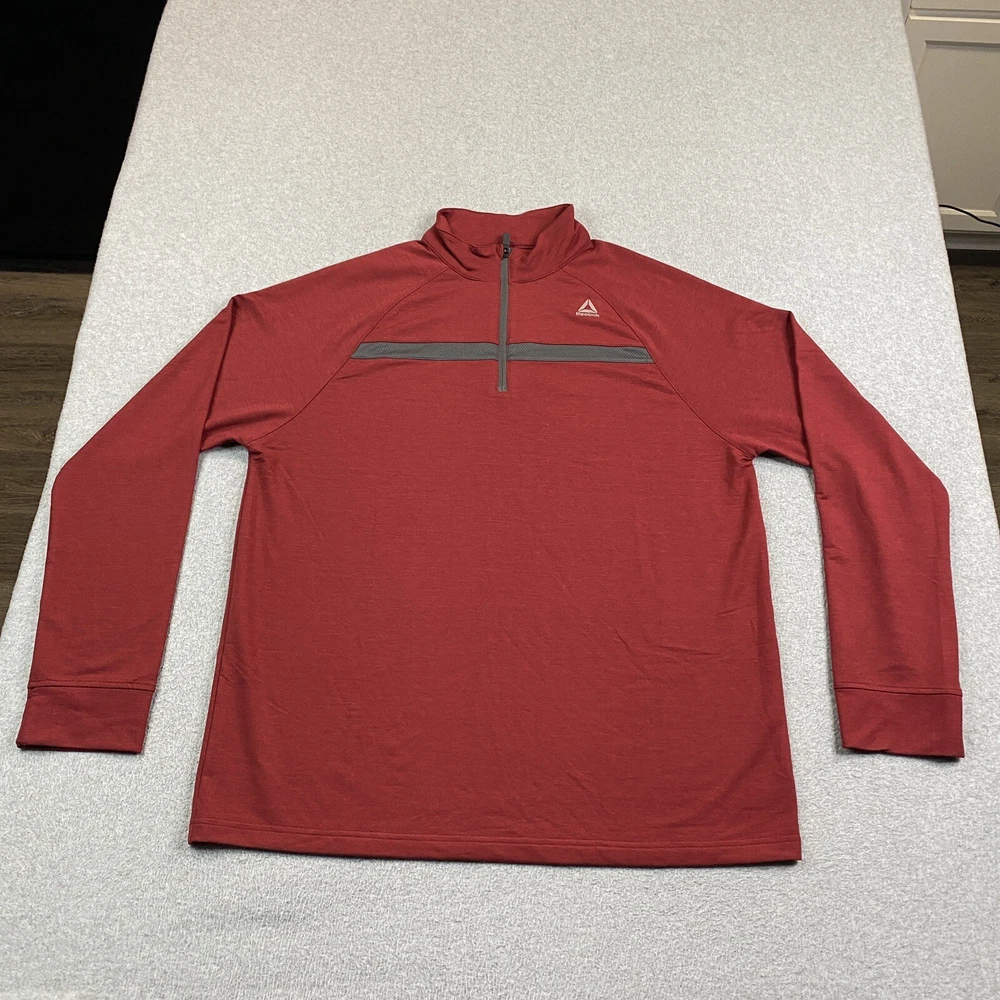 Accents: Logo Brand: Reebok Size: XL Color: Red Pattern: Solid Performance/Activity: Cross Training, Golf, Hiking, Walking, Outdoor, Gym & Training Material: Polyester, Rayon, Spandex Sleeve Length: Long Sleeve Occasion: Activewear Department: Men Size Type: Regular Fabric Type: Knit Seller Notes: “Item is in used condition with no holes or stains.” Country/Region of Manufacture: Indonesia Fit: Regular Theme: Athlete, Athletic, Casual, City, Dad, Outdoor, Preppy, Sports, golf, office, work, workwear Style: Pullover Type: Casual Vintage: No Closure: Pullover Features: 1/4 Zip Neckline: Mock Neck