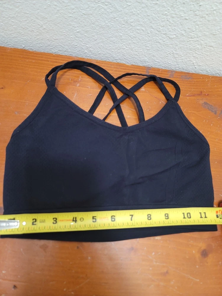 This Reebok sports bra, crafted from a nylon-spandex blend, offers support and style with crisscross straps and a sleek black design. • Strappy design • 95% Nylon, 5% Spandex • Reebok logo • Black color • Small size Underarm to underarm = 13 inches. No visible flaws detected. CONDITIONS use, good conditions. see photos for more details.