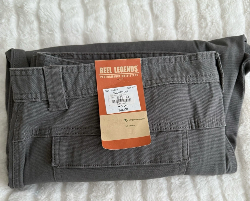 These Reel Legends cotton pants are perfect for any occasion, whether it's for travel, workwear, or casual wear. They come in a stylish gray-smoked pea color and a regular fit, with a straight leg style and a 5-pocket design. The pants have a flat front and a zip and button closure, making them comfortable and easy to wear. These pants are made from high-quality cotton material and are machine washable for easy care. They have a waist size of 42 inches and an inseam of 32 inches, making them suitable for men of all sizes. These khaki pants are perfect for any season, whether it's winter, summer, fall, or spring, and are a great addition to any wardrobe. See photos for new condition.