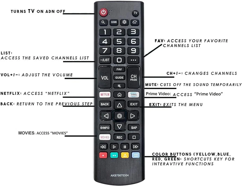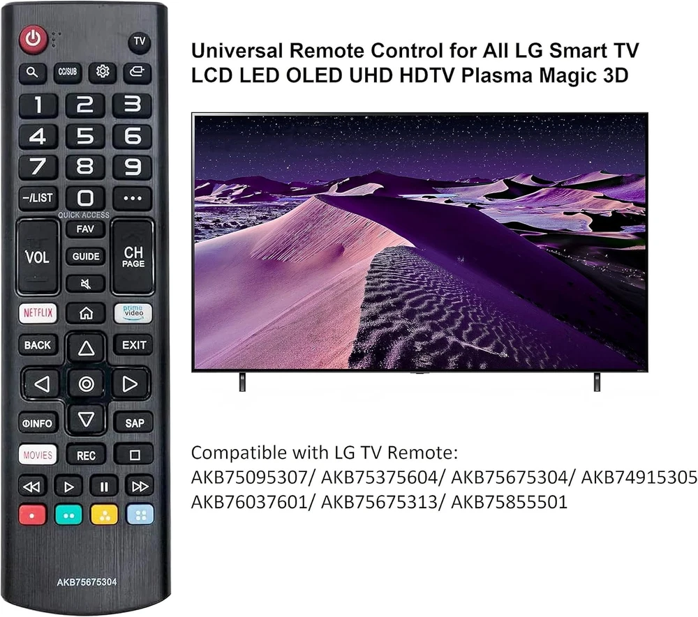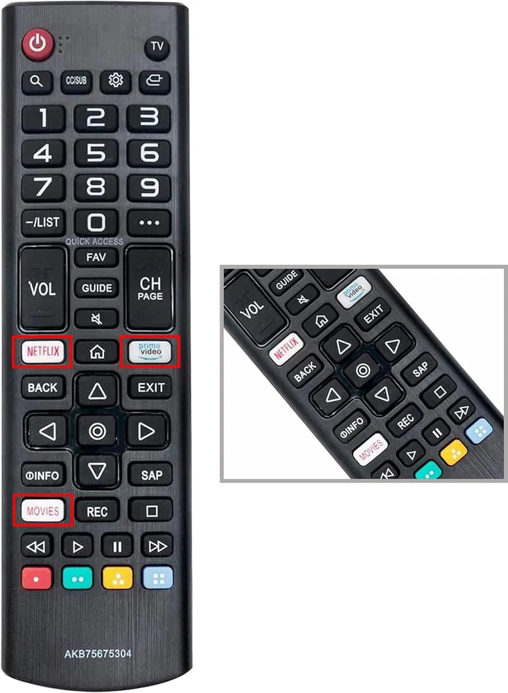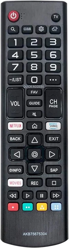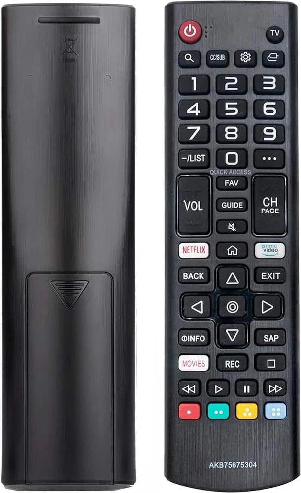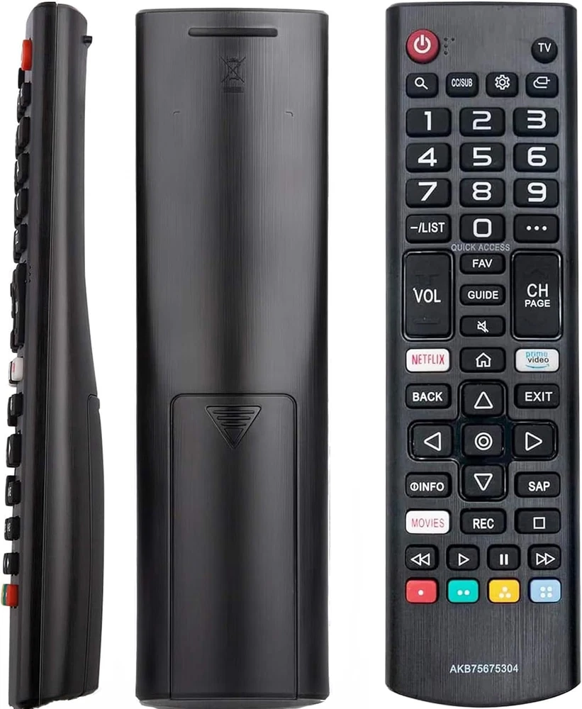 COMPATIBILITY – for All LG LCD LED HDTV Smart TVs Remote with Netflix/Movies/Prime Video shortcut buttons. SENSITIVITY: This remote control is strictly inspected to ensure that each remote control can be used perfectly. Our updated chip remote has a quick transmission response time of 0.2 seconds. EASY TO USE: No programming required, Just install 2 x AAA batteries and start using it to select your favorite TV shows. Fit for ALL LG Smart TV models: 32LJ550B, 32LJ550M, 43LJ550M, 43LJ5500, 43LJ5550, 43UJ6050, 43UJ6300, 43UJ6350, 49LJ550M, 49LJ5500, 49LJ5550, 49UJ6050, 49UJ6300, 49UJ6350, 55LJ5550s, 55LJU60s, 555063, 55LJU60, 5550s, 55LJU60, 5550s and more.... Package Content: 1 x IR Remote Control (batteries not included) AKB75675304 Replacement Remote Control for All LG Smart TV HDTV No need to program or pair it. Just install 2 new 1.5V AAA alkaline batteries, then it works. Compatible with following ALL LG TV models: 32LM5620BPUA 32LM570BPUA 32LM620BPUA 32LM630BPUB 32LM6350PUA 32LM639BPUB 43LM5700PUA 43LM6300PUB 55UM69 65UM73000PUA 43UM6900PUA 49UM6900PUA 55UM6900PUA 65UM6900PUA 43UM7100PUA 49UM7100PUA 60UM7100DUA 70UM7170DUA 55UM7200PUA 60UM7200PUA 43UM7300AUE 43UM7300PUA 43UM7310PUA 49UM7300AUE 49UM7300PUA 50UM7300AUE 50UM7300PUA 50UM7310PUA 55UM7300AUE 55UM7300PUA 65UM7300AUE 65UM7300PUA 70UM7350PUA 70UM7370AUB 70UM7370PUA 50UM7400PUA 55UM7400PUA 65UM7400PUA 75UM7570AUE 75UM7570PUB 75UM7570PUD 82UM7570PUB 86UM7570PUB 50UM7600PUB 55UM7650PUB 65UM7650PUB 75UM8070PUA 82UM8070PUA 86UM8070AUB 86UM8070PUA 43UM6950DUB 49UM6950DUB 55UM6950DUB 60UM6900PUA 60UM6950DUB 65UM6950DUB 70UM6970PUA 75UM6970PUB 55UM6910PUC 65UM7100PUA 75UM7100PUA 43UM6910PUA 55UM7100PUA and more.... Package Content: 1 x IR Remote Control (Batteries and Instructions are NOT Included)