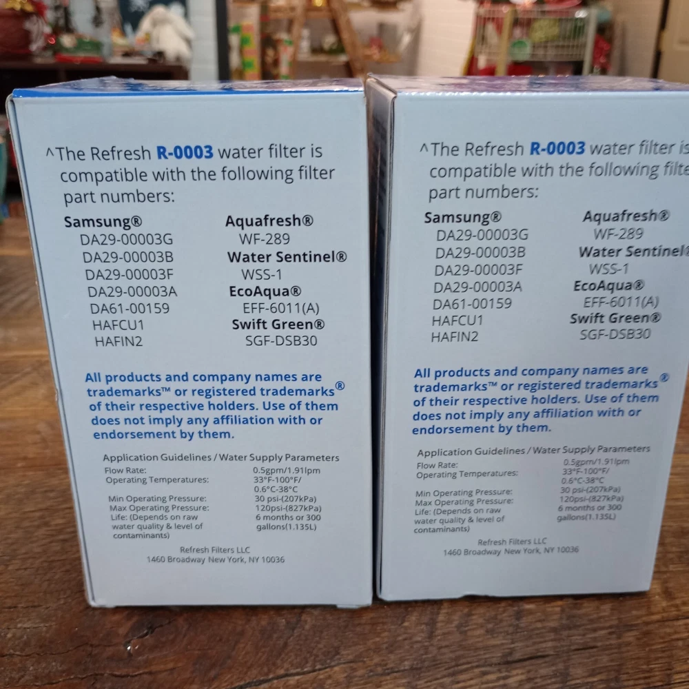 Keep your Samsung refrigerator water clean and fresh with these Refresh water filter replacements. The pack includes two filters suitable for household use. The filters are designed to remove bacteria and other contaminants from your drinking water, ensuring that you always have clean and refreshing water on hand. These filters are compatible with the Samsung model and are easy to install. Each filter has a long lifespan, so you can enjoy clean and refreshing water for a long time. Upgrade your refrigerator's water filtration system with these high-quality Refresh filters. Compatible with Samsung: DA29-00003G DA29-00003B DA29-00003F DA29-00003A DA61-00159 HAFCU1 HAFIN2