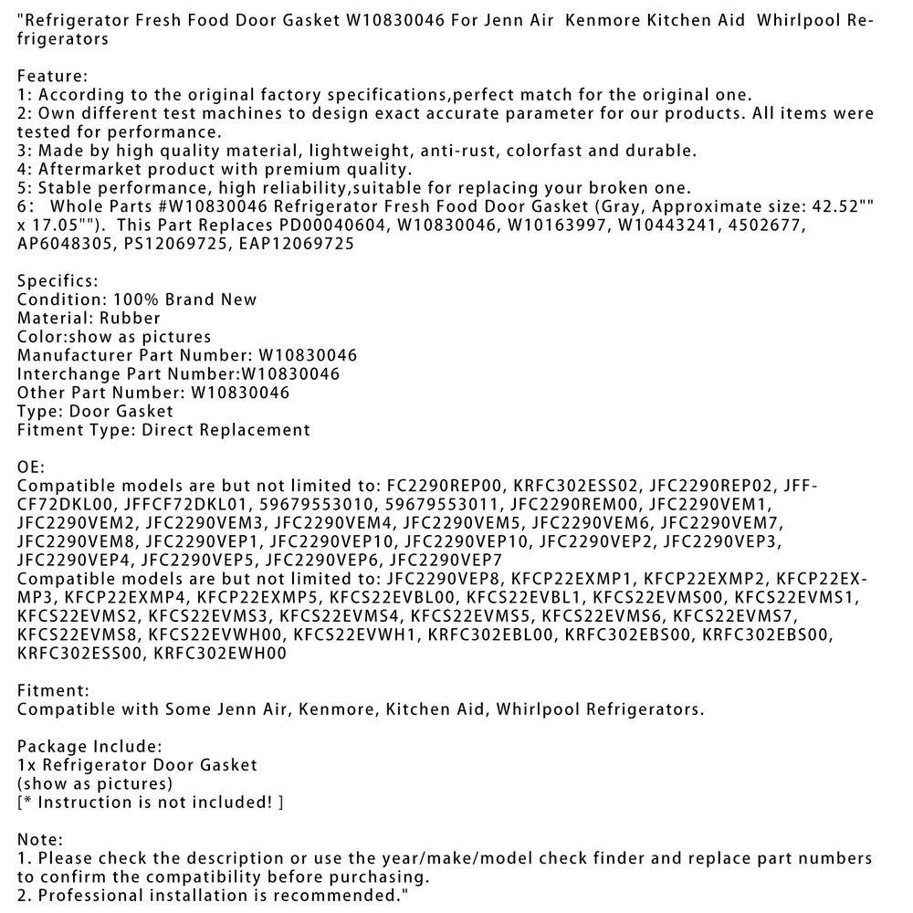 Auto-supermark Your Best Online Business Partner DESCRIPTION PAYMENT SHIPPING RETURN POLICY CONTACT US Shop Category Store Home Other Hot Item 3X For Kawasaki 49065-7007 Oil Filter FR541V FR600V FR651V FR691V 49065-0721 USD 21.79 10PCS Air Filter For Donaldson P822858 & P821575 6672467 FPG05 SFA2858 USD 111.03 Throttle/Choke Cable For Troy-Bilt Craftsman Mustang XP ZT S RZT 57" 94605145 USD 20.29 Air Filter Kit For Bobcat T740 T750 T770 T870 V519 PA31010 PA31011 7010030 USD 48.65 Lube Oil Filter for Kubota Tractor HHTA0-59900 TA240-59900 TA240-59901 L4060HST USD 21.35 New List Item Help & Info Payment Policy Shipping Policy Return Policy FAQ About Us Refrigerator Fresh Food Door Gasket W10830046 For Jenn Air Kenmore Kitchen new Specifics: Condition: 100% Brand New Material: Rubber Color: show as pictures Manufacturer Part Number: W10830046 Interchange Part Number: W10830046 Other Part Number: W10830046 Type: Door Gasket Fitment Type: Direct Replacement OE: Compatible models are but not limited to: FC2290REP00, KRFC302ESS02, JFC2290REP02, JFFCF72DKL00, JFFCF72DKL01, 59679553010, 59679553011, JFC2290REM00, JFC2290VEM1, JFC2290VEM2, JFC2290VEM3, JFC2290VEM4, JFC2290VEM5, JFC2290VEM6, JFC2290VEM7, JFC2290VEM8, JFC2290VEP1, JFC2290VEP10, JFC2290VEP10, JFC2290VEP2, JFC2290VEP3, JFC2290VEP4, JFC2290VEP5, JFC2290VEP6, JFC2290VEP7 Compatible models are but not limited to: JFC2290VEP8, KFCP22EXMP1, KFCP22EXMP2, KFCP22EXMP3, KFCP22EXMP4, KFCP22EXMP5, KFCS22EVBL00, KFCS22EVBL1, KFCS22EVMS00, KFCS22EVMS1, KFCS22EVMS2, KFCS22EVMS3, KFCS22EVMS4, KFCS22EVMS5, KFCS22EVMS6, KFCS22EVMS7, KFCS22EVMS8, KFCS22EVWH00, KFCS22EVWH1, KRFC302EBL00, KRFC302EBS00, KRFC302EBS00, KRFC302ESS00, KRFC302EWH00 Fitment: Compatible with Some Jenn Air, Kenmore, Kitchen Aid, Whirlpool Refrigerators. Package Include: 1x Refrigerator Door Gasket (show as pictures) [* Instruction is not included!] Note: Please carefully checks the item that you need ,and communication is the best way to solve the problem. If you have any problems after purchasing, please contact us in time, before opening return or case. Item Specifics Brand : Unbranded Color : as shown in pictures Compatible Brand : Jenn Air, Kenmore, Kitchen Aid, Whirlpool Fitment Type : Direct Replacement Interchange Part Number : W10830046 Manufacturer Part Number : W10830046 Material : Rubber Model : H075-A047-A Set Includes : 1x Refrigerator Door Gasket Type : Door Gasket Warranty : 3 Months Payment Shipping Returns Contact Us Dear customer,if you have any questions,you can contact us,we will provide the best service for you. The item will be shipped within 24 hours on payment received except the holidays.(except weekends & official holidays). You can log on to eBay to check your logistics tracking number.Please confirm address before purchase, and cannot change address once purchased. If you need to receive the item quickly, please contact us, you can pay the postage to choose other logistics. Please contact us first when return, exchange and refund is required. Any direct return of purchased items will not be processed. Item must be returned in new condition, as received with all accompanied accessories and literature, including the factory carton. Shipping, handling is not refundable unless item is returned because of defect. If the product is defective or damage upon arrival,please contact us immediately,we will provide the solve the problem. Returns accepted within 30 days of delivery date and item must be in original new condition. Our goal is complete customer satisfaction. We will be very honored to provide you with quality service. If there is an issue with shipping or the item you purchased please contact us via ebay message or call us before opening a case or leaving feedback.We will try our best to resolve any kind of issue. All rights reserved.