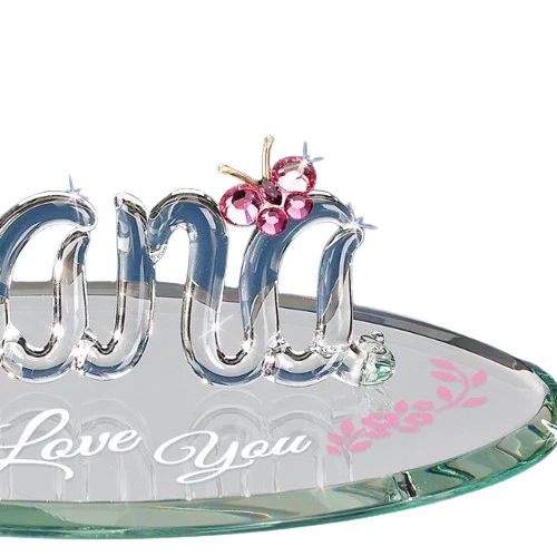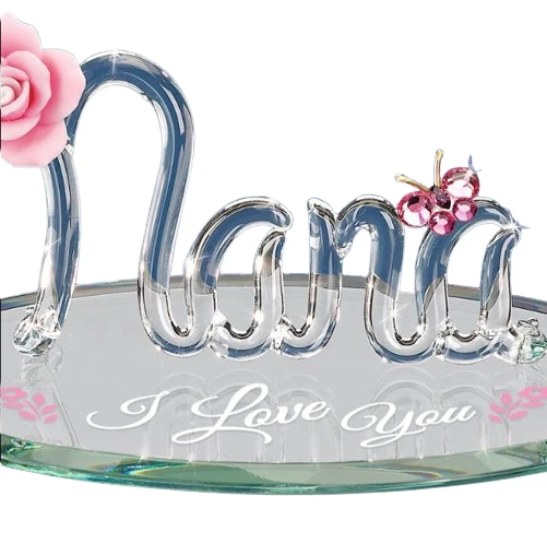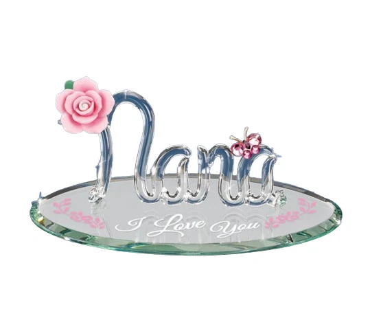 "I Love You" Nana Express your love for Nana with this special handcrafted figurine. Beautifully crafted 3D "Nana" figurine with a pink porcelain rose and crystal butterfly, displayed on a hand-beveled glass mirror. Decorated with real crystals for added sparkle and elegance. Features an embossed "I Love You" message, expressing affection for Nana. Size: 1.9 inches tall, 4 inches wide, and 2.5 inches deep. Glassblowers create stunning objects with fire and glass rods. They start with hot and liquid glass and mold it into beautiful shapes. Our skilled artisans handcrafted every piece and added unique features and motifs. This implies that each item we make is distinct. We invite you to view our collection and experience the beauty that results from our talented artists' deft use of fire and glass.