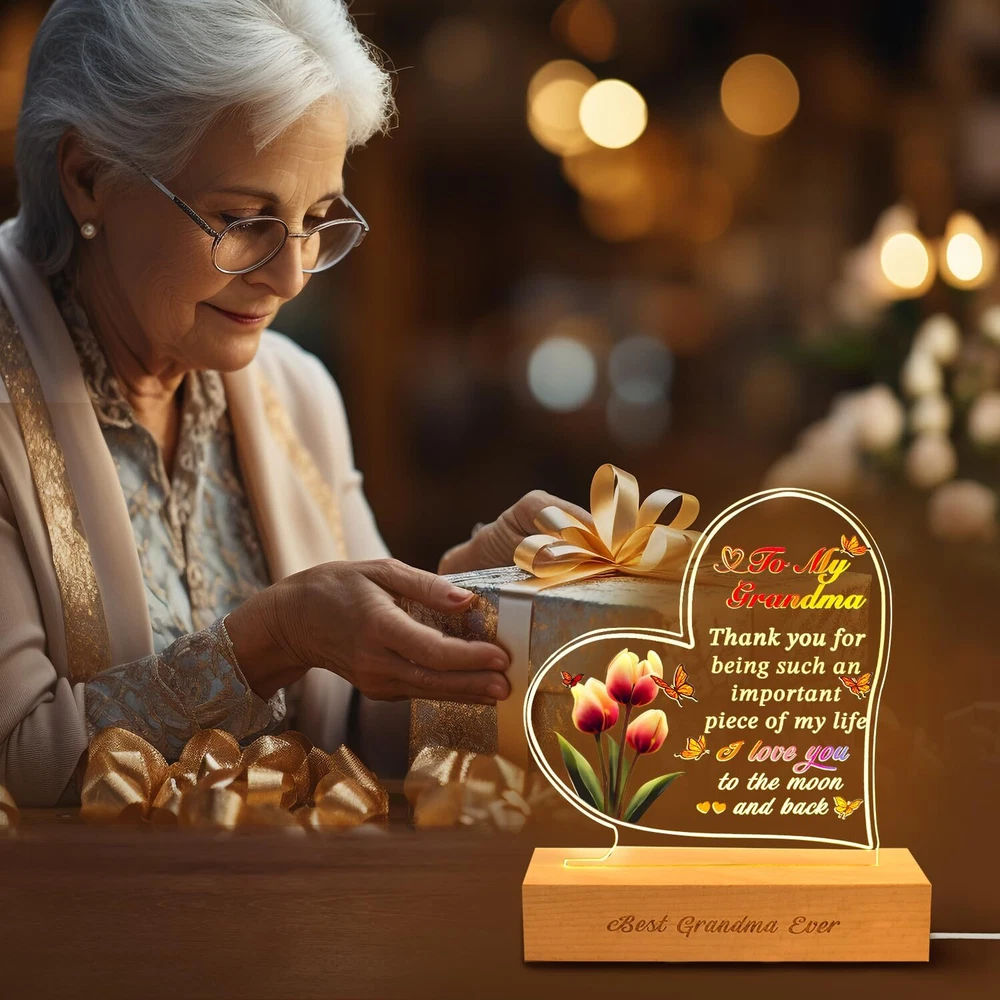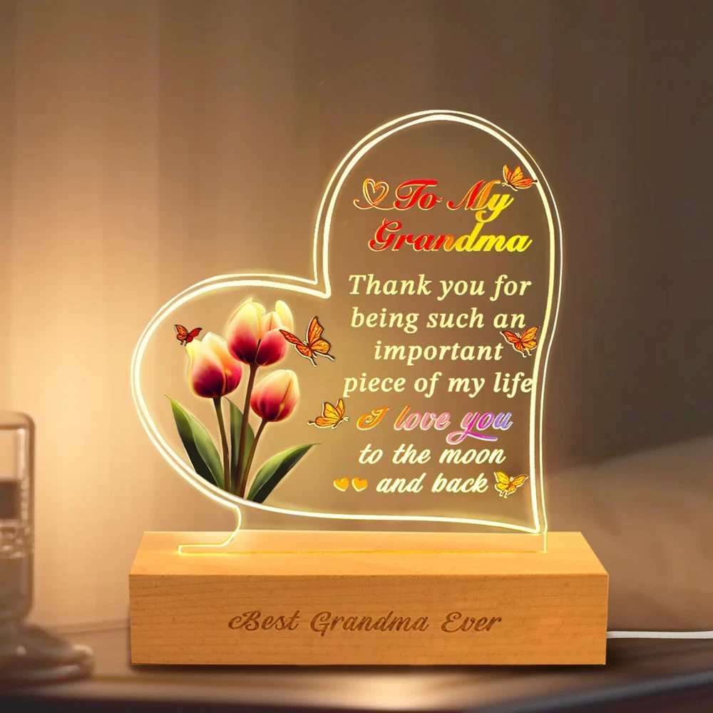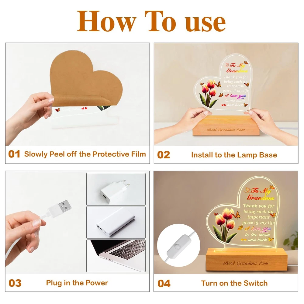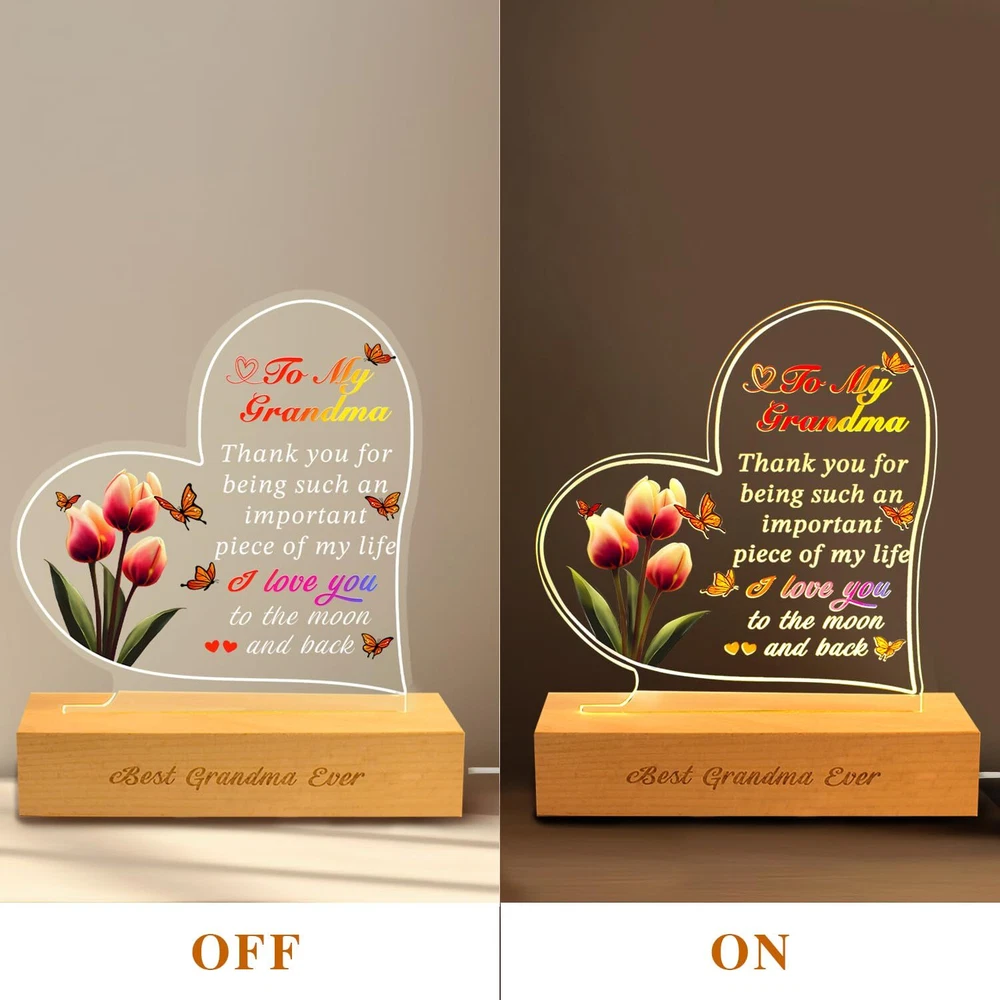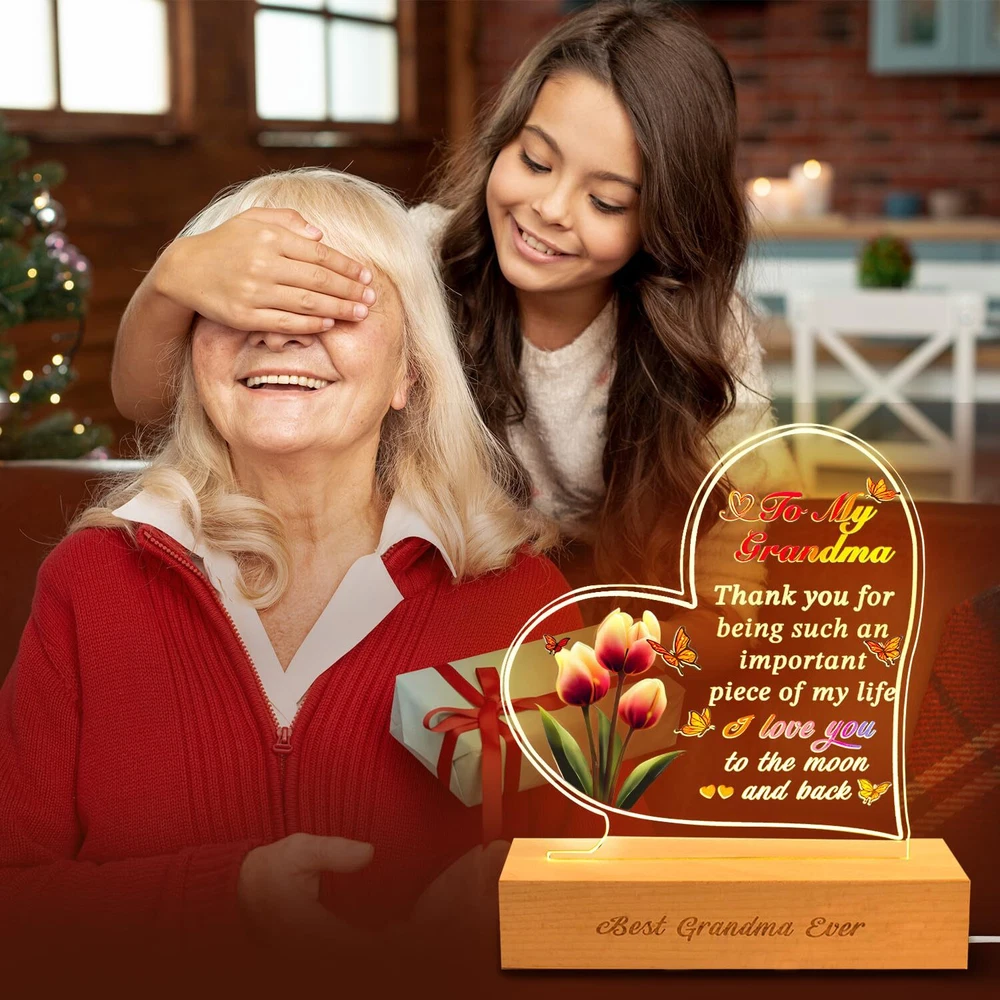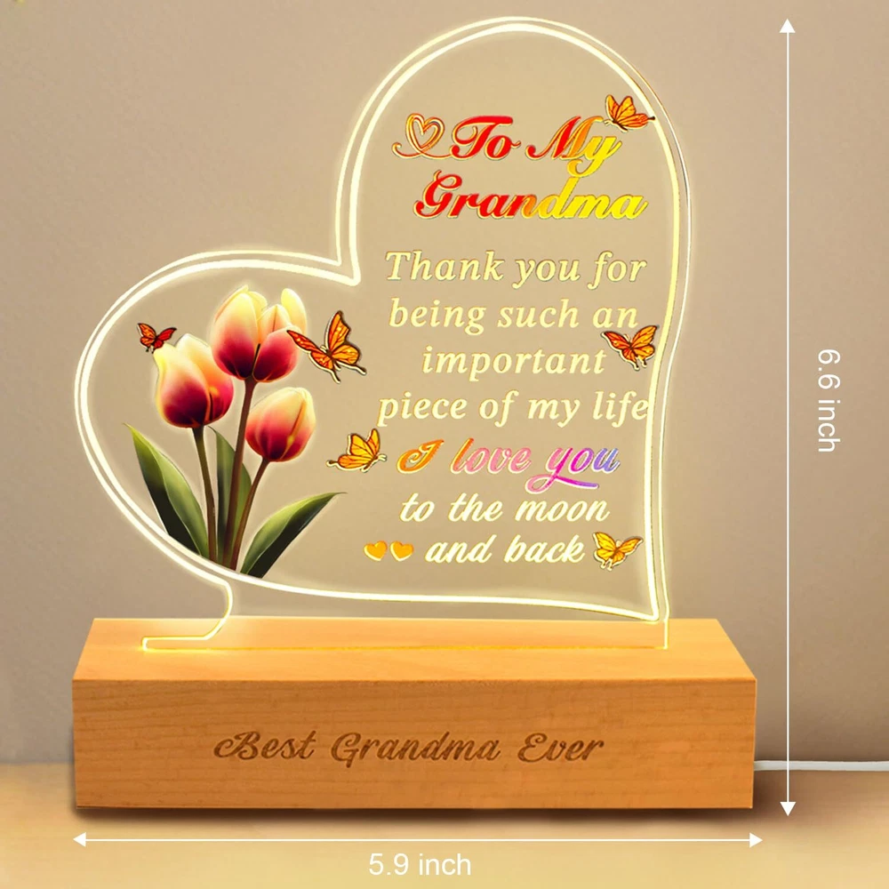 Gifts for Grandma,Acrylic Night Light Rechargeable Lamp Grandma Mothers Day Gift Ideas,Grandma Christmas Gifts Birthday Presents Description and features 【Unique Grandma Gifts】- Decorative night light lamp are the perfect gifts for grandma. These personalized grandma Mothers Day gifts are designed in "heart" . They are printed with warm words and beautiful elements, which represent your love and appreciation for your grandma. Grandma will feel strong love from you. 【Grandma Mothers Day Gifts Ideas】- The mothers day gift for grandma is warm, beautiful and modern . Suitable to grandma(grandmother) on special occasions such as Christmas,birthday, retirement, mother's day, thanksgiving etc. 【Great Room Decor】- The acrylic night light can stand on grandma's bedside table,bookshelf, desk, kitchen table without assembly and enhance home decor with its beautiful design. 【How to Use】- The night light is made of high quality of acrylic and wooden base . Each acrylic is covered with a protective film and please tear off the protective film before use. Then plug in the USB and turn on the switch. Just thus simple. If you have any questions about the product, please contact us. We will reply to you promptly within 24 hours and give a satisfactory solution. 【Grandma Mothers Day Gifts Ideas】- The mothers day gift for grandma is warm, beautiful and modern . Suitable to grandma(grandmother) on special occasions such as Christmas,birthday, retirement, mother's day, thanksgiving etc. Return Policy ⦿ All our products come with a 30-Day Return Policy. If you would like to return your item and you are within 30 days of the purchase, and it is still in its original condition, you can return the item by contacting us through eBay messaging. ⦿ If you are not 100% satisfied, please let us know the Detailed Problem,We will give you a 100% satisfactory solution ⦿ If you received an incorrect, damaged, defective, or item not as described, contact us for a partial/full refund or replacement on our cost. ⦿ Free Shipping and Free Return 30-Days Money Back Guarantee. ☎ For all returned products, buyers MUST contact us for the returning address. Shipping ⦿ We do not ship to a different address. we will ship to the address you provide on the ebay only. Please check your address before purchase. ⦿ It should take 2-4 business days for the product to reach your destination. ⦿ If the product doesn't reach your destination within the time limit, please give it an additional 1-2 business days in case of postal delays and/or possible technical issues. ⦿ We use a selection of shipping services such as UPS, FedEx, USPS etc. ⦿ We ship only to the 48 contiguous states of America. We do not ship to Hawaii, Alaska, US Protectorates, APO/FPO addresses. Local pickups are not offered. ☎ If it takes any longer than that, please do not hesitate to contact us to resolve the issues. Contact us ☎ Please contact us via eBay message. And your message will be replied within 1 business days. For any queries, please feel free to contact us, we will get back to you as quickly as possible. Customer 100% satisfaction is our first priority and goal. We are always working hard for maintain high standards of excellence and resolve your problem in best way. So your POSITIVE FEEDBACK is very important. If you have any problem of the item, please feel free to let us know before leaving your feedback. We will try our best to solve your problem. About us We are here to give you quality products, competitive pricing and amazing service in order to make sure you get the best deal online, Thank you for your business and the opportunity to serve you.