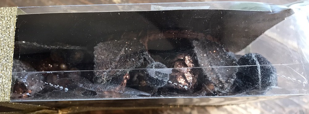 Set of 2 Regency International Frst Holly Berry Chocolate Colored Mini Wreaths. Each Wreath Measures Approximately: 6-1/2” diameter There is some damage to the box and some discoloration on the cardboard insert. Please see photos.