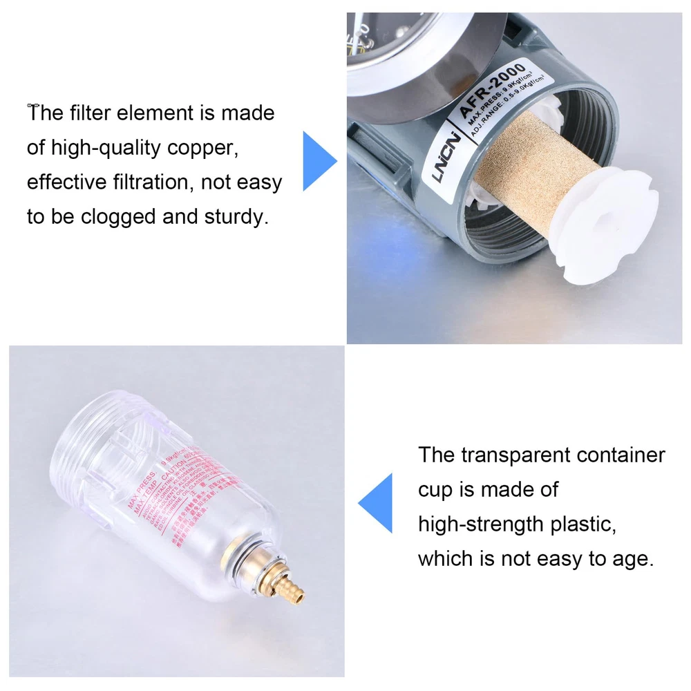 ✔ Using this air regulator you can get accurate pressure with gauge in full control. ✔ Can filter small particles,dust and keep the air dry and clean. ✔ Pull the top button up and turn clockwise to increase the pressure, Or turn counter-clockwise to release the pressure. ✔ Easy to install and remove in light weight. ✔ Easy to dispose waste trapped inside with drain valve.