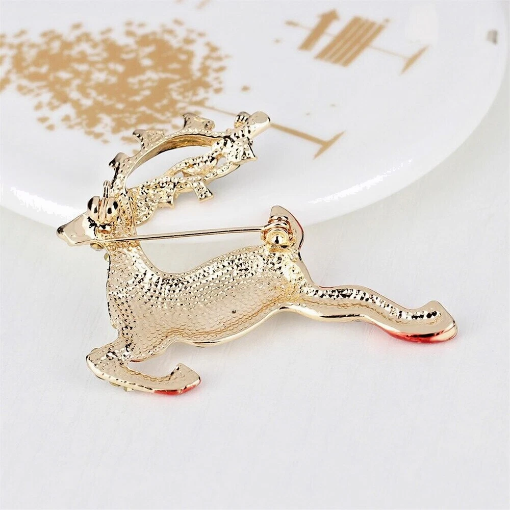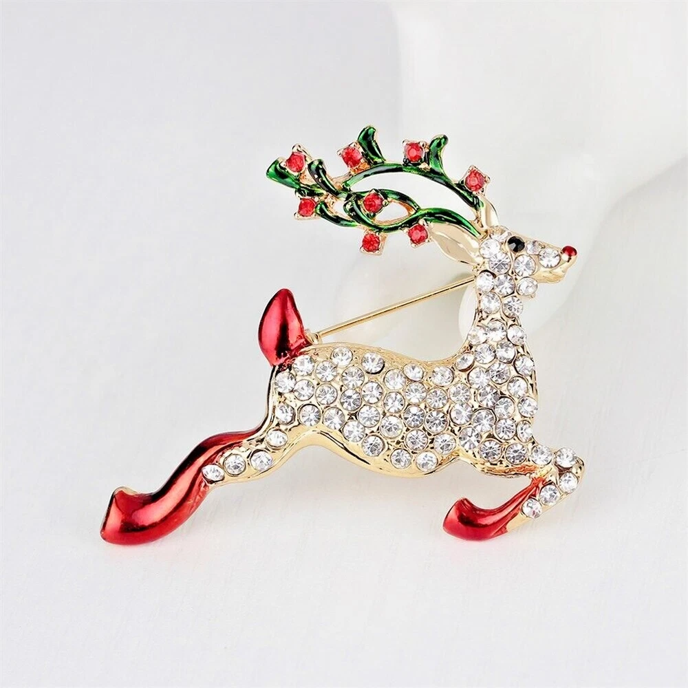 Reindeer Christmas Crystal Rhinestone & Enamel Brooch Pin with Gold Bag Brooch is 1 1/2" x 2 " Free Gold Foil and Cloth Bag Come see all of our other Brooches, Bracelets, Earrings, Necklaces, Pendants, , Rings, and Glow in the Dark jewelry today.
