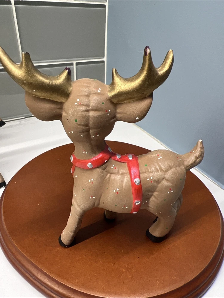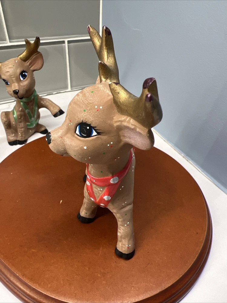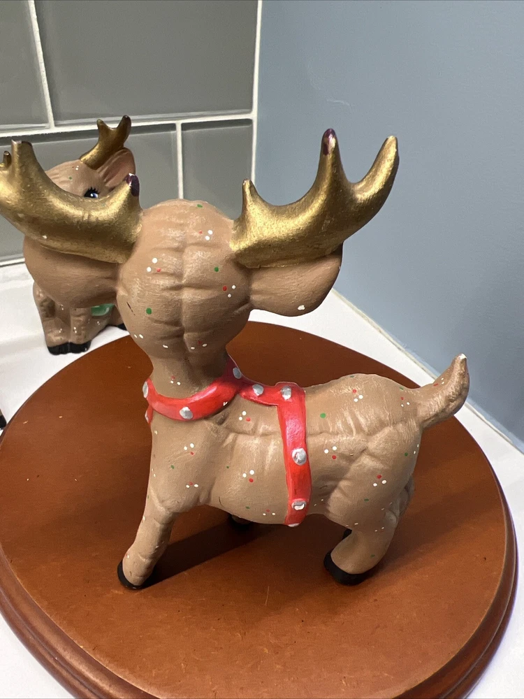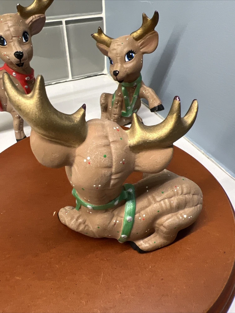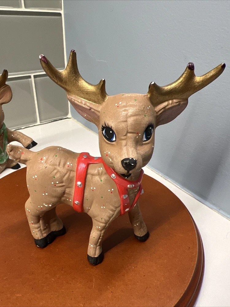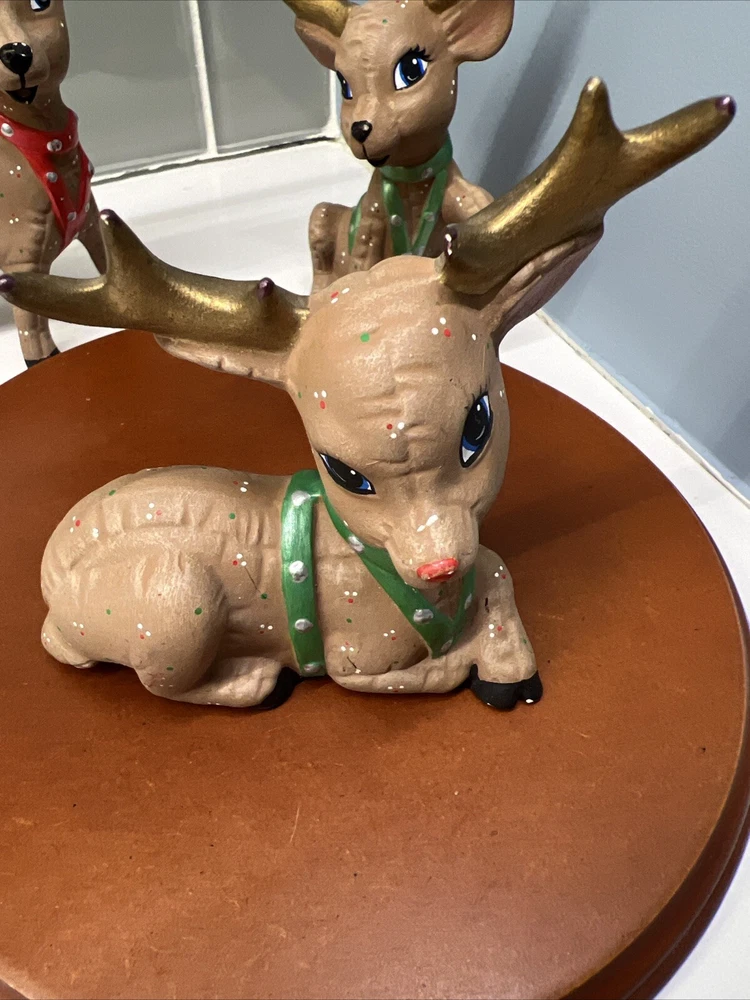 This set of three Reindeer Christmas Figurines are medium-sized ceramic figurines. Hand-painted with polka dots and featuring a brown matte finish, the figurines depicts a festive reindeer characters in different poses. Please see all photos for condition. Older set. I see touch ups on antlers