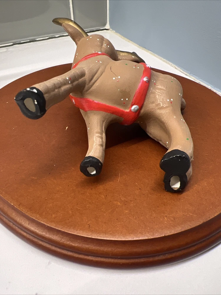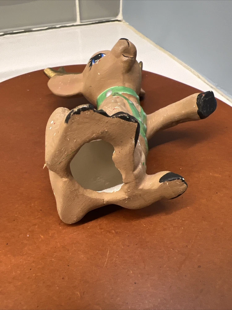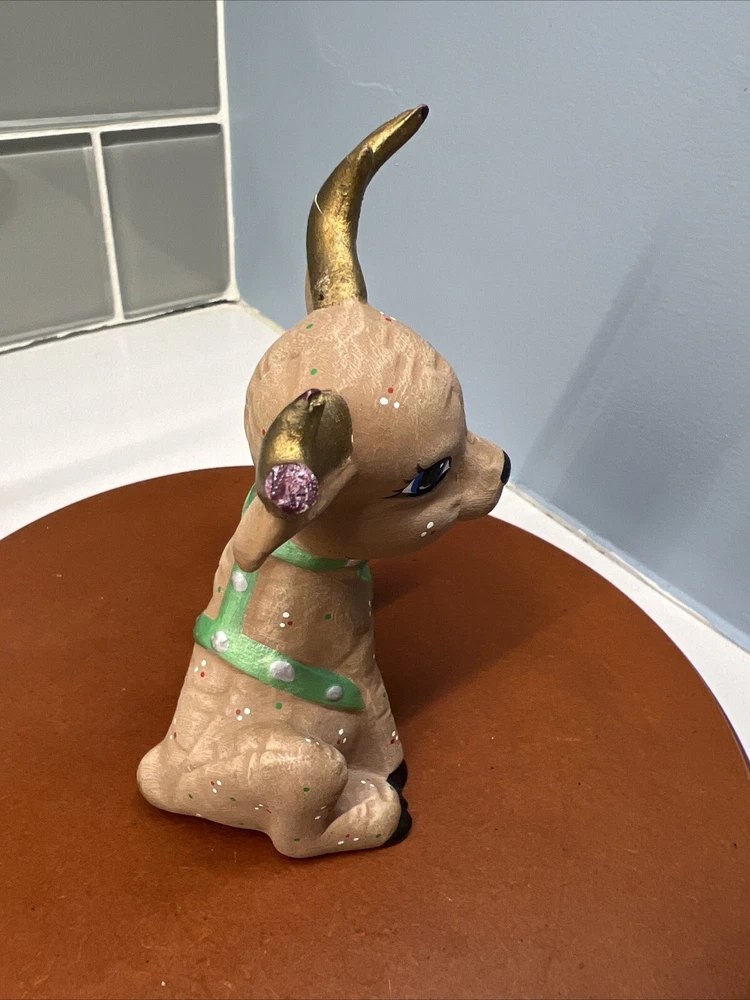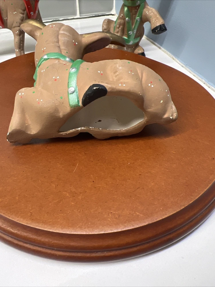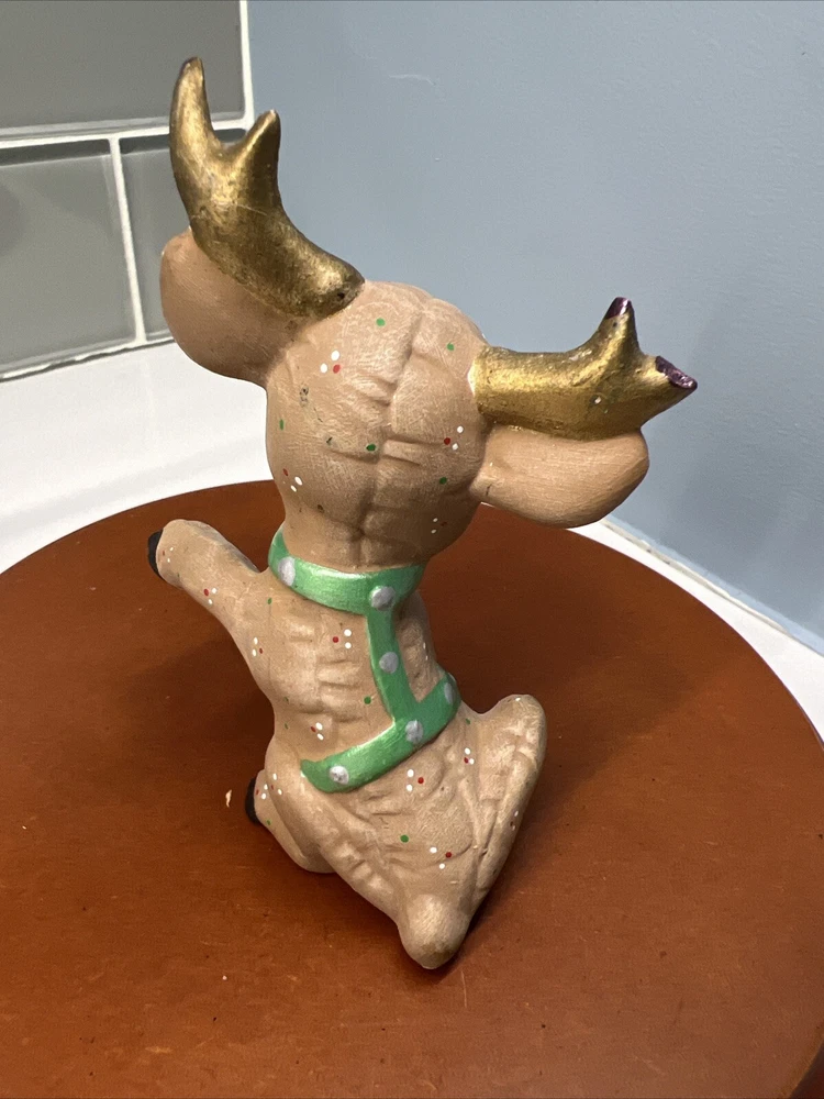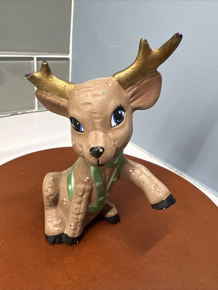 This set of three Reindeer Christmas Figurines are medium-sized ceramic figurines. Hand-painted with polka dots and featuring a brown matte finish, the figurines depicts a festive reindeer characters in different poses. Please see all photos for condition. Older set. I see touch ups on antlers
