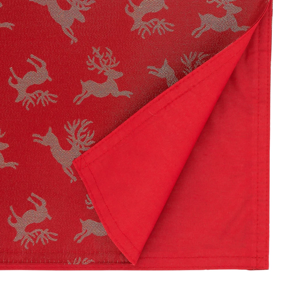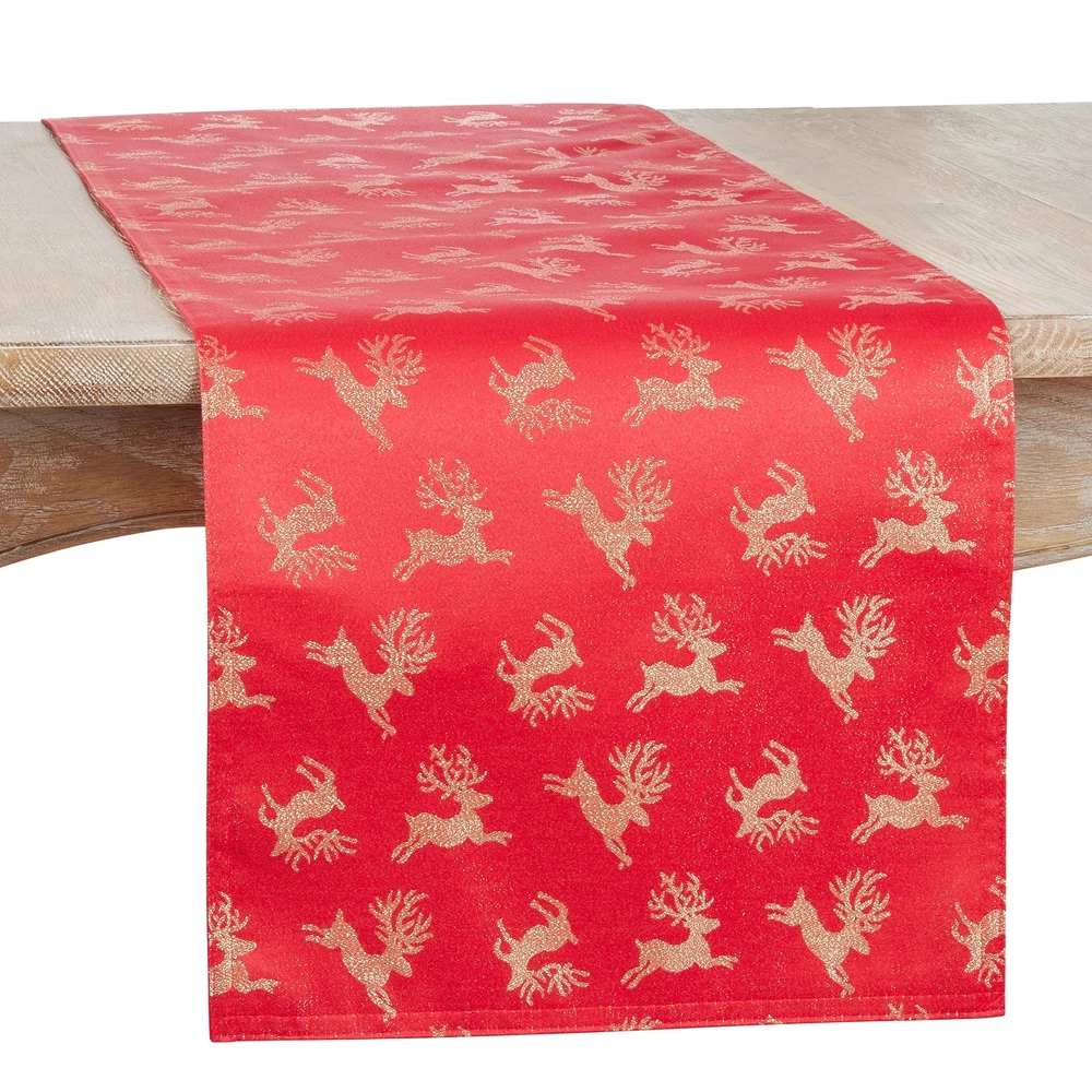 Add a rich splash of color to your tabletop with this gorgeous Reindeer Design Table Runner. Featuring shimmery leaping reindeer against a bright red background, this holiday runner helps set a festive tabletop throughout the season. Pair it with matching placemats for a coordinated look or softer, lighter colors for a contrasting effect.Features: Materials: 100 percent polyester Care: warm machine wash, do not bleach, do not tumble dry, medium iron, dry clean recommended Runner has lining Design is not reversible Polyester is a low wrinkle textile loved for being easy care Free Shipping Over $49.99* Details Reindeer Design Holiday Table Runner - 16"x72" Product Description: Add a rich splash of color to your tabletop with this gorgeous Reindeer Design Table Runner. Featuring shimmery leaping reindeer against a bright red background, this holiday runner helps set a festive tabletop throughout the season. Pair it with matching placemats for a coordinated look or softer, lighter colors for a contrasting effect. Features: Materials100 percent polyester Carewarm machine wash, do not bleach, do not tumble dry, medium iron, dry clean recommended Runner has lining Design is not reversible Polyester is a low wrinkle textile loved for being easy care