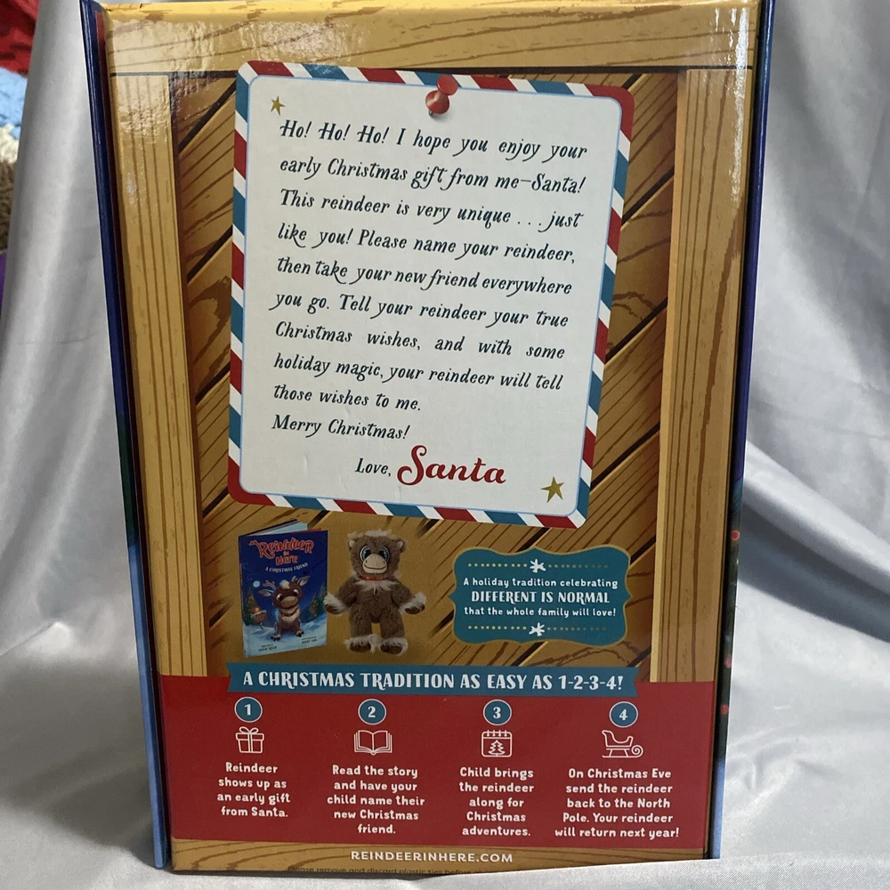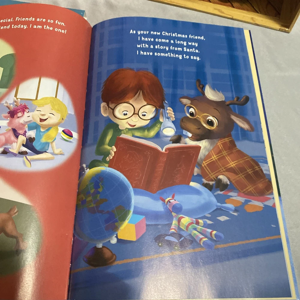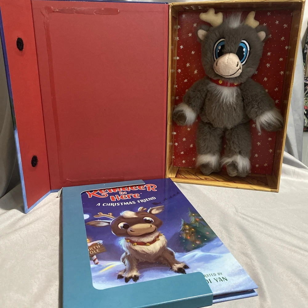 Bring the magic of Christmas into your home with this adorable Reindeer in Here A Christmas Friend figurine set. The set includes a soft plush toy and a hardcover book, both featuring the lovable reindeer characters. Perfect for collectors or as a gift for someone special, this set is sure to bring joy to anyone who loves holiday decor. The book and plush toy are designed with a book shape and feature a beautiful finish, making them a perfect addition to any collection. The set is ideal for Christmas occasions and is sure to be a hit with anyone who loves collecting holiday decor. Add this Reindeer in Here A Christmas Friend set to your collection today! Book holder detached from area due to glue. Great condition nothing used Reindeer still attached to box.