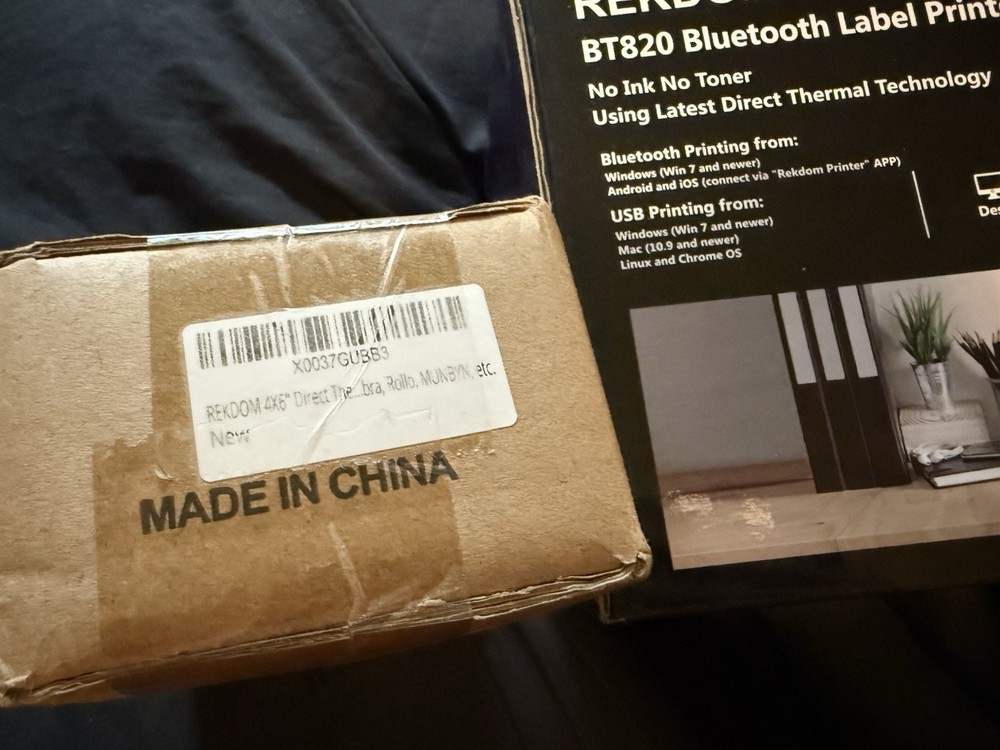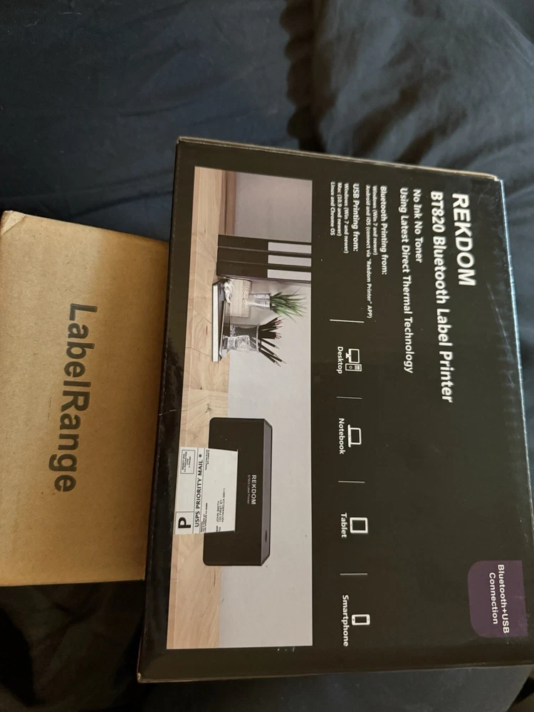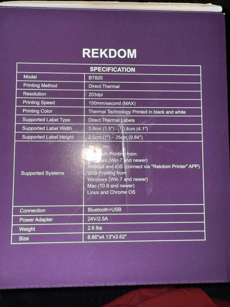 Brand New With Box and comes with a box of labels. Perfect for shipping boxes on any seller platform. Auto label identification, Inkless, all you buy are the BU820 printer and labelsBluetooth connection, easy to setup via "rekdom printer" app, High speed printing Printer Output Monochrome Item Weight 2.6 Pounds Product Dimensions 4.1"D x 8.7"W x 3.6"H Controller Type iOS, Android Compatible Devices Smartphones Dual-sided printing No 【 Wireless Bluetooth or Wired USB Connectivity 】 supports Windows, Android/iOS Smartphone and tablet. Wired USB connectivity supports Windows, Mac, Linux and Chrome OS. Download the driver from USB disk or official website and install it for PC use, 2 more minutes Bluetooth setup only for Windows. Bluetooth printing from Android/iOS Smartphone and tablet via "Rekdom Printer" APP with “Crop Image” and “Scan Barcode” functions. Allow you to crop any PDF label files to match your label sizes. Directly scan 1D/2D barcode from paper, substance or screen and instantly print the exact barcode labels out. 【 Compatibility of Size and Platform 】 Print label sizes from 1.5” to 4.1” (38mm-104mm) width to use in a variety of usage scenarios. Compatible with most platforms including Amazon, eBay, Etsy, Shopify, Shippo, Poshmark, PayPal, Shipstation, USPS, UPS, Pirateship and more. 【 Advanced Thermal and Auto Label without ink and ribbon, minimizing the cost of maintenance and consumables.Stable 150mm/s high print speed and 203dpi commercial grade resolution for both Bluetooth and USB