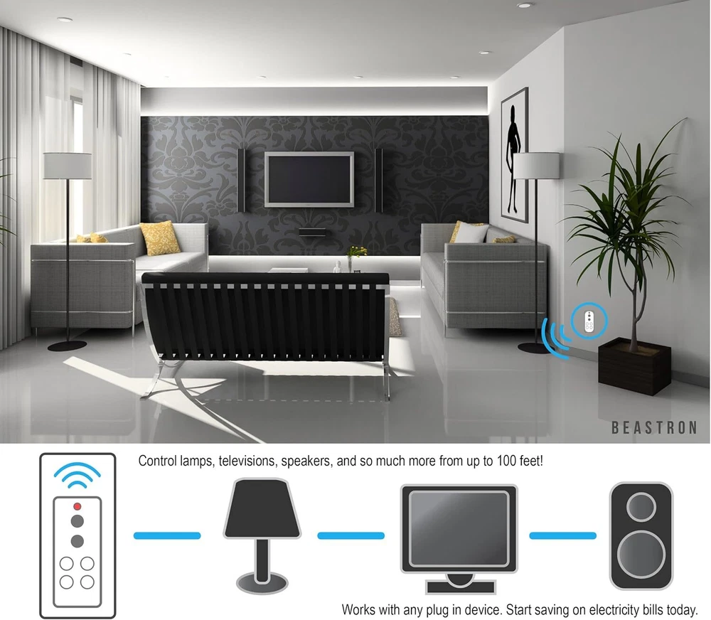 Remote Control Electrical Outlet Switch for Lights and Household Appliances with Build your smart home: learning functions allows you to programmer one outlet with more Remotes or one Remote with more outlets, extra remote control switch can be also purchased from Beastron and matched to existing units, build your smart home system. Home Appliance assistant: remotely control hard-to-reach appliances and devices from the comfort of your bed or sofa at the push of a button, A great assistant to the mobility impaired. Powerful signal & remote control: Strong RF signal works through doors and walls without interfering with other electronics, operating from as far as 100 ft. In line of sight Save energy & money: eliminate wasteful standby power and reduce energy use, Save on your electric bills and extend product life. Outlets remain off after a power outage to save your electricity bill up to 18% Multi-role: great with almost any Electronic device, including lights, air conditioners, heaters, Audio sound Systems, holiday decorations, charging devices, holiday decorations, coffee maker and radio Shipping We offer FREE shipping on all orders! We ship within Three business days of payment, usually sooner. Local pickups and combined shipping options are not provided at this time. Return You can return a product for up to 30 days from the date you purchased it. Any product you return must be in the same condition you received it and in the original packaging. Please keep the receipt. Payment We accept payment by any of the following methods: PayPal Please pay as soon as possible after winning an auction, as that will allow us to post your item to you sooner! Feedback Customer satisfaction is very important to us. If you have any problem with your order, please contact us and we will do our best to make you satisfied. Contact Us If you have any queries, please contact us via ebay. We usually respond within 24 hours on weekdays. Please visit our eBay store to check out other items for sale! Thank you for shopping at our store.