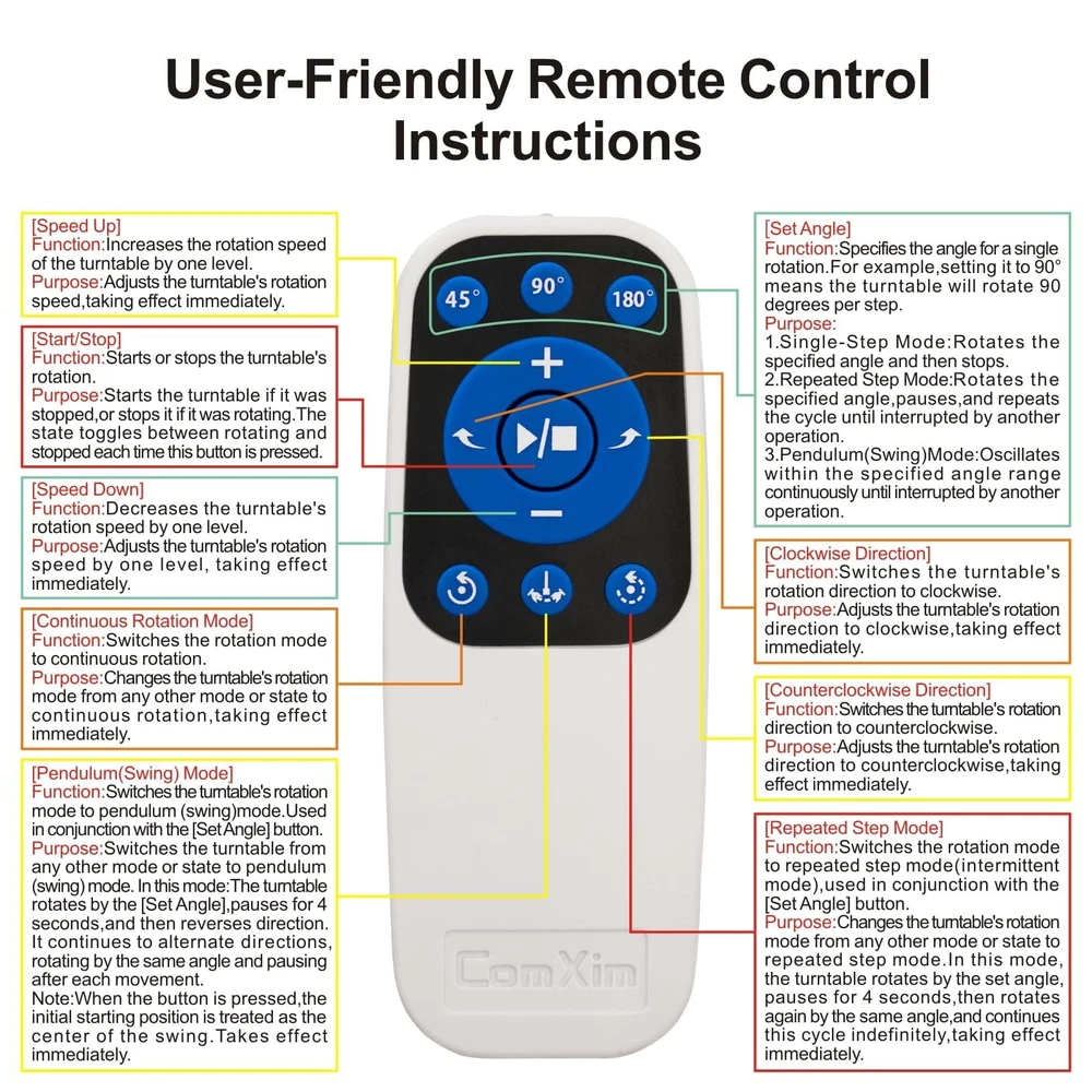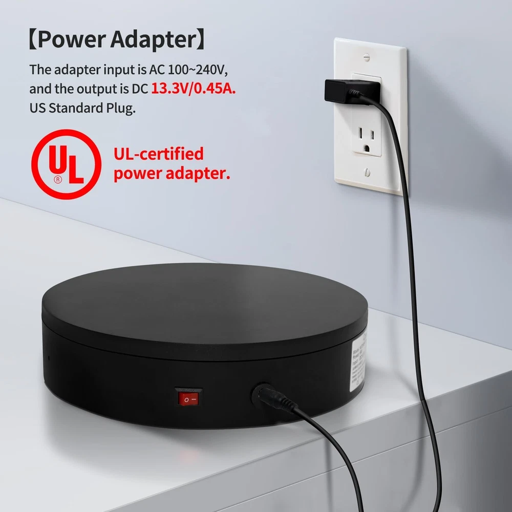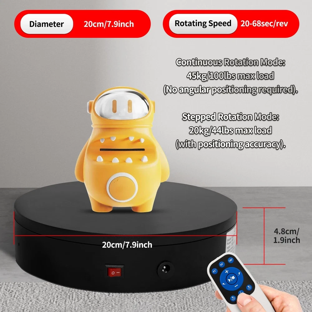 Multi-Rotation Modes: [Continuous Rotation Mode] [Single-Step Mode] [Repeated Step Mode] [Pendulum (Swing) Mode] Button Description: About [Set Angle] Function: Specifies the angle for a single rotation. For example, setting it to 90° means the turntable will rotate 90 degrees per step. Purpose: 1. Single-Step Mode: Rotates the specified angle and then stops. 2. Repeated Step Mode: Rotates the specified angle, pauses, and repeats the cycle until interrupted by another operation.< 3. Pendulum (Swing) Mode: Oscillates within the specified angle range continuously until interrupted by another operation. About [Speed Up]/ [Speed Down] [Speed Up]: Increases the rotation speed of the turntable by one level. [Speed Down] : Decreases the turntable's rotation speed by one level. About [Clockwise Direction] / [Counterclockwise Direction] [Clockwise Direction]: Switches the turntable's rotation direction to clockwise. [Counterclockwise Direction]: Switches the turntable's rotation direction to counterclockwise. About [Start/Stop] Function: Starts or stops the turntable's rotation. About [Continuous Rotation Mode] Function: Switches the rotation mode to continuous rotation.Purpose: Changes the turntable's rotation mode from any other mode or state to continuous rotation, taking effect immediately. About [Repeated Step Mode] Function: Switches the rotation mode to rotate-and-pause mode (intermittent mode), used in conjunction with the [Set Angle] button. About [Pendulum (Swing) Mode] Function: Switches the turntable's rotation mode to pendulum (swing) mode. Used in conjunction with the [Set Angle] button. 【360° Rotating Platform Max Load】: Max Loading range is 40~100lbs(20~45kg) - Continuous Rotation Mode: "45kg" max load(No angular positioning required). - Stepped Rotation Mode: "20kg" max load(With positioning accuracy). This rotating platform features a planar sliding bearing and adopts a gear meshing structure, ensuring extended rotational lifespan and smooth rotation. 【Specifications of this Display Platform】 Diameter: "20cm/7.9 inches." Rotation Speed Range: "Adjustable speed range of 20 to 68 seconds per revolution". Direction: "Supports clockwise and counterclockwise rotation". It utilizes 's soft-start and electric turntable chopper frequency conversion technology for speed regulation, guaranteeing stable load capacity across varying rotational speeds. 【User-Friendly Remote Control】This user-friendly remote control offers multiple rotation modes, including continuous rotation, single-step rotation, repeated step rotation, and pendulum (swing) rotation, making it versatile and easy to use for various applications. 【Continuous Rotation Mode】for Live Video Show.【Single-Step Mode】for Product Display and Live Demonstration.【Repeated Step Mode】 for Automated Product Display ,Multi-Angle Photography【Pendulum Mode】 for Automatic Product Display. This rotating display stand Supports remote control of four rotation modes: Continuous rotation. Single-step rotation at 45°, 90°, and 180°. Repeated step rotation at 45°, 90°, and 180°. Pendulum (swing) rotation at 45°, 90°, and 180°. Allows remote control for both clockwise and counterclockwise rotation. This Rotating Platform Supports remote control for start/pause and speed adjustment (increase/decrease). 【Excellent Structural Design】 The Rotating Platform is equipped with a flat thrust bearing inside, enabling it to support heavier loads. It features a high-precision reduction stepper motor (a type of brushless motor), offering high torque, long lifespan, stable rotation, quiet operation, and reliable performance. 【The Rotating Platform Application Scenarios】Widely used for 3D scanning, body scanning and modeling, product display, video shooting, product photography, 360-degree photography, and large-scale product displays both in-and online, such as clothing mannequins, Christmas trees, digital products, and household items. 【Power Adapter】The adapter input is AC 100~240V, and the output is DC 13.3V/0.5A. US Standard Plug. UL-certified power adapter. The electric turntable has passed the US FCC certification, EU CE and ROHS certification.