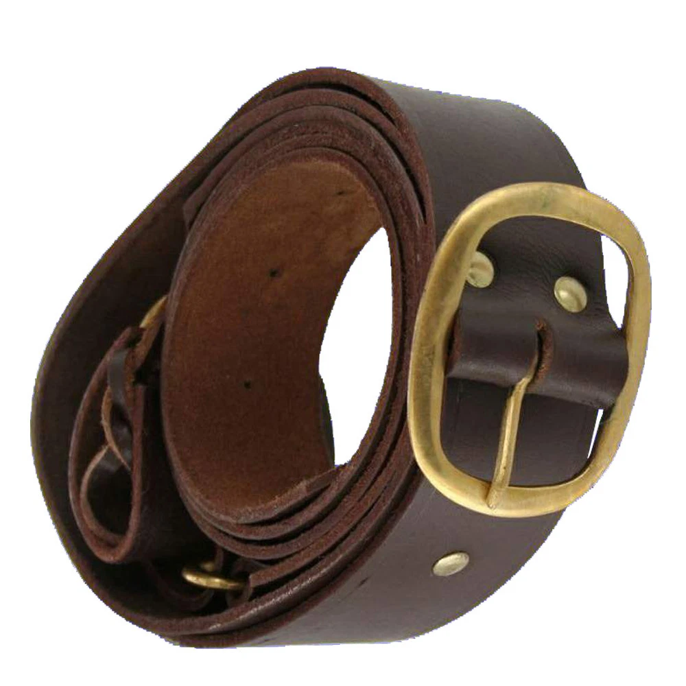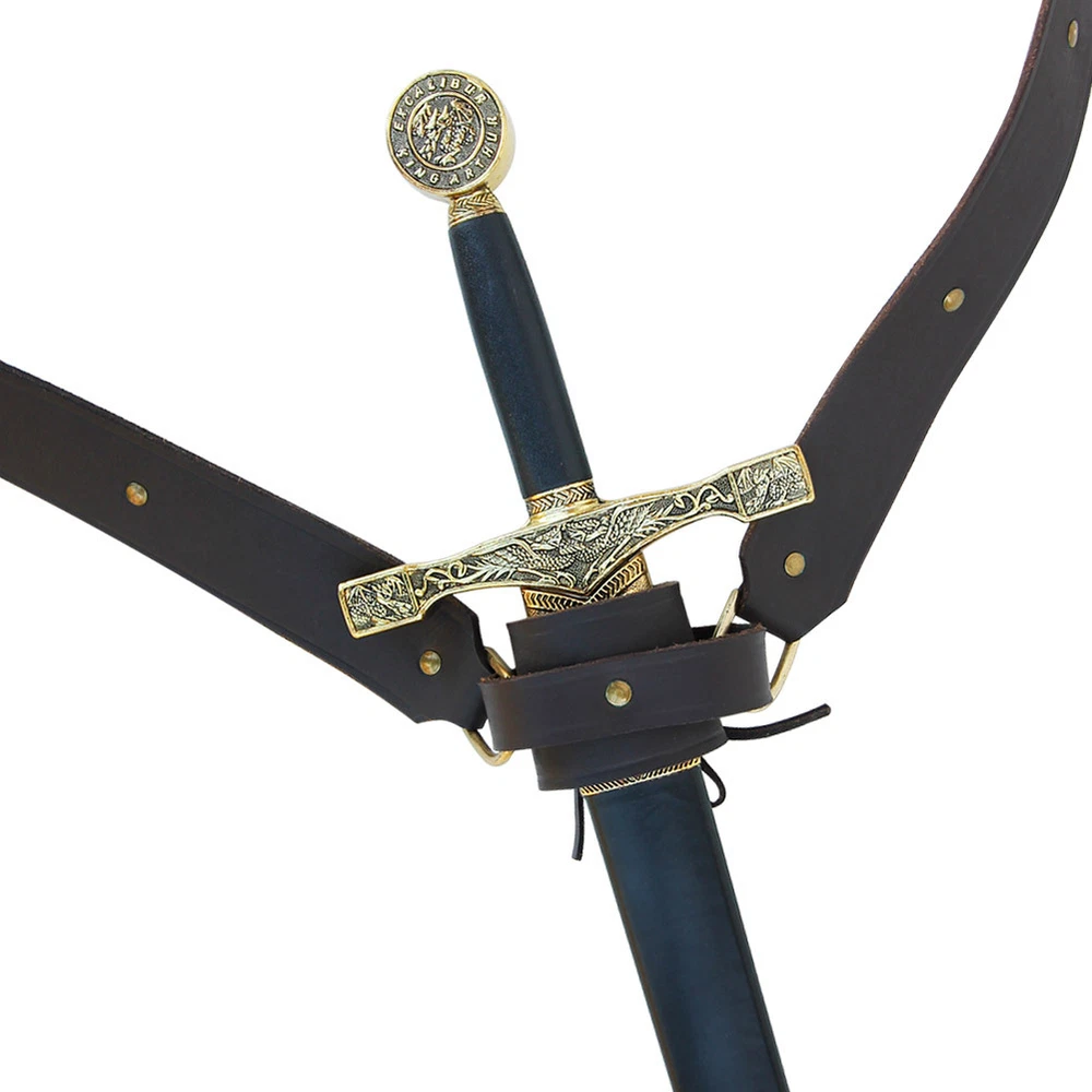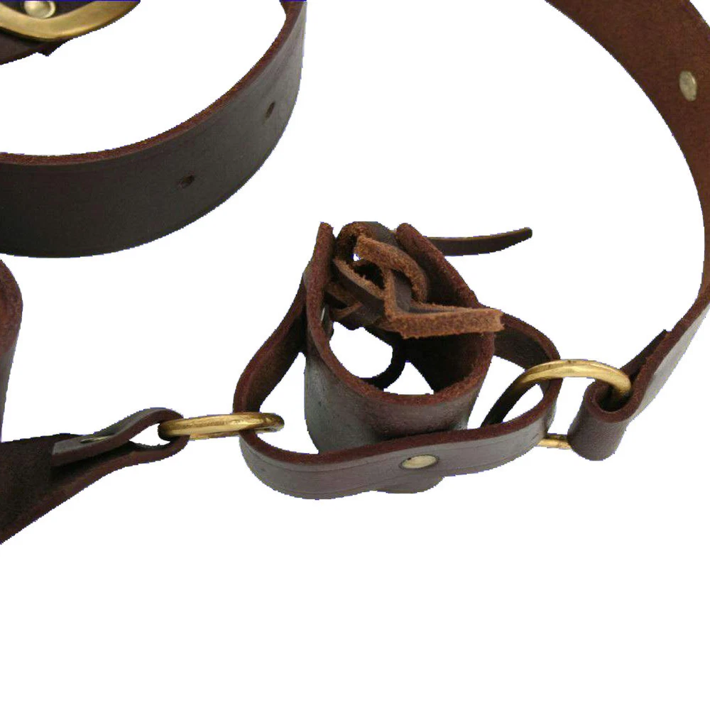 Experience comfort and authenticity with our Medieval Knights Templar Double Belt Sword Leather Frog. Designed for sword enthusiasts, this double wrap belt distributes the weight of your sword for added comfort. Crafted from thick, durable raw hide leather for long-lasting use. Wide 2-inch straps adorned with brass rivets for an authentic medieval look. First strap measures 44.1 inches, and the second strap is 37.4 inches, providing a secure fit. Solid brass buckle ensures the adjustable strap stays in place during wear. Period-accurate design suitable for pairing with various swords, from broadswords to daggers. Adjustable leather sword frog offers versatility and comfort, ideal for medieval and renaissance enthusiasts. A practical and stylish accessory that enhances your historical costume or reenactment outfit. Embrace the comfort and tradition of double wrap belts – a smart investment for sword enthusiasts. Since early B. C. era double wrap belts were used to hold a sword. The weight of a sword can often burden the hips, the double wrap belt frog is the comfortable solution. The belt is made of thick leather raw hide for durability. The straps are nearly 2 inches wide and sport brass rivets across the whole length. The first strap is 44.1 inches, the second strap is 37.4 inches. The buckle itself is solid brass and holds the adjustable strap securely. Period accuracy is emphasized to make this belt genuine. You can proudly wear it with nearly any sword. The leather sword frog is adjustable and can fit wide broadswords and short swords or daggers. This was popular in the medieval and renaissance periods but used long before by the Celts. It is much more comfortable than traditional belts. A smart investment indeed. Experience comfort and authenticity with our Medieval Knights Templar Double Belt Sword Leather Frog. Designed for sword enthusiasts, this double wrap belt distributes the weight of your sword for added comfort. Crafted from thick, durable raw hide leather for long-lasting use. Wide 2-inch straps adorned with brass rivets for an authentic medieval look. First strap measures 44.1 inches, and the second strap is 37.4 inches, providing a secure fit. Solid brass buckle ensures the adjustable strap stays in place during wear. Period-accurate design suitable for pairing with various swords, from broadswords to daggers. Adjustable leather sword frog offers versatility and comfort, ideal for medieval and renaissance enthusiasts. A practical and stylish accessory that enhances your historical costume or reenactment outfit. Embrace the comfort and tradition of double wrap belts – a smart investment for sword enthusiasts. Since early B. C. era double wrap belts were used to hold a sword. The weight of a sword can often burden the hips, the double wrap belt frog is the comfortable solution. The belt is made of thick leather raw hide for durability. The straps are nearly 2 inches wide and sport brass rivets across the whole length. The first strap is 44.1 inches, the second strap is 37.4 inches. The buckle itself is solid brass and holds the adjustable strap securely. Period accuracy is emphasized to make this belt genuine. You can proudly wear it with nearly any sword. The leather sword frog is adjustable and can fit wide broadswords and short swords or daggers. This was popular in the medieval and renaissance periods but used long before by the Celts. It is much more comfortable than traditional belts. A smart investment indeed.