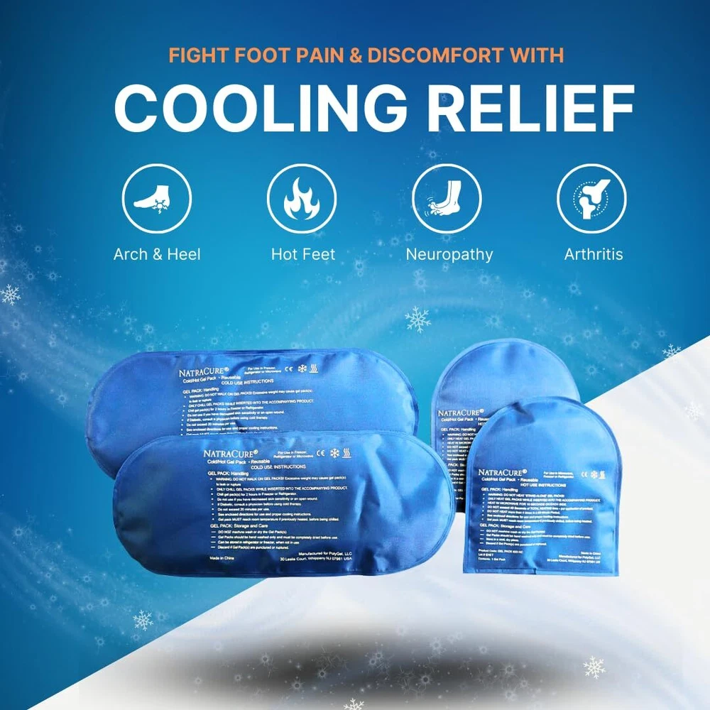 This set of Replacement Gel Packs is designed to work with all sizes of our Cold Therapy Socks and Cold Therapy Compression Socks. Full Description As each treatment ends, your Cold Therapy Socks will return to room temperature. Use this set of extra gel packs to extend the duration of your treatment. The full-foot length gel pack is designed to sit below each foot.¬ For added relief, there's an additional half-size gel pack that can be placed either over the toes or behind the heel. Store in freezer or refrigerator inside of cold therapy socks or in a plastic bag May also be heated in microwave for heat therapy treatment as needed Additional instructions printed on gel packs. Keywords used to find this product include: kids ice packs for boo boos, tonsillectomy recovery, medical ice packs reusable, kid ice packs blue ice packs, gel cold packs reusable soft, long lasting ice packs for injuries, cold pads for pain relief, toddler ice pack, medical grade ice packs, ice pads for back pain, moldable ice packs for injuries reusable, c section ice pack, vaginal ice pack, physical therapy ice packs, ice packs for breast surgery recovery, ice packs for headaches, frozen peas ice pack, reusable ice packs for kids, ive pack, flat ice packs for injuries, sports ice packs for injuries, throat ice pack for tonsillectomy, cervical cold pack, medical ice packs flexible, ice packs for kids injuries. 4 Piece Set: 2 full-length and 2 half-size replacement gel packs for Cold Therapy Socks. Use instead of reusable ice bag r competing refreezable ice packs. Double the duration of your session by simply including an additional set of frozen ice packs. Store them in the freezer and make the switch when the original set reaches room temperature. Each soft gel ice pack has a low profile, thin design to fit easily inside your cold therapy socks. Use for foot pain, plantar fasciitic, heel pain, toe pain and more. Kids Ice Packs too - Each gel cooling pad can also double as boo boo ice packs for kids. Just store them in the freezer and they're instant ice packs for injuries. Multi-use - Each icepack has man uses: as a jaw ice pack, hand ice pack, headache ice pack, ice pack for kids, vasectomy ice packs, cooling packs for body or cervical ice pack.