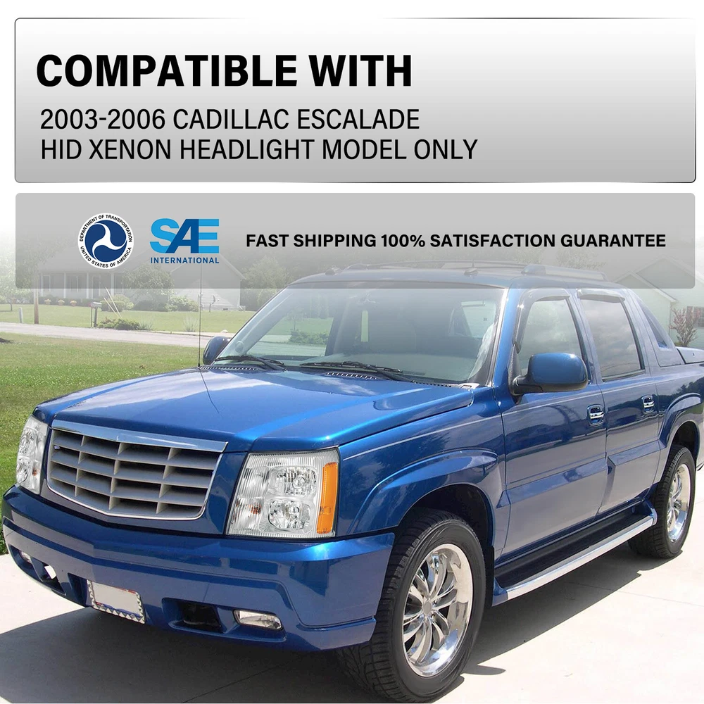 For 2003-2006 Cadillac Escalade HID Xenon Headlights Chrome Headlamp w/Bulbs L+R Product Description Description: 1 00% Brand Ne w Perfect replacement or upgrade for factory headlights Comes with a complete set of headlights (driver and passenger side) Designed for safe and enjoyable driving. With this easy headlight upgrade, you can drive more safely and see more clearly in the darkness, bad weather, and low-visibility areas. Installation instruction is NOT Included. Professional Installation is highly recommended. Requires no modification or drilling Condensation DOES NOT Mean A Product Problem It's normal that the condensation appears inside the headlights because of temperature differences, air pressure, etc, thus it does not mean headlight malfunction. How to Remove Temporary Condensation Way 1. Check if the vents are blocked and switch on the low beam light for about 20 mins Way 2. Take the headlight bulb out and drive out moisture Way 3. Put a silica gel packet in the housing to soak up moisture Compatible with: 2003-2006 Cadillac Escalade HID XENON Models Package Includes : 1 Pair of Headlights (Includes all bulbs e xcept low beam bulbs) Payment Policy Shipping Policy Returns Policy Important Notice Contact us Payment Policy We accept PayPal (Recommended) and all forms of Credit Card, Mastercard, Visa, American Express, Discover. All payment are expected within 7 days after the last winning auction is closed. We reserve the rights to file Non-Paying Bidder Alert if the payment is not received 7 days after the auction ended. Shipping Policy Domestic Shipping rates apply to all 48 contiguous states. We don’t support to PR, HI, AK, GU and PO Box addresses shipping. Some of the packages cannot be delivered to a PO Box. Customer is responsible to ensure physical address given is deliverable by the shipping company. Package will be held until a valid physical address is provided. All tracking information will be updated within 1-2 business days. Returns Policy 30 Days Returns, please notify us within 30 days after you've received your purchased item. All return requests must be submitted through your eBay account. Important Notice Very Important: Please double check shipping address before ordering. We are not responsible for any changed of address after item has been shipped. Contact us Before leaving us neutral or negative feedback, please contact us first. We will do everything we can to give you a satisfying solution. Copyright © 2023 Dianxiaomi