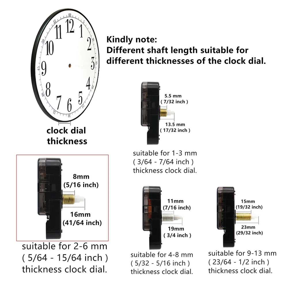 Replacement Quartz Clock Movement Mechanism Motor & Metal Hands & Fittings Bullet Points: With Metal Hook: Tailored for larger wall clocks, our high torque clock mechanism replacement effortlessly drives metal hour and minute hands up to 207mm with a sturdy metal hook for secure installation. Easy Fix: Revive your large wall clocks effortlessly with this clock mechanism replacement suitable for panels 5-8mm thick and a total shaft length of 16mm. With a moderate size and thread height of 8mm, this seamless replacement is perfect for easy installation. Precision Engineered: Ensuring seamless integration, this clock mechanism replacement fits perfectly for 40-50cm wall clock panels, enhancing both aesthetics and functionality with its ideal size and hand lengths of 172mm and 207mm. Quick and Painless: Our clock mechanism replacement boasts a straightforward installation process. Follow the included instructions and keep the hands parallel—no professional tools required and no need for excessive pressure. Widely Used: Ideal for handcraft enthusiasts and professional watchmakers alike, this clock mechanism replacement provides a seamless installation process, ensuring your timepieces for home or public spaces maintain their punctuality with a stylish, modern touch. This battery clock replacement mechanism features high torque and a moderate size to easily fit most clock designs. With a minute hand length of 207mm and an included instruction manual, it's easy to install. Perfect for a variety of occasions, upgrade your clocks effortlessly! Specification: Product name: clock mechanism replacement Material: Aluminum + ABS Product Size: about 56x56x16mm/2.2x2.2x0.63 inches Hour hand: about 172mm/6.77 inches Minute hand: about 207mm/8.15 inches Total axis length: about 16mm/0.63 inches Thread height: about 8mm/0.31 inches Applicable panel diameter: about 40-50cm/15.75x19.69 inches Packing List: Clock mechanism replacement x1 set Note: 1. Due to the different display and lighting effects, the actual color of the product may be slightly different from the color shown in the picture. Thanks! 2. Due to manual measurement, a measurement deviation of 1-3cm is allowed. 1.You can make a Credit payment via Paypal.Paypal will let you use MasterCard,Visa to pay. 2.Payment should be completed within 5 days after auction closed, or unpaid dispute will be filed for an closing auction.An unpaid case will be filled after 4 days. ● We strive for 100% customer satisfaction ! ● Positive Feedback is very important to us. ● We hope that you contact us immediately BEFORE you give us neutral or negative feedback, so that we can satisfactorily address your concerns. ● We promise to offer the lowest price and high quality produce. Dear buyers : ● Welcome to my store ! ● Your satisfaction is our top goal,we appreciate your patronizing. ● If you have any questions, please contact us before leave negative or neutral feedback, we will try our best to solve the issue to your satisfaction, thanks ! ● If you are satisfied with our service, please rate the details of the transaction (Detailed Seller Ratings) on eBay. ● Please always talk to us via ebay Message. ● We appreciate your business and look forward to growing our e-Bay sales with satisfied customers.