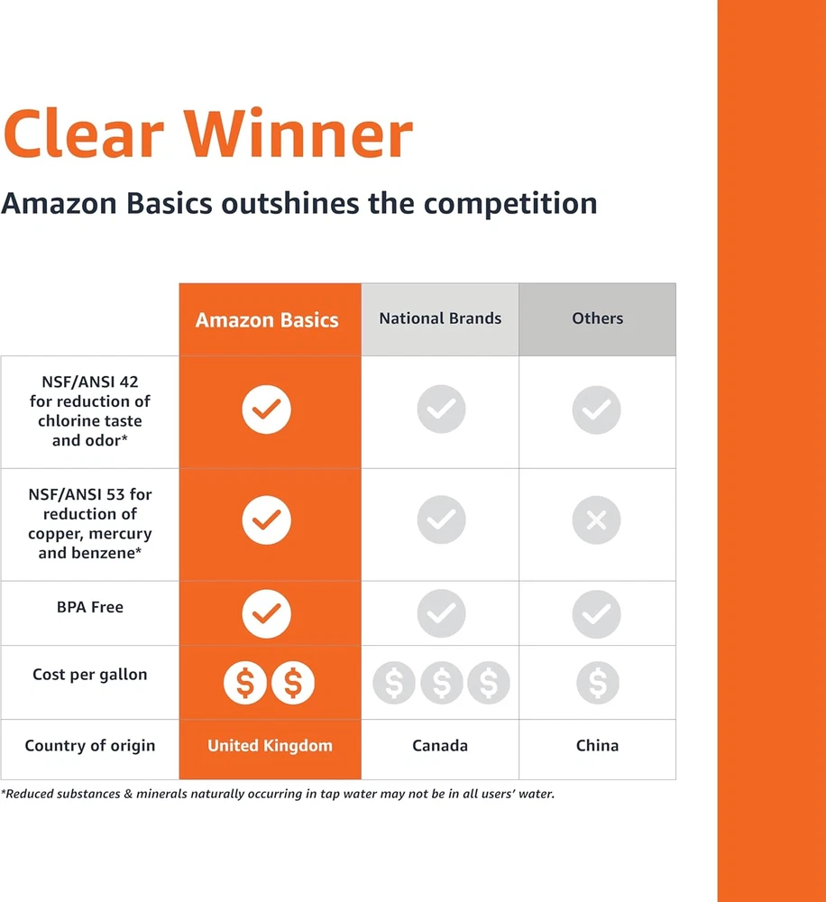 Key Features: Universal Compatibility: Fits Amazon Basics and all Brita pitchers and dispensers, excluding Brita Stream. Great-Tasting Water: Multi-stage filtration technology removes chlorine taste, odors, and impurities, providing fresh water for 40 gallons or about 2 months. Certified Quality: WQA certified to NSF/ANSI 42, 53, and 372 standards, effectively reducing contaminants like copper, mercury, and benzene. Eco-Friendly Choice: Each filter replaces 300 single-use plastic bottles, helping reduce waste and save money. Made in Europe: Quality craftsmanship, lead-free and BPA-free, ensuring reliable, clean water with no pre-soaking needed. Product Description: Upgrade your hydration routine with Amazon Basics water filters, compatible with Brita and Amazon Basics pitchers. NSF/ANSI certified to reduce contaminants and made in Europe, each filter provides clean, refreshing water for up to two months. Save money, reduce plastic waste, and enjoy crisp water without black bits or pre-soaking requirements.