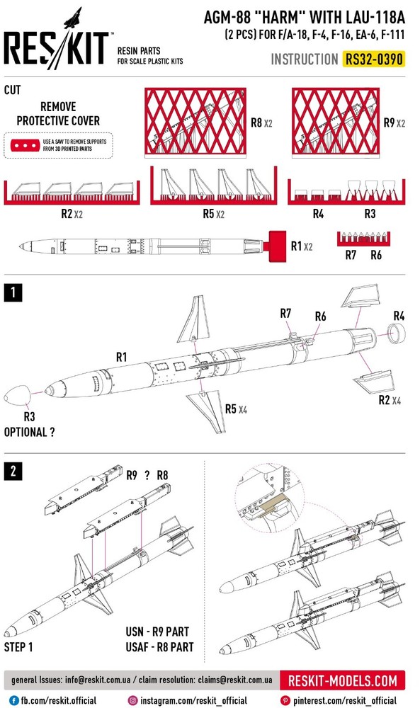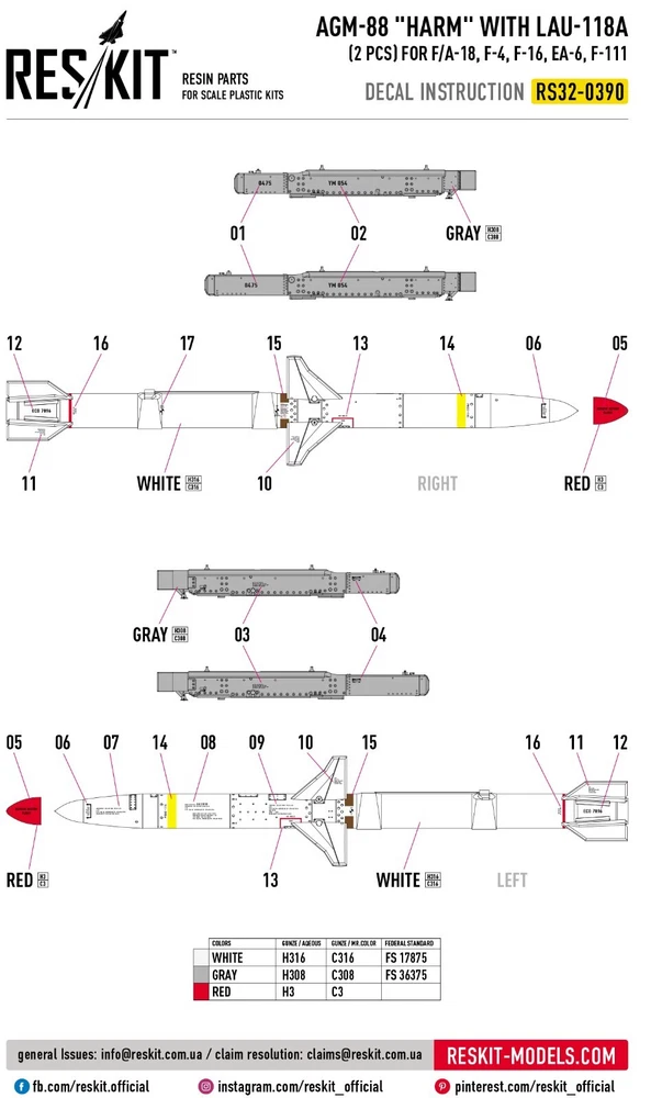 Scale: 1:32 Manufacturer: RESKIT Country/Region of Manufacture: Ukraine High-quality details. Paint: Unpainted, Unassembled, Kit do not contain paints and glue. Condition: New in Box Features: Kit AGM-88 "HARM" MISSILES WITH LAU-118A (2 PCS) (F/A-18, F-4, F-16, EA-6, F-111) (1/32) RESKIT - Accessories for Scale Plastic Kits SPECIFICATION Scale: 1/32 Type of product: Arms and weapons Recommended kit: Any AGM-88, HARM, LAU-118A, F/A-18, F-4, F-16, EA-6, F-111, AGM88 Quality set, simple assembly. Suitable for experienced modelers, as well as for beginners. Due to the use of modern production technologies, all the details of the model fit perfectly, thanks to this, you can get an excellent result with minimal effort. ----------- This is a plastic model kit. Assembly and painting is required. Paint and glue is NOT included. Item Type: Scale model kit Commodity Attribute: Assembly The model is a plastic assembly model and needs to be assembled and painted by yourself You need an extra purchase of the glue, paint and so on!
