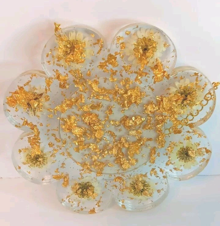 This adorable resin mirror measures 6" in diameter and is decorated with white daisies and gold flakes. Please see all photographs as they are part of the description. Shipped with USPS Ground Mail. CB999