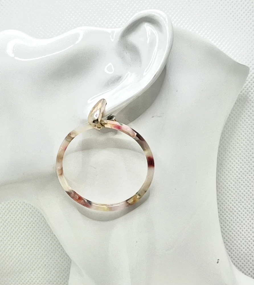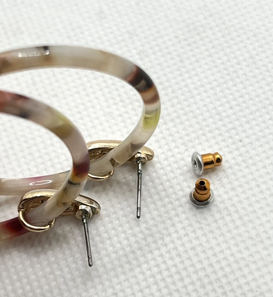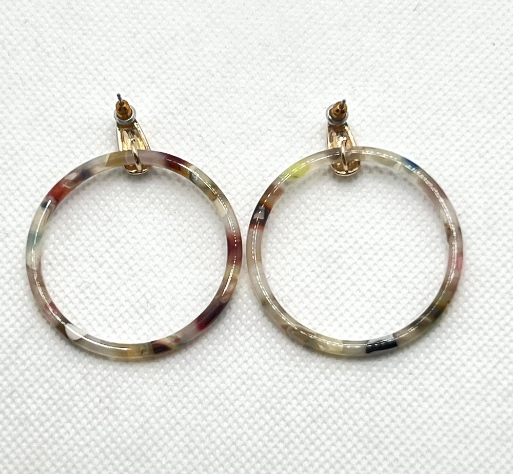 Add a touch of beauty and fashion to any occasion with these stunning resin hoop earrings. The earrings feature a push back closure and come in a multicolor design that is sure to catch the eye. Perfect for any fashion jewelry collection, these earrings are made from high-quality resin and are sure to last. Whether you're dressing up for a special occasion or just want to add a pop of color to your everyday look, these earrings are the perfect accessory. With their unique design and beautiful multicolor finish, they are sure to make a statement. Note: This pair of earrings are very lightweight in great condition! Worn only once! Thank you for stopping by!
