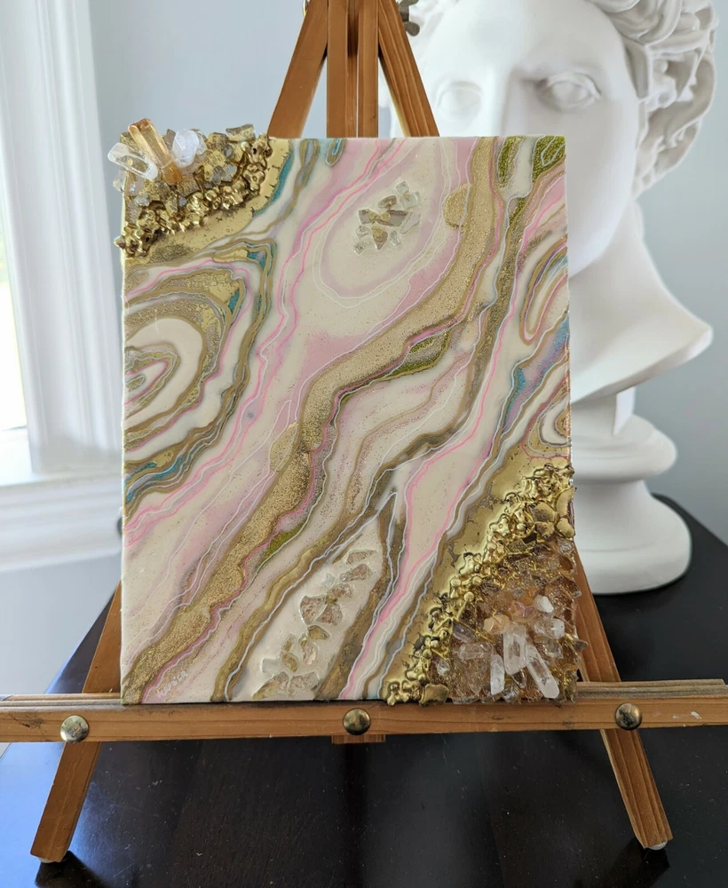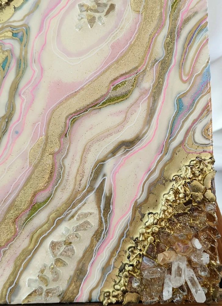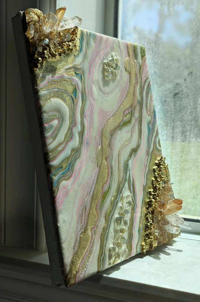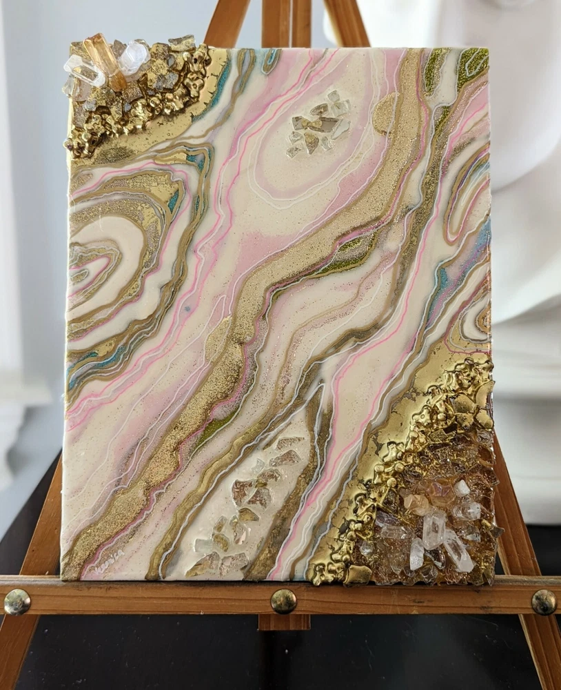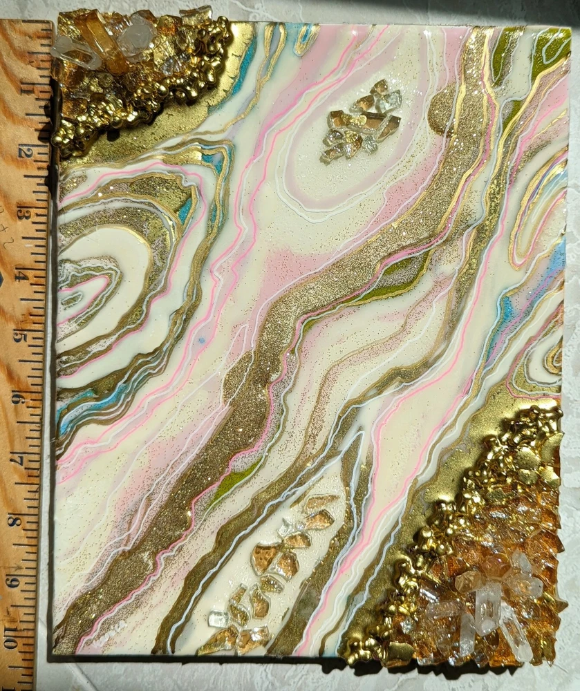 This is a very unique resin art painting that makes a great gift. It features glass and quartz crystals and beautiful colors that shine and sparkle. Shipped with USPS Mail. Beautiful one of a kind resin art painting on canvas panel mounted on canvas. Look at all images. Glear, shiny surface with glitter sparkle. Beautiful soft colors of pink, white and gold with fractions of light blue. Size: 8x10" inches. Quite heavy because of 3 layers of resin, glass and crystals!!! See images for close ups and texture details of the painting. Wired on the back.