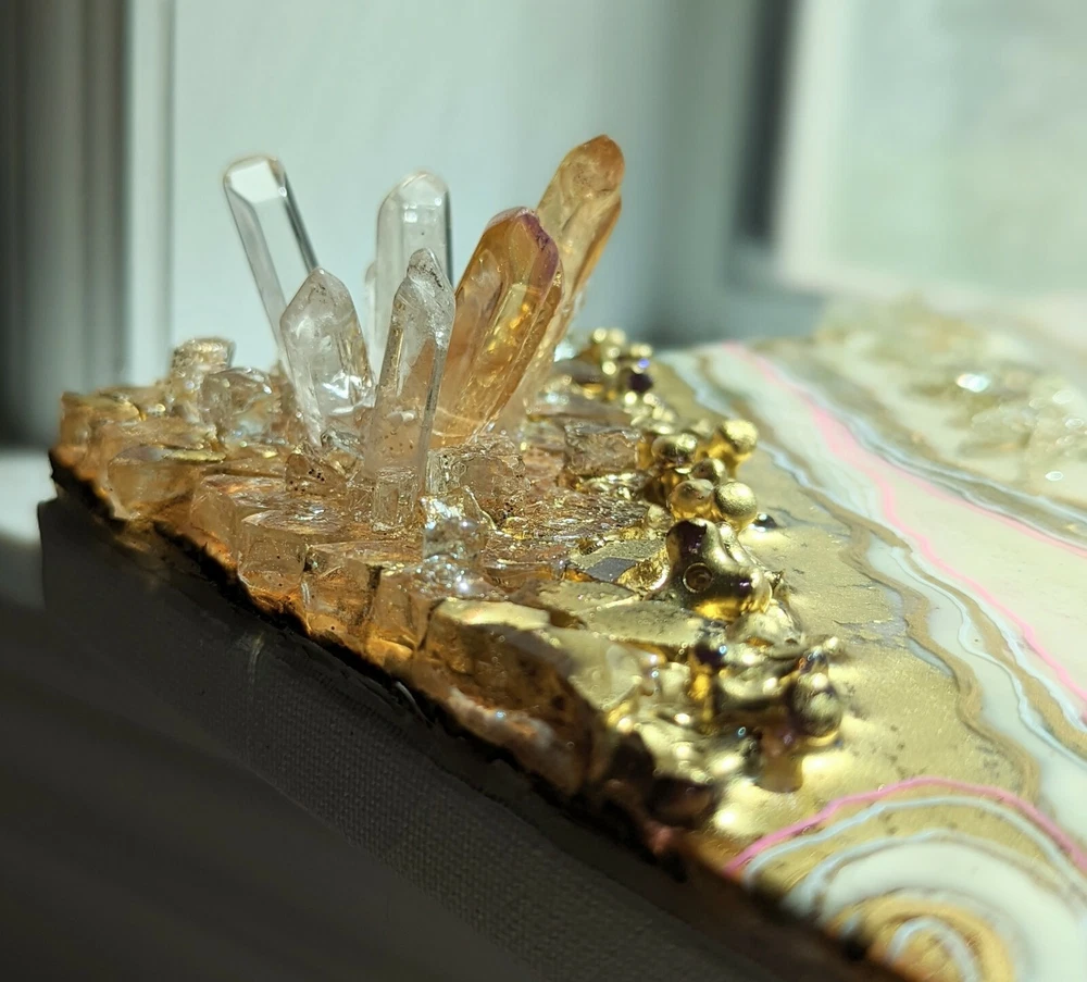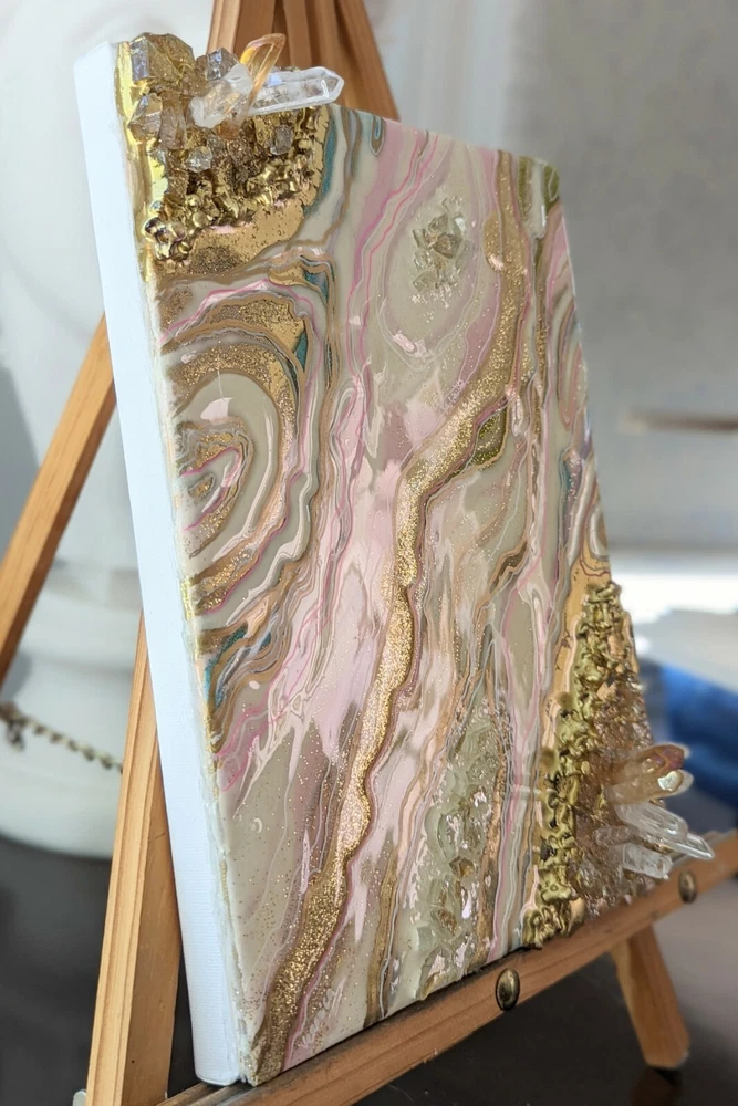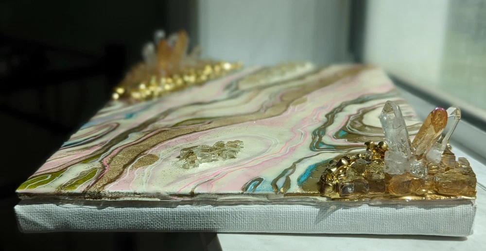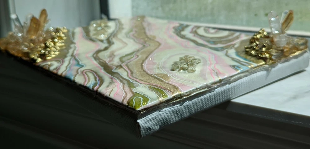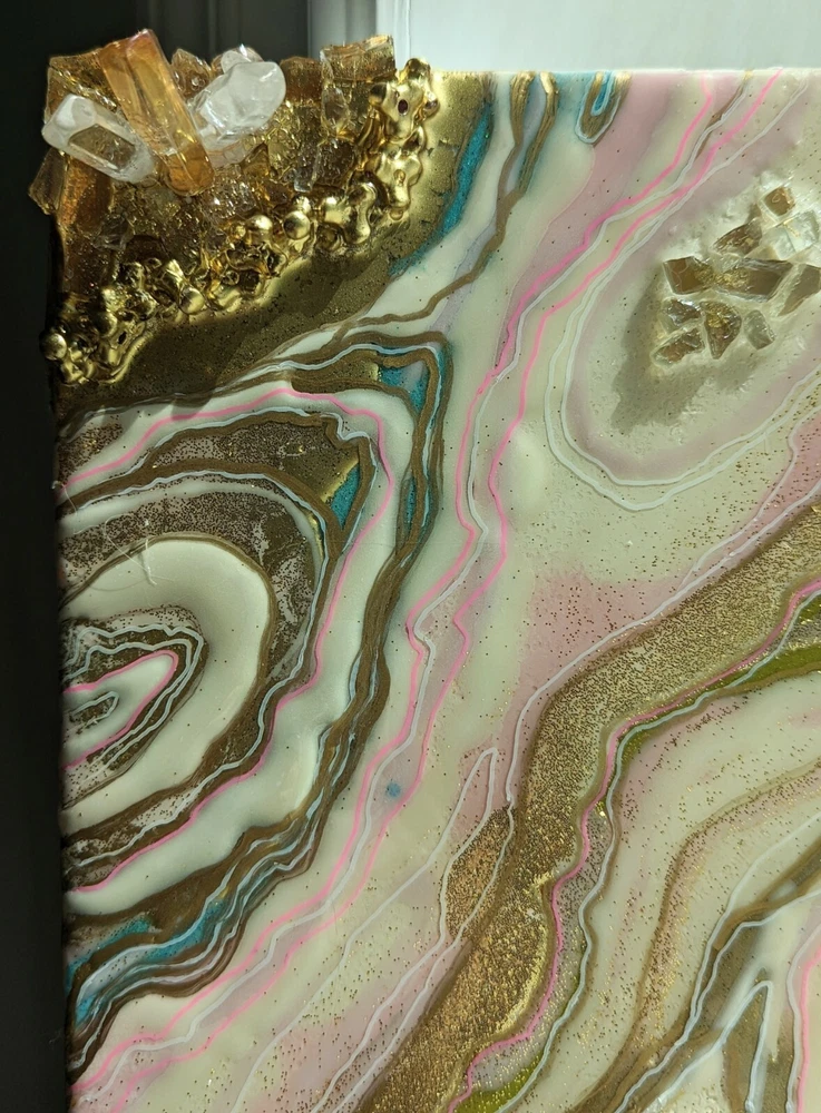 This is a very unique resin art painting that makes a great gift. It features glass and quartz crystals and beautiful colors that shine and sparkle. Shipped with USPS Mail. Beautiful one of a kind resin art painting on canvas panel mounted on canvas. Look at all images. Glear, shiny surface with glitter sparkle. Beautiful soft colors of pink, white and gold with fractions of light blue. Size: 8x10" inches. Quite heavy because of 3 layers of resin, glass and crystals!!! See images for close ups and texture details of the painting. Wired on the back.