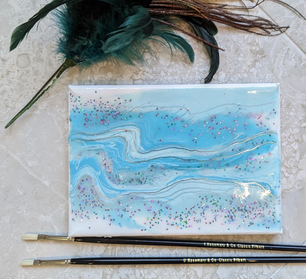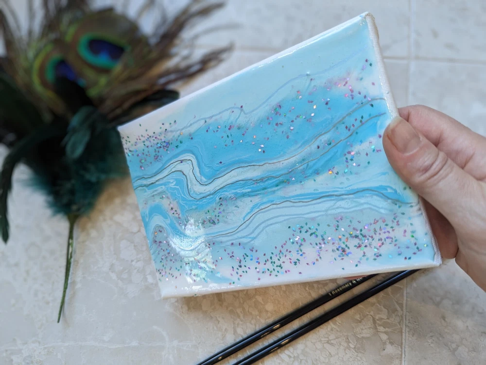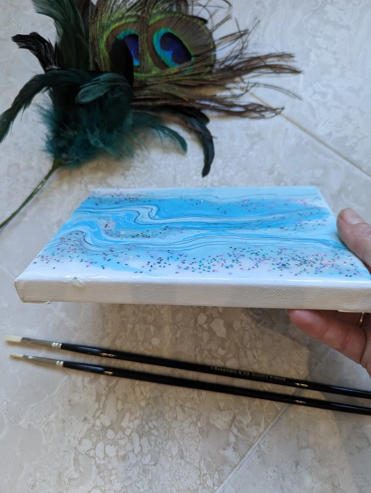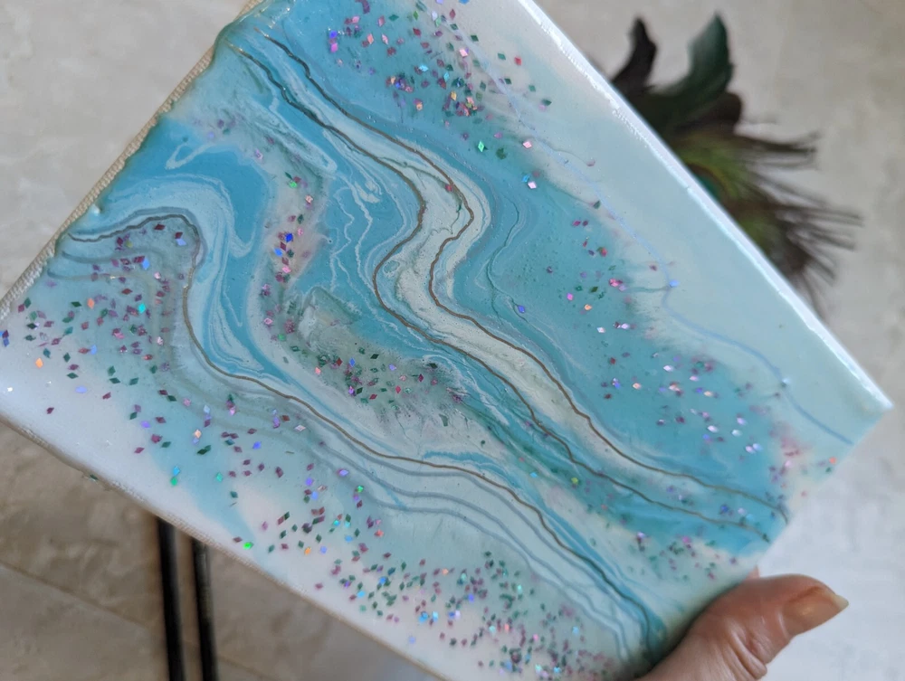 This is a very unique resin art painting that makes a great gift. It features paint with silver chrome marker and beautiful colors that shine and sparkle. Shipped with USPS Mail. Beautiful one of a kind resin art painting on canvas. Look at all images. Shiny. sparkly. Turquoise and white colors. Size: 5x7inches. Quite heavy because of 3 layers of resin, glass and crystals!!! See images for close ups and texture details of the painting. No frame! The frame in the photo is for context only.