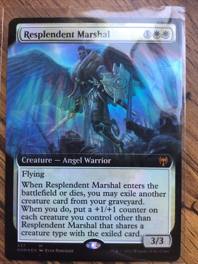 This Mythic Rare creature card from the Kaldheim set of Magic: The Gathering features stunning Extended Art and a foil finish. The Resplendent Marshal is a powerful addition to any deck, with its ability to enhance the abilities of other creatures on the battlefield. This card is in English and manufactured by Wizards of the Coast. As a collector's item, this card is a must-have for any fan of Magic: The Gathering. Its rarity and unique features make it a valuable addition to any collection. Whether you're a seasoned player or just starting out, the Resplendent Marshal is sure to impress. Don't miss your chance to own this remarkable card.
