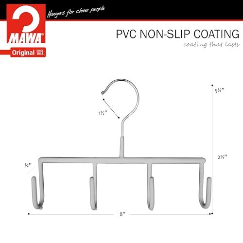 In 1948 Martin Wagner had the vision to manufacture the best clothes hanger in the world. That dream became a fully automated manufacturing process that combines specialized machinery, professional designers/engineers, and experienced sales staff. pioneered the market with patented technology such as turn able hooks, anti-slip coating, and clip hangers. delivers 100% "Made in Germany" clothes hangers to 58 countries to ensure high quality materials and designs are offered throughout the world. Managing director, Michaela Schenk has made consumer safety her top priority. All materials used for production can be recycled and water consumption in the manufacturing process has been reduced by 80%. is and certified in accordance with Germany's strict ecologic standards. The culmination of European standards and dedication to high standards, results in a product which is not hazardous to the customer or planet. The belt hook features 4 non-slip hooks and a rotating hanger hook for easy accessibility. The hooks can hold multiple items making closet organization accessible and uniform. Your clothes do not need to suffer, and neither does your wallet. Take care of your clothes by using the line of hangers. Save space, get organized and treat your garments & yourself with the utmost care. Set of 5 light and thin belt or accessory hanger with four non-slip hooks; measures 8" x 6" in white Holds multiple items on non-slip coated hooks for optimum closet organization Made from German cold-rolled steel for durability and strength; modern shape allows to see each item while hung creating a uniform look Space efficient design maximizes closet space by as much as 40 percent; hook measures 1 1/2" wide Non slip coating is non-and keeps clothes on the hanger and clothes hang uniformly to create an even look, patented swivel hook