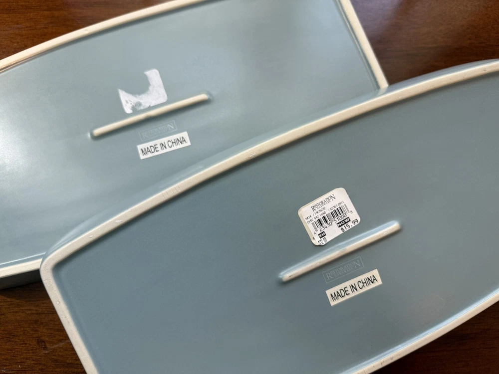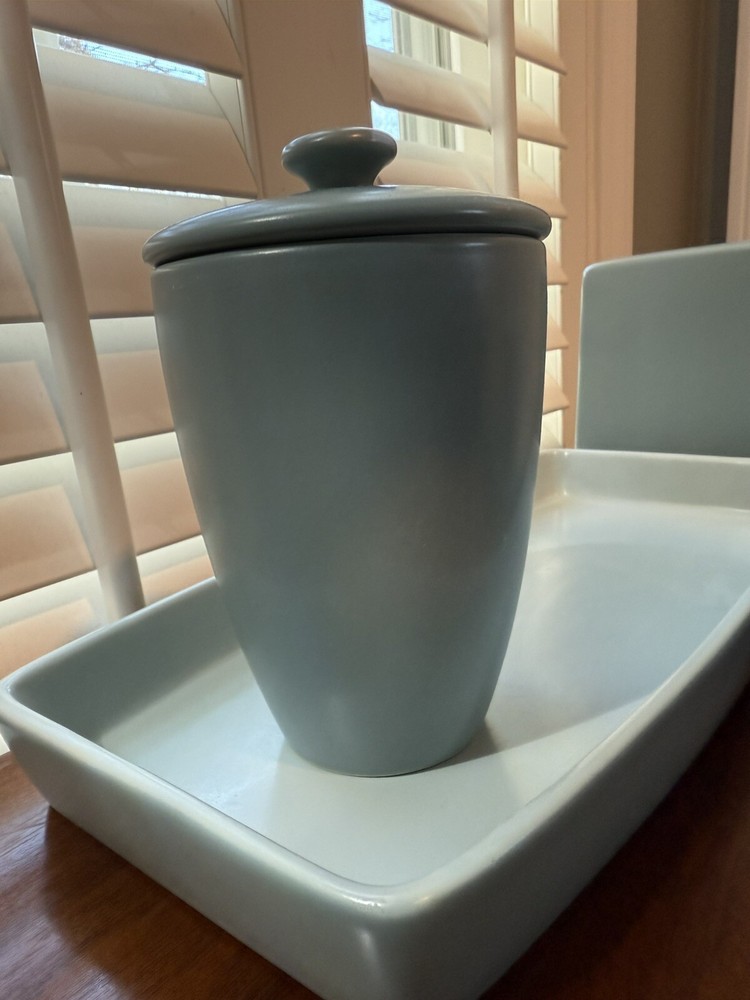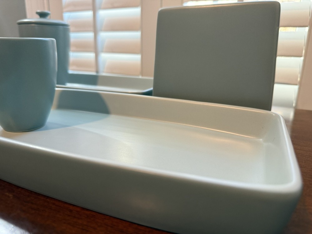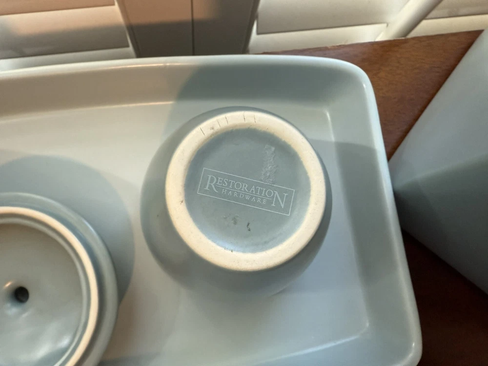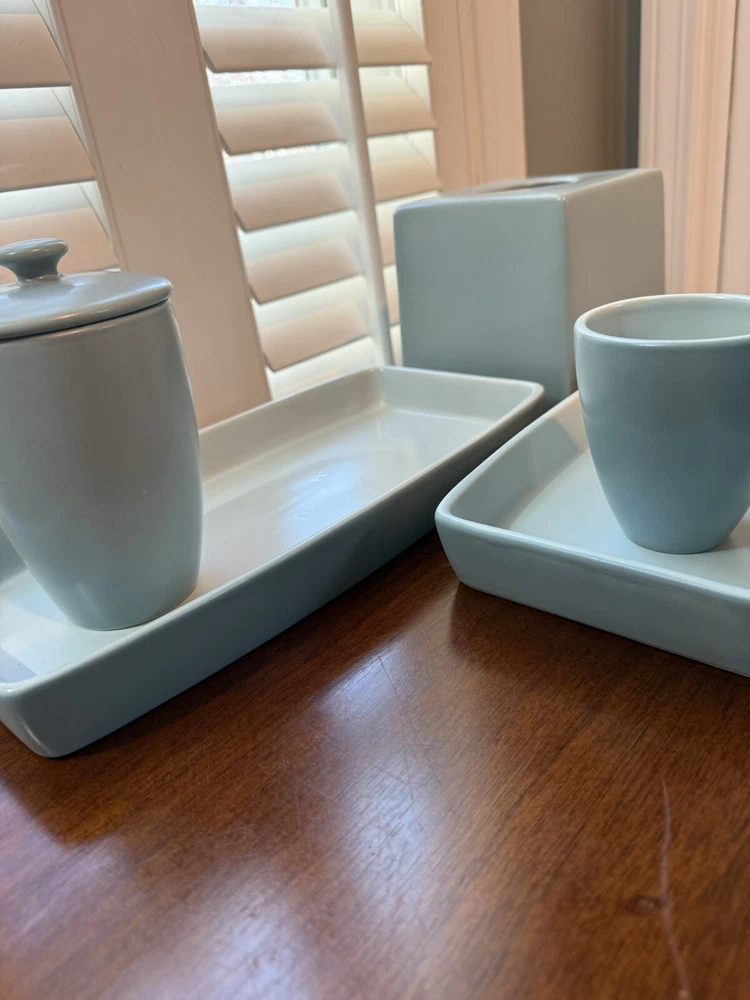 6 Piece Restoration Hardware Bath Vanity Set. The set includes a lidded jar for storing small items, tissue box cover, cup and a set of trays for displaying on your vanity top. Gorgeous clean lines and gentle edges. Two Trays: Both are 13”x6.75” Tissue Box cover is 5.75x5.75x5.50” Jar with Lid is approx 5”H Cup is 3.75”H