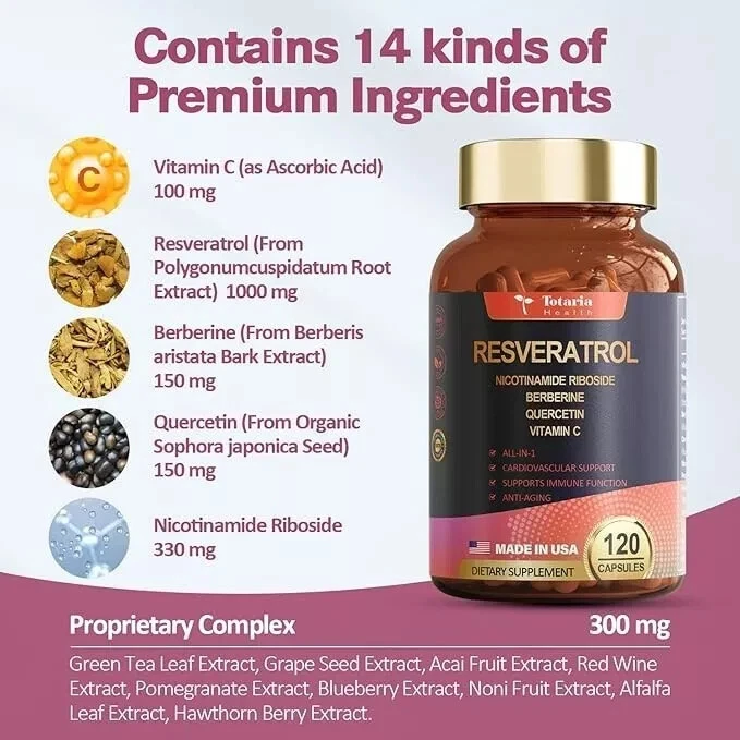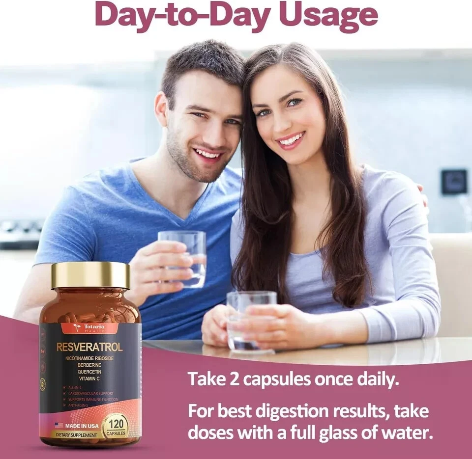 Resveratrol 8000mg Extra Strength with Berberine Quercetin Green Tea Extract ... SOURCE OF ANTIOXIDANT- Our product takes Berberine Powder Extract and Resveratrol Nutritional Supplements and combines them with a Quercetin Supplement,Nicotinamide Ribosideand Grapeseed Extract and the results are amazing. In addition,we added Vitamin C,Acai Fruit Extract, Red Wine Extract,Pomegranate Extract,Blueberry Extract,Noni Fruit Extract,Alfalfa Leaf Extract,Hawthorn Berry Extract. This powerful formula supports immune function and cardiovascular health,Rejuvenate you and radiate your energy HIGHLY BIOAVAILABLE FORMULA-Our ingredients come from sources rich in polyphenols -- equivalent of 8000mg Resveratrol from the PolygonumCuspidatum Root Extract,equivalent of 4000mg Quercetin flavonoids from organic Sophora Japonica, equivalent of 3000mg Berberine from Berberis aristata Bark Extract.And,Green Tea Leaf Extract,Grape sed Extract,Acai Fruit Extract,Vitamin C full of potent polyphenols, In one complex.which helps with anti-aging,overall health and immune system. CONCENTRATED TRANS-RESVERATROL-Revitalize your health with Trans-Resveratrol complex, your daily dose of heart health and longevity. A powerful antioxidant that protects your cells, supports cardiovascular health, and promotes a longer, healthier life. Perfect for those looking to enhance their well-being naturally, this supplement helps combat oxidative stress and maintain vital functions. Embrace the path to a vibrant future with our potent, heart-friendly formula. HIGH-QUALITY :Totaria Resveratrol complex Plus is formulated with high-quality all-natural ingredients with no fillers or binders of any kind. It is vegan-friendly and non-GMO and contains no artificial colors, no artificial flavors, gluten, soy, or dairy items. Complete care has been taken to ensure optimal nutrient retention. SUGGESTED DOSE:Take 3 veggie capsules daily, preferably in the morning, suitable for adult men and women. Our capsules are easy to swallow and digest. Do not exceed the recommended dose and consult with a physician before consuming. Do not consume if you are allergic to any of the ingredients. Contact us We can be contacted at any time through eBay messages if you have any questions, comments or product requests. We will respond to you within 24 hours and do our best to help you out! We encourage our customers to contact us with any questions or concerns! We'd like to be sure you are completely satisfied with your purchase.