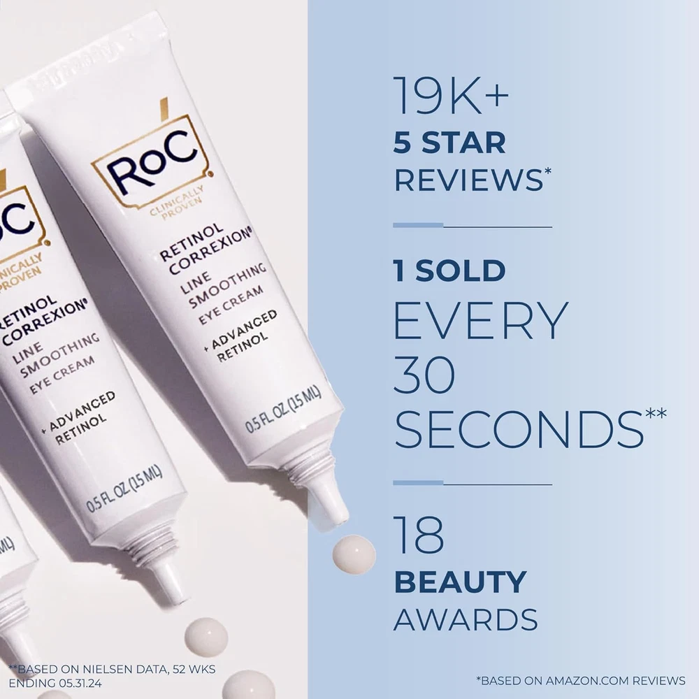 RETINOL EYE CREAM: Address the 3 key signs of eye aging—puffiness, dark circles & wrinkles—with 1 hard-working cream that's clinically proven to visibly rejuvenate the delicate skin around the eyes. PROVEN RESULTS: With pure RoC Retinol & our exclusive mineral complex, this hypoallergenic cream was designed for dramatic results but gentle enough for daily use. Make your eyes look 10 years younger. ANTI-AGING FORMULAS: Whether you're looking for a solution for deep wrinkles, fine lines, dark circles, crow's feet, uneven skin tone or dry skin, we have an anti-aging formula that's right for you. SCIENCE & BEAUTY: We produce a wide array of skin care products & treatments including moisturizers, cleansers, serums, skin tone & wrinkle regimens & creams for eyes, neck, decollete & much more. SKIN CARE INNOVATION: Our products are recognized by beauty industry leaders & dermatologists for their best-in-class effectiveness. We continue to research & innovate new formulas for healthier skin. Specially formulated for the delicate eye area, it visibly reduces wrinkles around the eyes and crow's feet in 12 weeks. In addition, it evens out dark circles and reduces puffiness in 4 weeks. Product is Non-comedogenic and dermatologist tested. Retinol is a retinoid, a derivative of vitamin A that naturally occurs in skin. Our exclusive formula accelerates the removal of old, dull skin cells on the surface revealing fresh, new ones. The result is vibrant and healthier-looking skin.