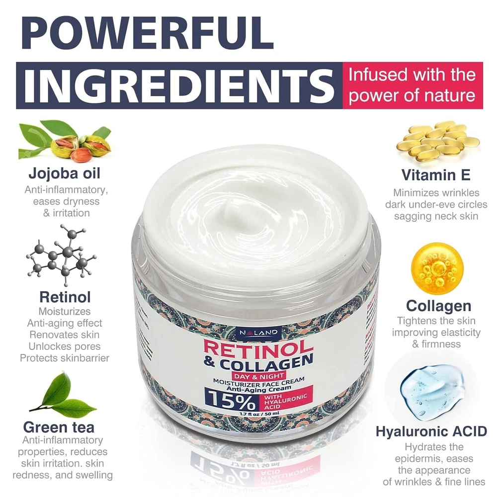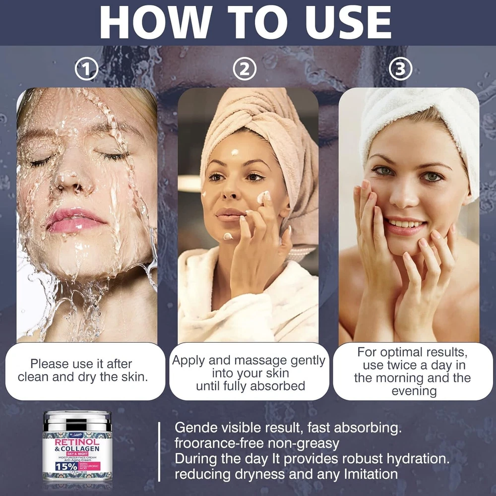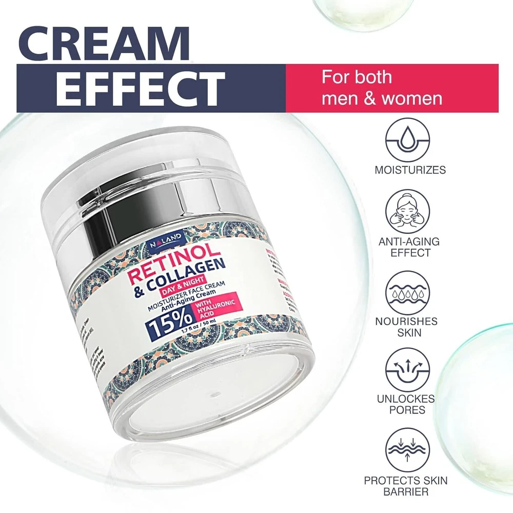FREE SHIPPING Retinol Cream for Face with Hyaluronic Acid - Collagen Face Moisturizer for Women and Men - Anti Aging Cream for Lifting Skin – For Wrinkles, Fine Lines and Dryness - All Skin Types Key Ingredients: Retinol (Vitamin A): Stimulates collagen production to improve skin elasticity. Promotes cell turnover, reducing the appearance of fine lines, wrinkles, and dark spots. Helps to even out skin tone and refine texture. Hyaluronic Acid: Provides deep hydration, retaining moisture and plumping the skin. Reduces the appearance of fine lines caused by dryness. Enhances skin’s natural barrier function. Collagen: Supports skin’s firmness and elasticity. Helps maintain a youthful, lifted appearance. Assists in restoring skin’s natural structure. Other Ingredients: May contain aloe vera, vitamin E, and natural oils to soothe and nourish. Paraben-free and formulated without harsh chemicals (depending on the brand). Benefits: Anti-Aging: Reduces the appearance of wrinkles, fine lines, and age spots. Hydrating: Keeps skin moisturized and prevents dryness, promoting a radiant complexion. Skin Lifting: Enhances skin firmness, giving a more lifted and youthful appearance. Suitable for All Skin Types: Gentle enough for dry, oily, combination, and sensitive skin. How to Use: Cleanse: Start with a clean, dry face. Apply: Use a small amount, applying evenly to the face and neck. Night Use Preferred: Best used in the evening; retinol can increase sun sensitivity. Moisturize: Follow up with a moisturizer if extra hydration is needed. Sunscreen: Always apply SPF during the day when using retinol products. Precautions: Patch Test: Perform a patch test before first use to check for sensitivity. Gradual Introduction: Start by using it 2-3 times a week and increase as tolerated. Avoid Mixing: Do not use with other strong actives like vitamin C or AHAs/BHAs initially. Who It's For: Women and men seeking to reduce signs of aging. Those with dry, dull, or aging skin looking for hydration and firming. Individuals aiming to improve skin texture and reduce hyperpigmentation.