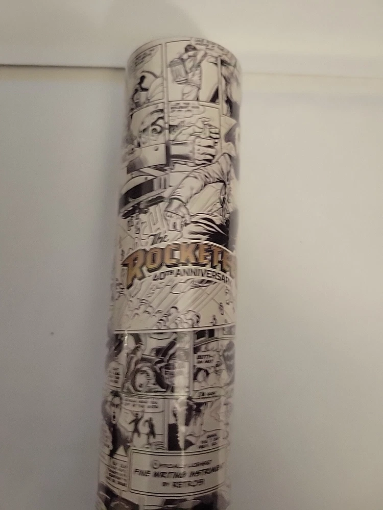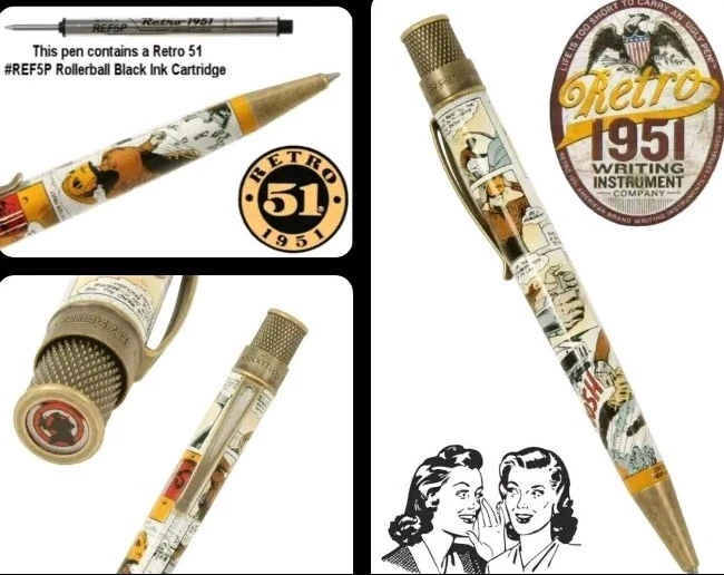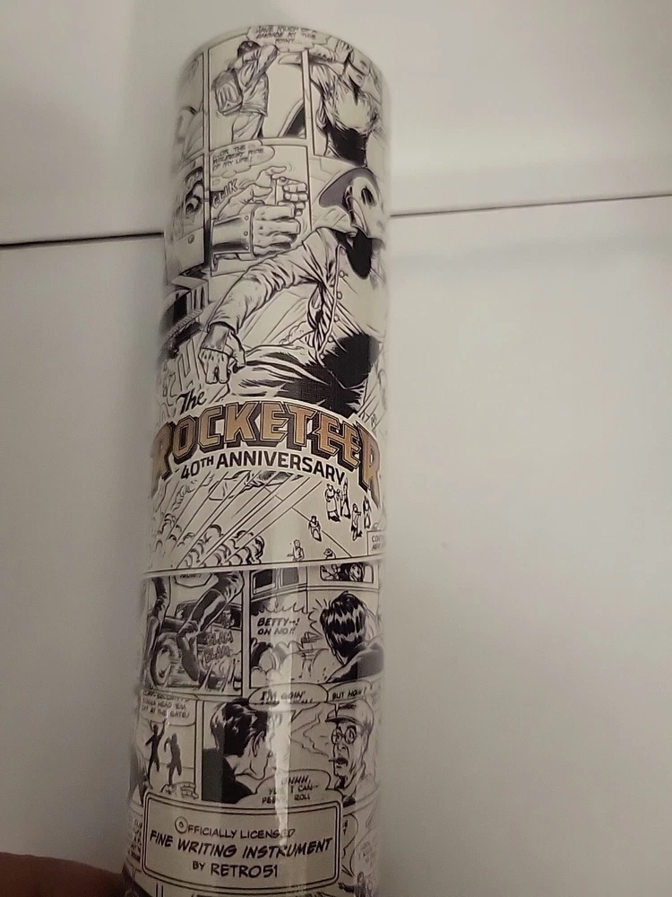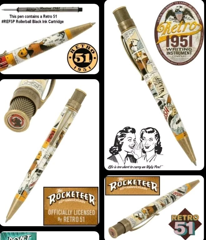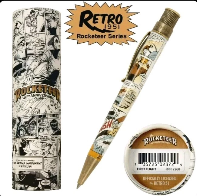 Sealed in tube # 0070. Images are a mix of stock and item for sale. This listing is a New Retro 51 Rocketeer Series Tornado Rollerball Pen. This one features a classic Stonewashed Brass Finish on the hardware and a white pen barrel with the color comic strip graphics, Model #RRR-2260. This is a twist action rollerball pen with black ink. The pen is 5" long with a barrel diameter of .470 and is .350 at the cone. This Series Tornado pens are packaged in a 1951 style Rocketeer Themed box that is loaded with character. The packaging adds to Retro 51 experience. We have added a photo of the packaging with this pen. We are delighted to announce our new line of Officially Licensed collectible pens celebrating the 40th Anniversary of Dave Stevens’ The Rocketeer! We’ve partnered with Okkto and The Rocketeer Trust to bring you five gorgeous new pens, all paying tribute to Dave’s iconic comic book character and exquisite art. Brought to life in 1982 by writer / artist Dave Stevens, The Rocketeer is an exciting and beautifully illustrated homage to the Saturday matinee serial heroes from the 1930s through the 1950s. In 1938 Los Angeles, Cliff Secord, a local racing pilot and barnstormer, discovers a rocket pack hidden by two gangsters fleeing the police. When he decides to take it for a spin, his life is turned upside down – in more ways than one! Cliff's pulpy adventures are set in Los Angeles and New York, and Stevens gave them a retro, nostalgic feel influenced by the King of the Rocket Men and Commando Cody movie serials, as well as pinup diva Bettie Page.