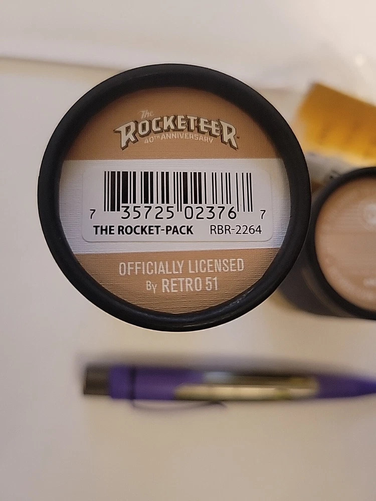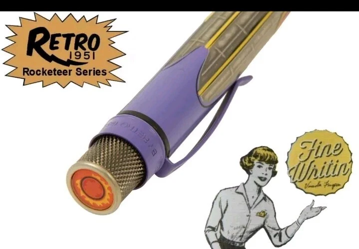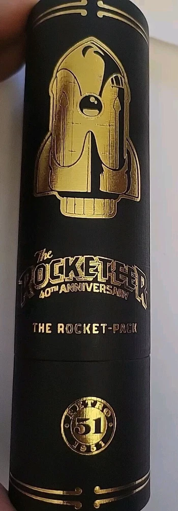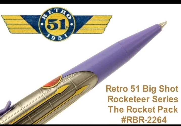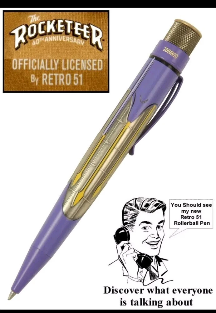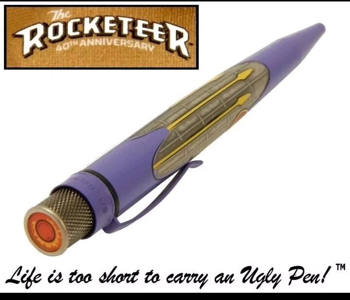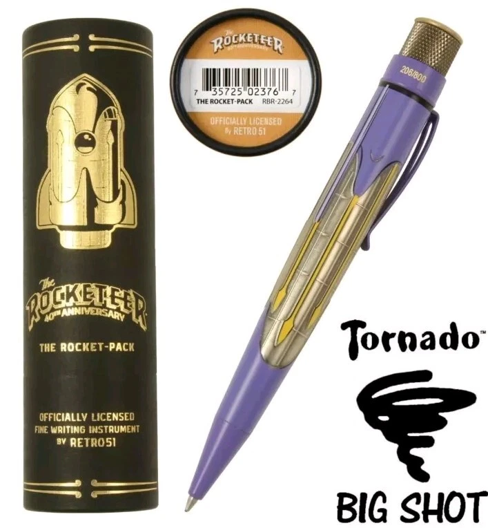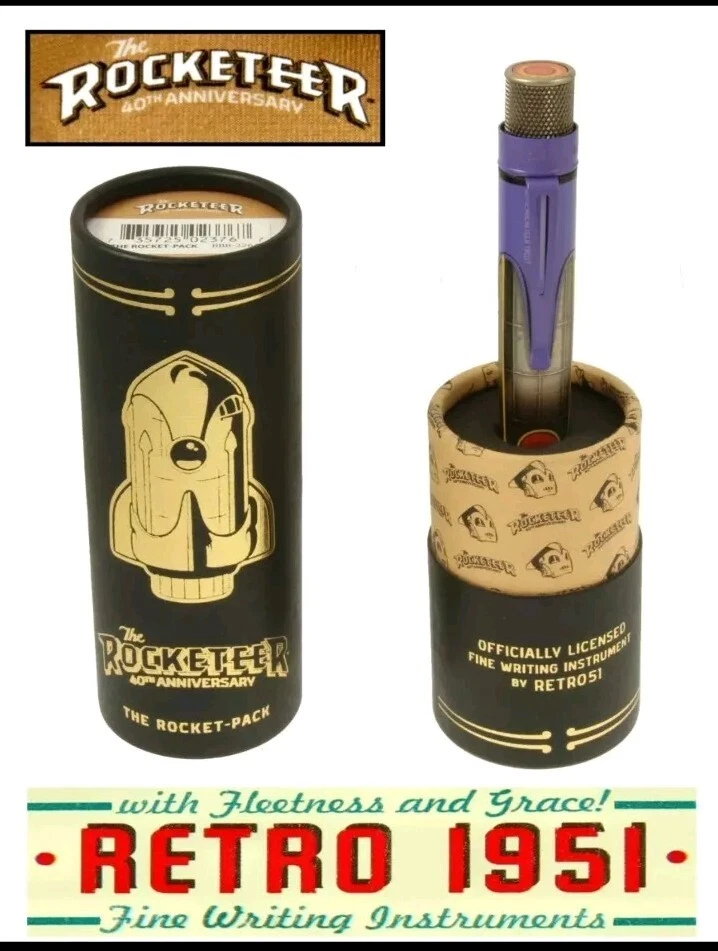 # 386 Pictures are stock with actual it added. Opened for display. No marks or blemishes. This listing is a New Retro 51 Rocketeer Series Tornado Rollerball Pen. This one features the classic acid etched Rocket-Pack on stonewashed Pewter and is Model #RBR-2264. This is a twist action rollerball pen with black ink. The pen is 5" long with the larger diameter barrel that is is classic Big Shots. This Tornado pen is packaged in gold foil 1951 style Rocketeer Themed box that is loaded with character. The packaging adds to Retro 51 experience. We have added a photo of the packaging with this pen. We are delighted to announce our new line of Officially Licensed collectible pens celebrating the 40th Anniversary of Dave Stevens’ The Rocketeer! We’ve partnered with Okkto and The Rocketeer Trust to bring you five gorgeous new pens, all paying tribute to Dave’s iconic comic book character and exquisite art. Brought to life in 1982 by writer / artist Dave Stevens, The Rocketeer is an exciting and beautifully illustrated homage to the Saturday matinee serial heroes from the 1930s through the 1950s. In 1938 Los Angeles, Cliff Secord, a local racing pilot and barnstormer, discovers a rocket pack hidden by two gangsters fleeing the police. When he decides to take it for a spin, his life is turned upside down – in more ways than one! Cliff's pulpy adventures are set in Los Angeles and New York, and Stevens gave them a retro, nostalgic feel influenced by the King of the Rocket Men and Commando Cody movie serials, as well as pinup diva Bettie Page.