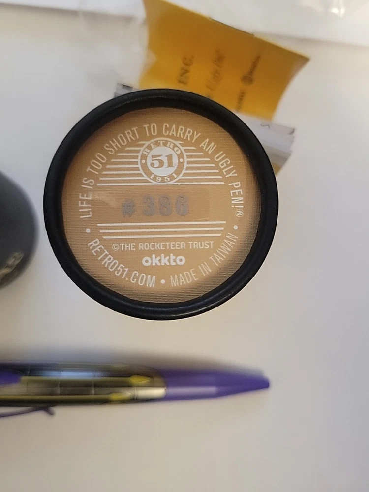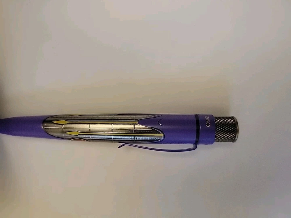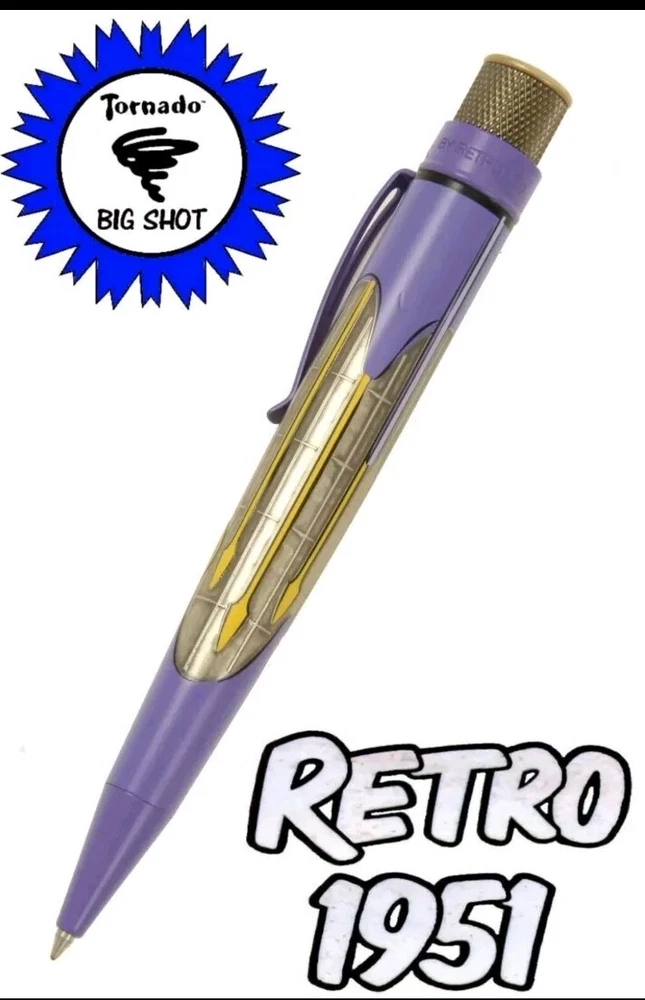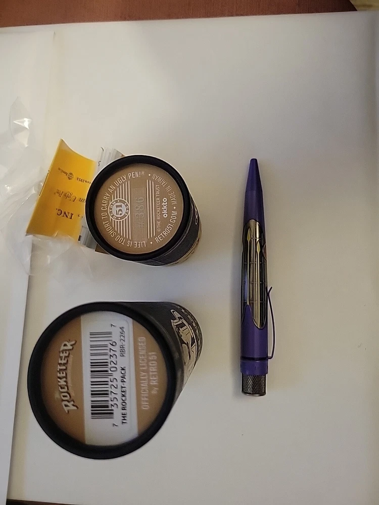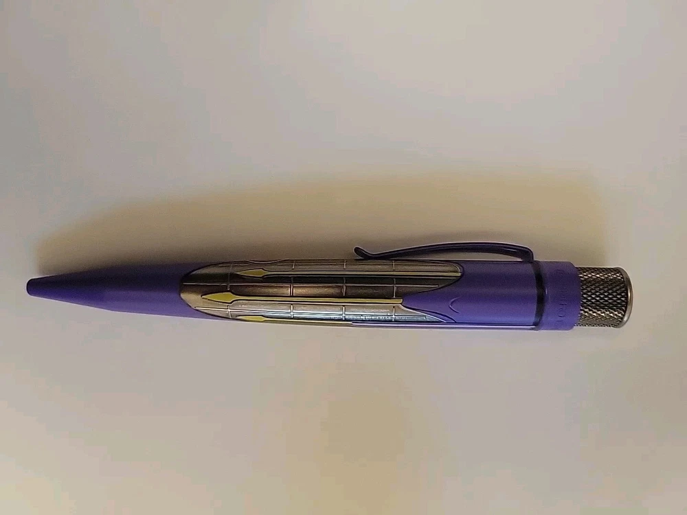 # 386 Pictures are stock with actual it added. Opened for display. No marks or blemishes. This listing is a New Retro 51 Rocketeer Series Tornado Rollerball Pen. This one features the classic acid etched Rocket-Pack on stonewashed Pewter and is Model #RBR-2264. This is a twist action rollerball pen with black ink. The pen is 5" long with the larger diameter barrel that is is classic Big Shots. This Tornado pen is packaged in gold foil 1951 style Rocketeer Themed box that is loaded with character. The packaging adds to Retro 51 experience. We have added a photo of the packaging with this pen. We are delighted to announce our new line of Officially Licensed collectible pens celebrating the 40th Anniversary of Dave Stevens’ The Rocketeer! We’ve partnered with Okkto and The Rocketeer Trust to bring you five gorgeous new pens, all paying tribute to Dave’s iconic comic book character and exquisite art. Brought to life in 1982 by writer / artist Dave Stevens, The Rocketeer is an exciting and beautifully illustrated homage to the Saturday matinee serial heroes from the 1930s through the 1950s. In 1938 Los Angeles, Cliff Secord, a local racing pilot and barnstormer, discovers a rocket pack hidden by two gangsters fleeing the police. When he decides to take it for a spin, his life is turned upside down – in more ways than one! Cliff's pulpy adventures are set in Los Angeles and New York, and Stevens gave them a retro, nostalgic feel influenced by the King of the Rocket Men and Commando Cody movie serials, as well as pinup diva Bettie Page.