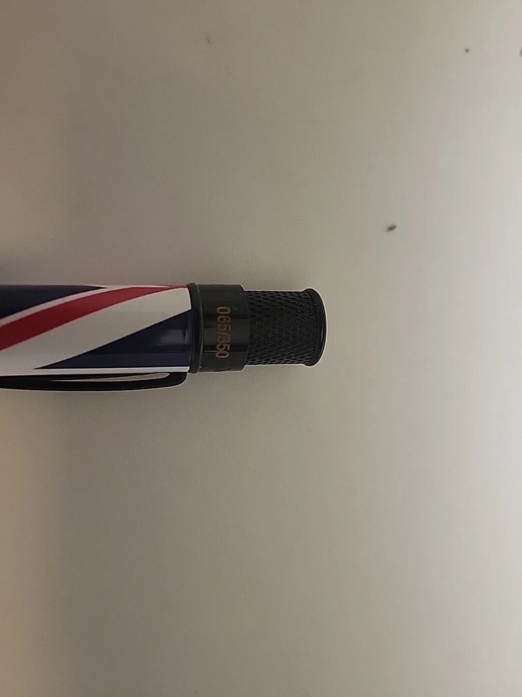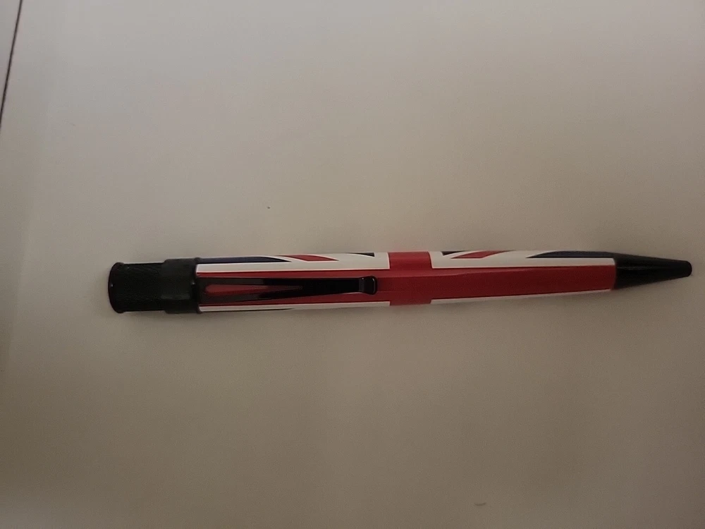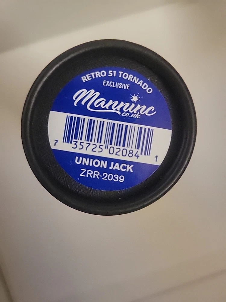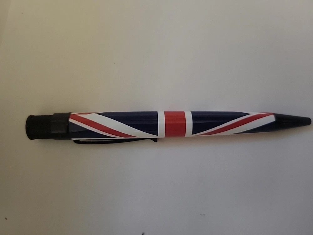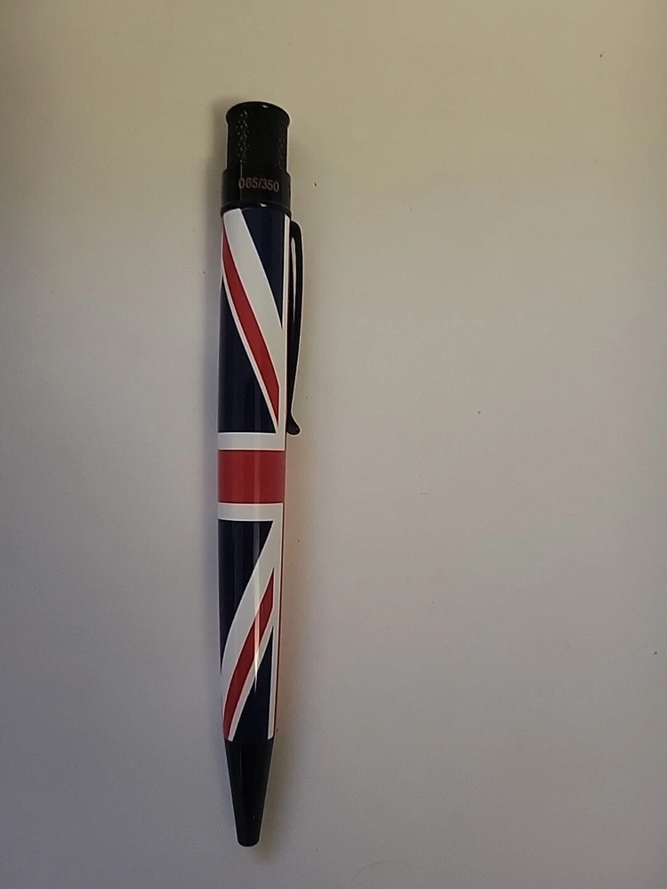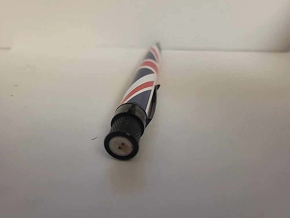 From a collectors inventory. Opened for display. No marms or blemishes. Pictures are of item for sale. We're chuffed to bits about the latest Tornado Exclusive release produced with Retro51... the Union Jack. This lovely design features the United Kingdom's famous red, white and blue flag complimented with polished black accents and topped off with the Queen's Crown Jewels on the finial. Stop faffing about because only 350 numbered rollerballs have been produced so they won't last long. Now who fancies a cup of tea? The Tornado Union Jack takes a Schmidt P8127 rollerball refill, or alternatively you could fit an Easy Flow refill if you prefer ballpoints. Union Jack Details: · Limited Edition numbered top ring of just 350 pieces.· Authentic Union Jack Flag design.· Black Stealth Accents.· Crown jewels top disc design· Exclusive Union Jack packaging tube Your Tornado pen comes in attractive gift packaging which doubles as a desk pen holder.