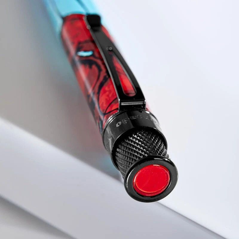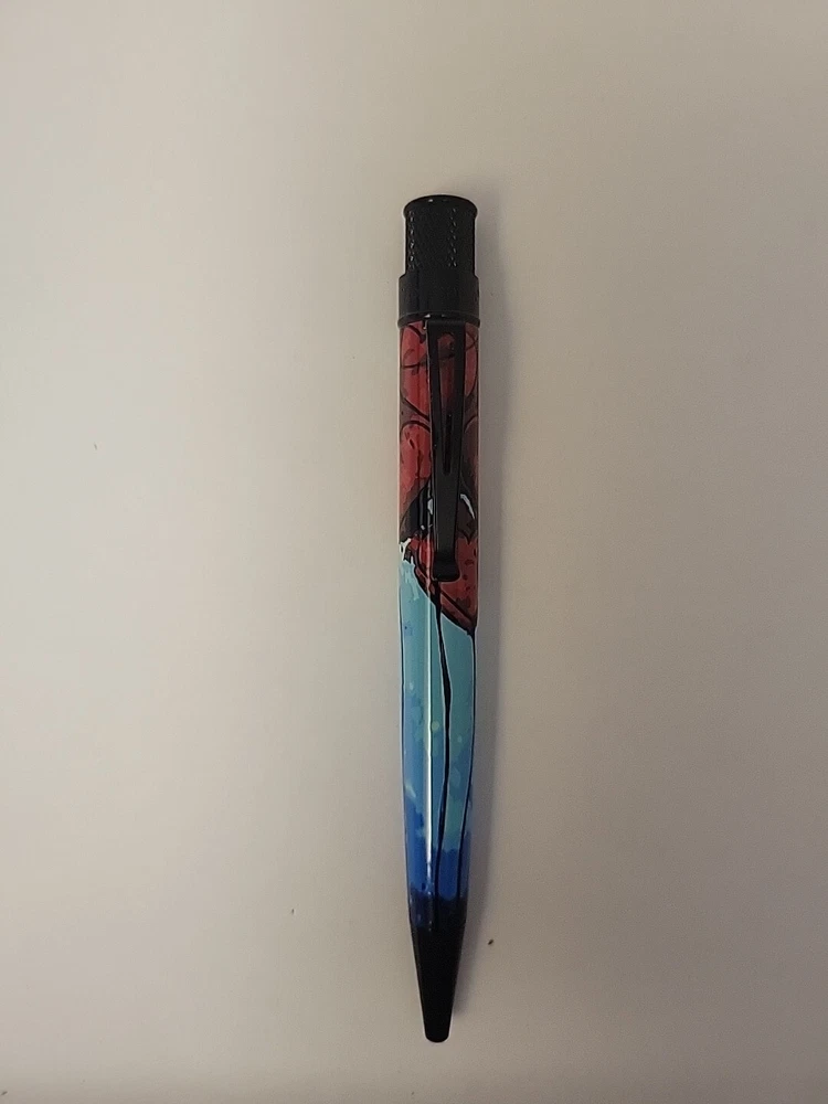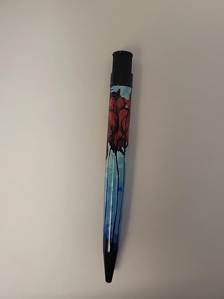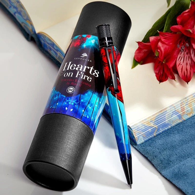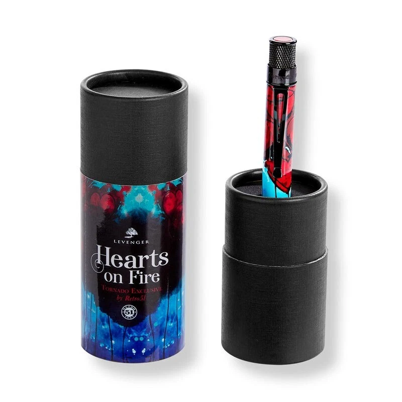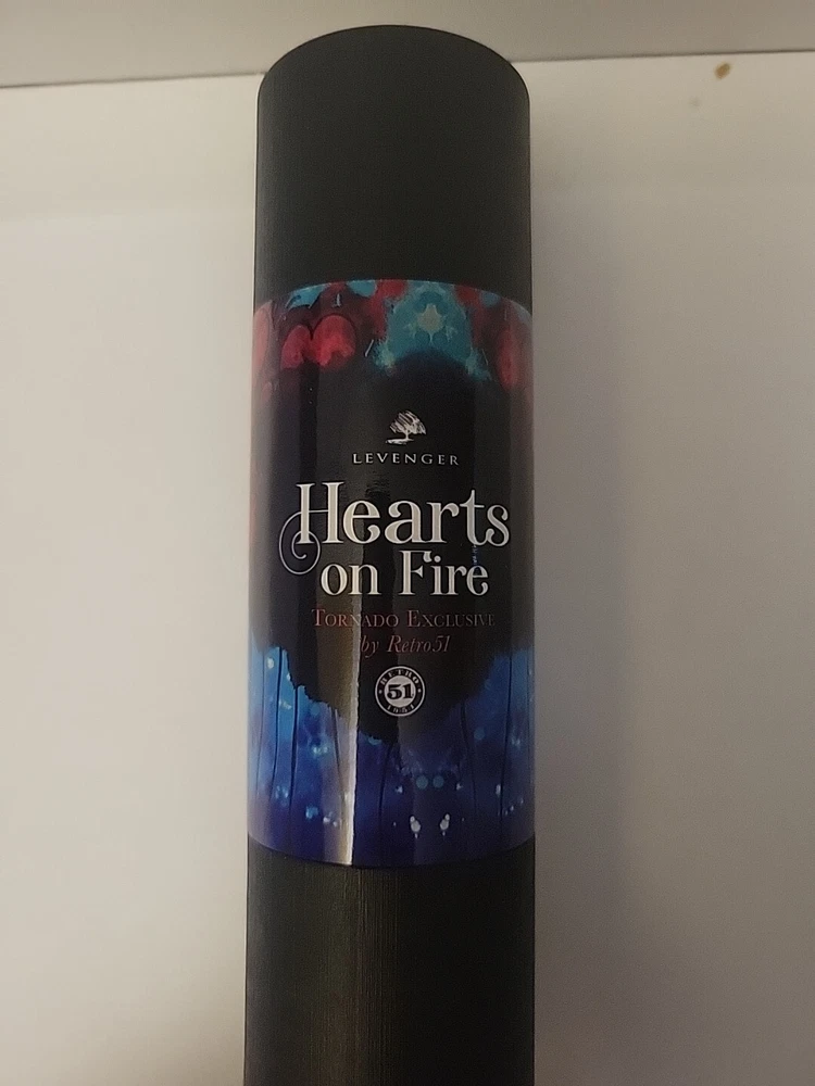 From a collectors inventory. No marks or blemishes. first 4 ictures are promotional. The remiander are of item for sale. Love is a flame that sets hearts on fire and sends them aloft with joy. In collaboration with Retro 51, Levenger presents an exclusive capless rollerball pen design featuring an exquisite original illustration by artist Sharon Cummings. The Hearts On Fire Rollerball has a printed stainless steel barrel and knurled twist mechanism and comes in an illustrated storage cylinder that doubles as a pen stand.