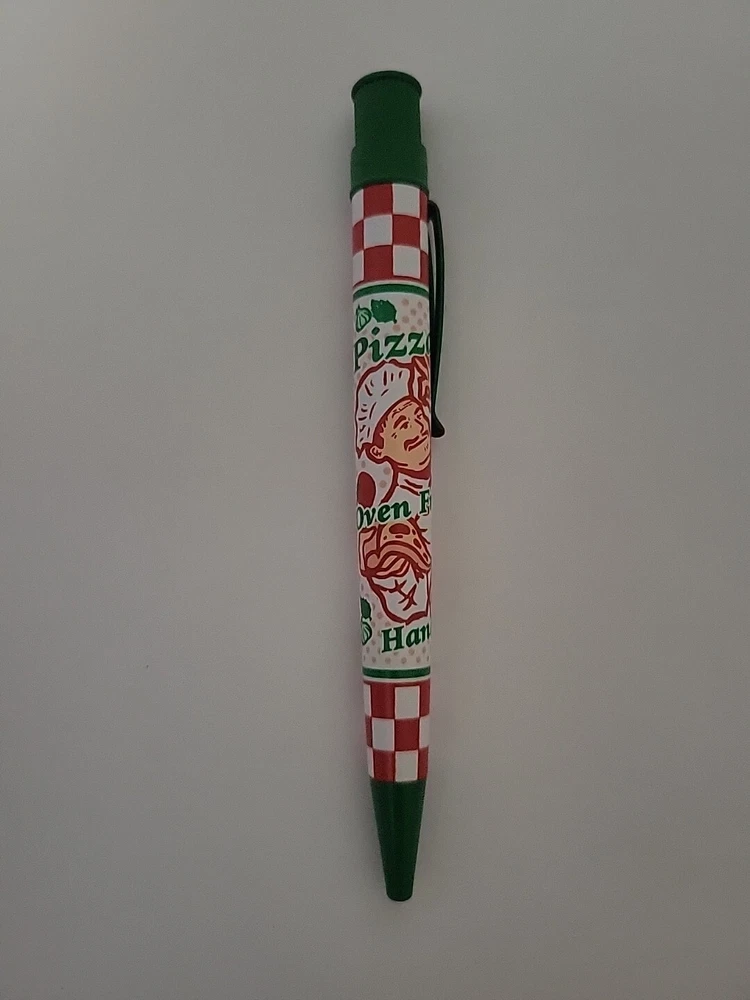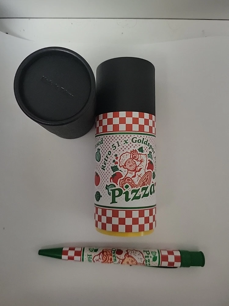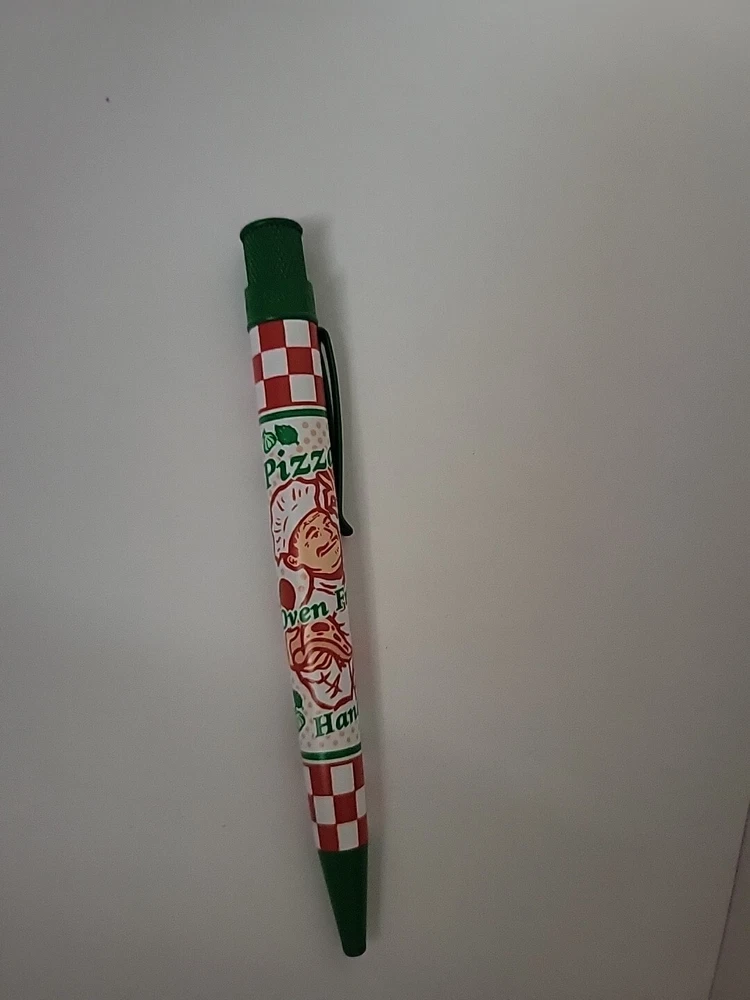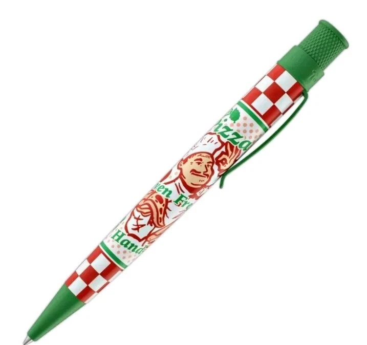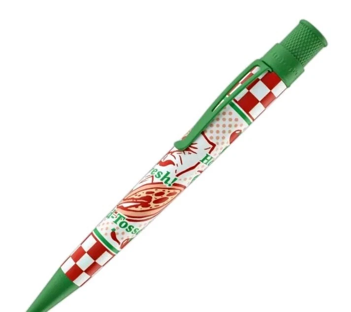 Opened for display. No Marks or blemishes. Pictures are of item for sale. Note first 4 pictures are promotional. The Retro 51 Tornado PIZZA Rollerball / Pen design pays tribute to all the Mom and Pop pizza places with a barrel design that incorporates classic imagery from pizza boxes. Central to the design is the jolly, mustachioed pizza chef giving his seal of approval. He is surrounded by icons of fresh ingredients - basil leaves, garlic, tomato, and the Italian "lucky pepper." The red cornicelli is reminiscent of a chili pepper and is often worn or hung to protect against the malocchio ("evil eye") and bad luck. The traditional red, white, and green of the Italian flag are represented throughout the pen's coloring. The textured white base and matte clear coat mimic the feel of a pizza box in your hands. Retro 1951 Tornado Pizza Rollerball Pen Specifications Finish: Pizza box graphic design printed with matte white texture base and matte clear coat. Trim: Matte green metal accents Knurled twist-top Pizza graphic top disc Pen Length: 5 in. / 125mm Pen Barrel Diameter: 0.45 in. / 12mm Pen Weight: 1 oz / 28g Matching graphic tube packaging.