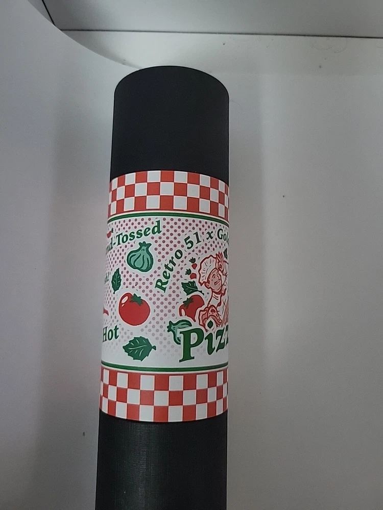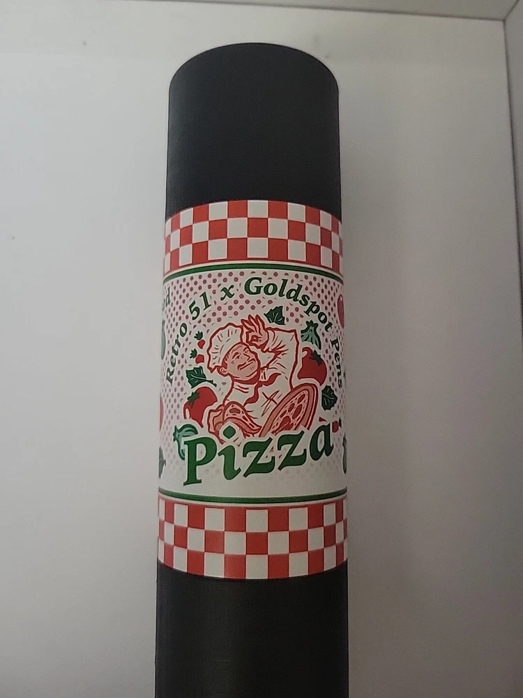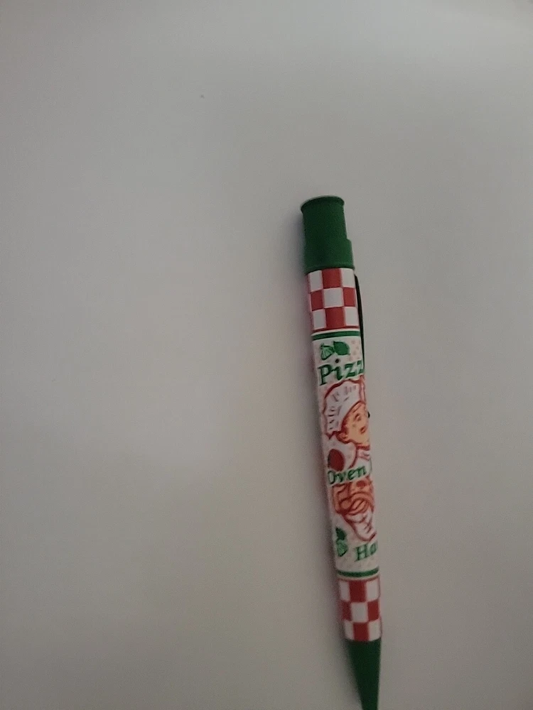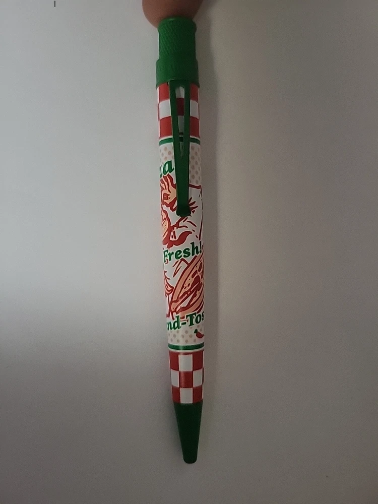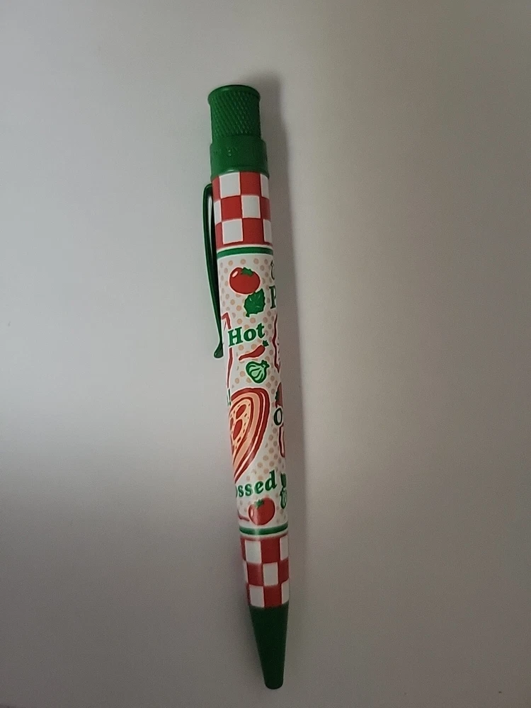 Opened for display. No Marks or blemishes. Pictures are of item for sale. Note first 4 pictures are promotional. The Retro 51 Tornado PIZZA Rollerball / Pen design pays tribute to all the Mom and Pop pizza places with a barrel design that incorporates classic imagery from pizza boxes. Central to the design is the jolly, mustachioed pizza chef giving his seal of approval. He is surrounded by icons of fresh ingredients - basil leaves, garlic, tomato, and the Italian "lucky pepper." The red cornicelli is reminiscent of a chili pepper and is often worn or hung to protect against the malocchio ("evil eye") and bad luck. The traditional red, white, and green of the Italian flag are represented throughout the pen's coloring. The textured white base and matte clear coat mimic the feel of a pizza box in your hands. Retro 1951 Tornado Pizza Rollerball Pen Specifications Finish: Pizza box graphic design printed with matte white texture base and matte clear coat. Trim: Matte green metal accents Knurled twist-top Pizza graphic top disc Pen Length: 5 in. / 125mm Pen Barrel Diameter: 0.45 in. / 12mm Pen Weight: 1 oz / 28g Matching graphic tube packaging.