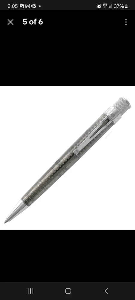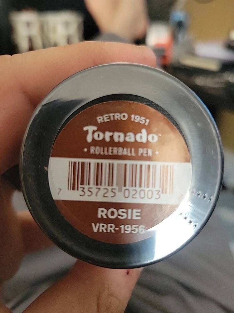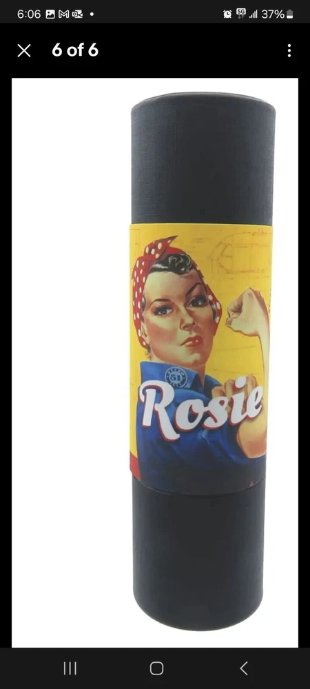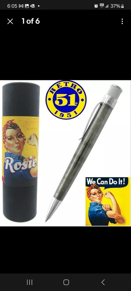 Retro 51 Tornado ROSIE THE RIVETER Rollerball / Pen New in sealed tube ROSIE THE RIVETER was the star of the campaign to recruit women into the American workforce during World War II. The iconic image of Rosie rolling up her sleeve and flexing her muscle still persists today at the symbol of female strength and resilience. In honor of Rosie's toughness, Retro 51 designed this ROSIE THE RIVETER Tornado Rollerball / Pen with an acid-etched metal barrel that is antique finished. The effect looks like heavy metal plating with rivets along the seams. Rose's tough demeanor is found in the top disc illustration. Retro 1951 Tornado Vintage ROSIE THE RIVETER Rollerball Pen Specifications: Finish: Acid-etched metal with antique finishing. Trim: Polished chrome trims Knurled twist-top Refill: Rollerball Refill REF5P/REF57P, can also adapt to Ballpoint Conversion REF71 Easy Flow 9000 (sold separately) Rosie the Riveter illustration on the top disc Pen Length: 5 in. / 125mm Pen Barrel Diameter: 0.45 in. / 12mm Pen Weight: 1 oz / 28g Matching graphic tube packaging.