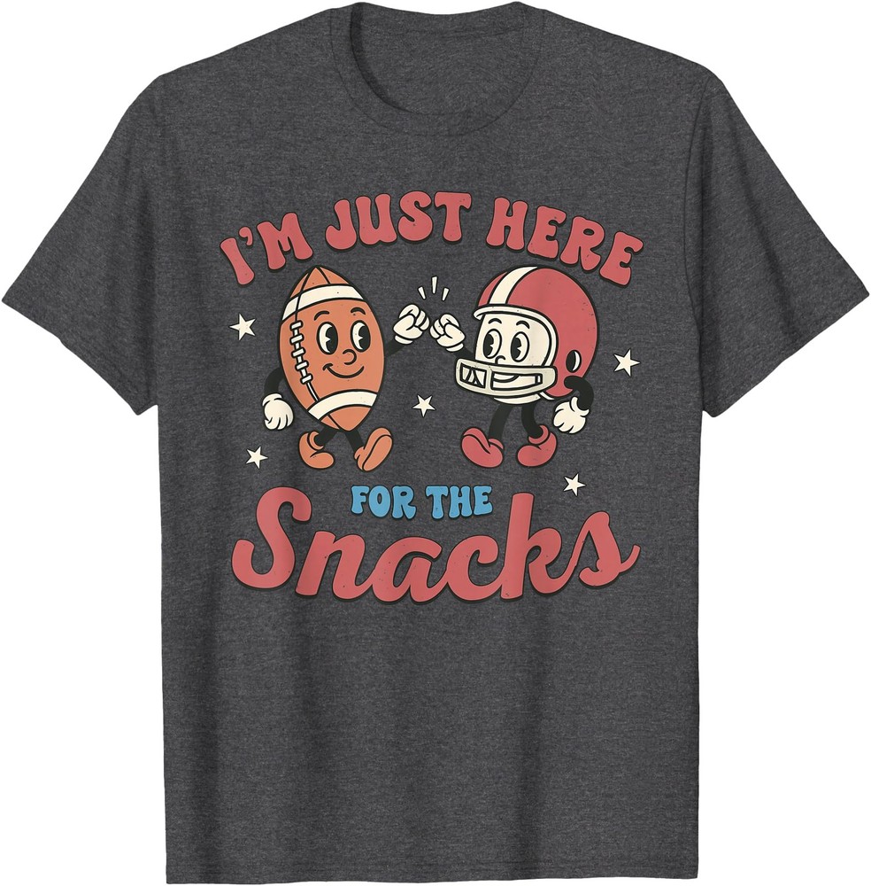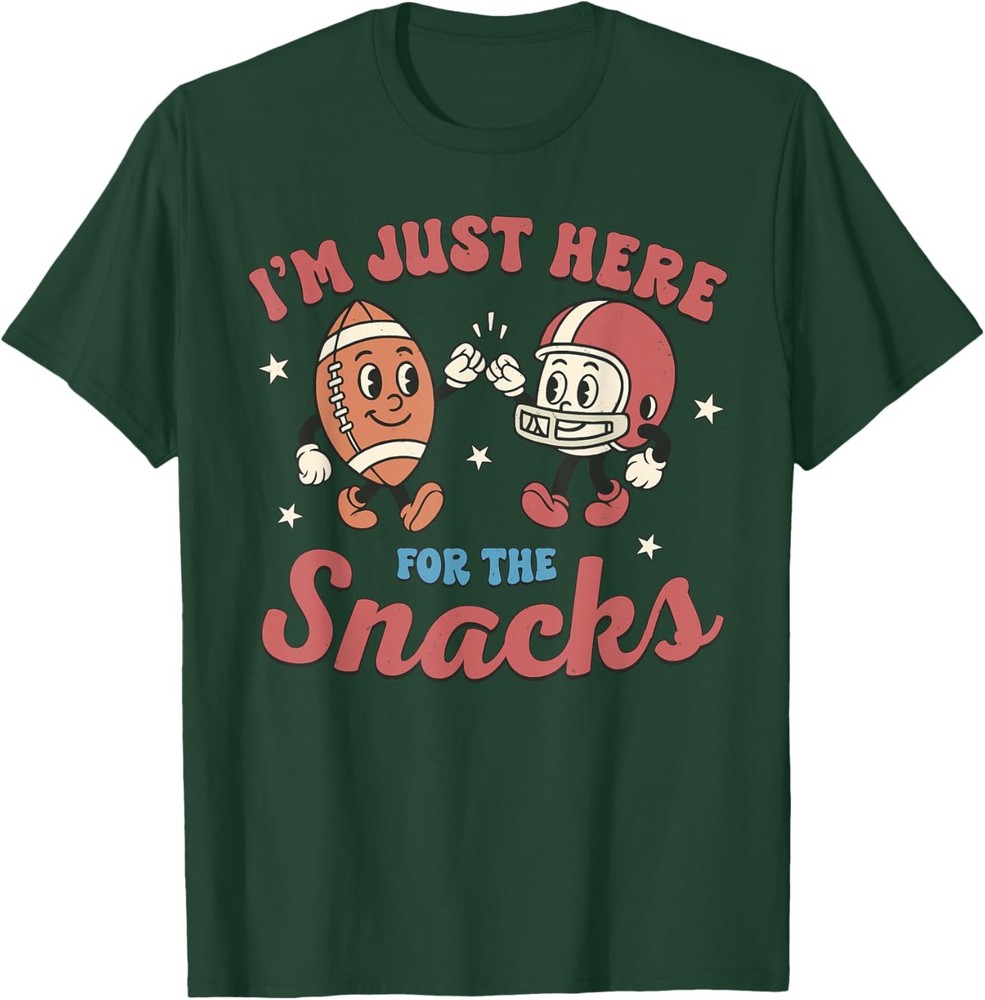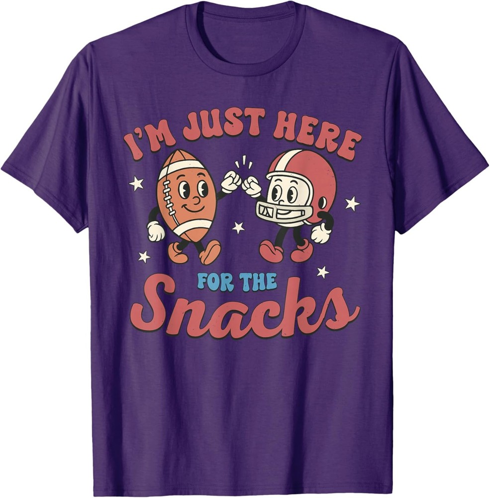 Retro I'm Just Here for The Snacks Cute Football Women Kids T-Shirt Designed and Printed in USA Product Features: • Classic Look and Feel: This ultra cotton tee offer the timeless appeal of traditional cotton. The high-quality print enhances its casual appearance. • Material: Made from 6.1-ounce, 100% cotton. (Note: Dark Heather variant is 50% cotton, 50% polyester.) • Durability: Features double-needle stitching on the neck, sleeves, and hem for added durability. Designed for a roomy, unisex fit. • Print Type: DTG (Direct to Garment) • Manufacturer: Gildan 5000, 5000b (Made in USA) Shipping Information: • Handling Time: With POD(Print-On-Demand) product model, we typically require about 3 business-days handling time before shipping. In most cases, our handling time’s , rang e from 1-2 business days. • Delivery Time: • USA: Approximately 2 -6 business days • Canada: Approximately 6-10 business days (We currently don’t offer international Shipping) • Worldwide: Approximately 15-25 business days (We Currently don’t offer international Shipping) • Shipping Carriers: USPS and DHL • Note: Business days exclude weekends and holidays. Return & Exchange Policy: • Quality Guarantee: We stand behind the quality of our products and workmanship . Any defects or errors on our part must result in a refund/ replacement at no charge. • Conditions for Returns: Returns are generally not accepted for user errors such as incorrect selection of sizes, designs, or colors. Returns /Replacements are acceptable for damages such as poor printing results, incorrect size or design caused by us. • Note: Please reach out to us if there are any questions or issue s with your item, we’ll do our best to resolve any issue you might have. Note: • We’re glad to have your support! If you have a moment, y our honest feedback is very valuable to us. Thank you!
