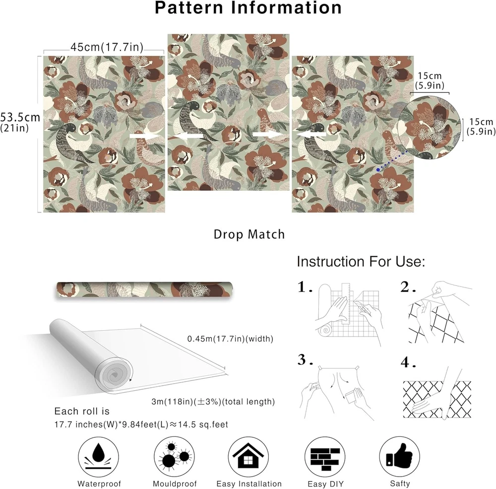 This product is a retro peel and stick waterproof wallpaper with a boho vintage floral design. It comes in a roll size of 17.5" x 118" and is made of vinyl material. The wallpaper is self-adhesive, making it easy to apply with a peel and stick application. The gray color and floral pattern give it a unique and stylish look, perfect for adding a touch of vintage charm to any room in your home.