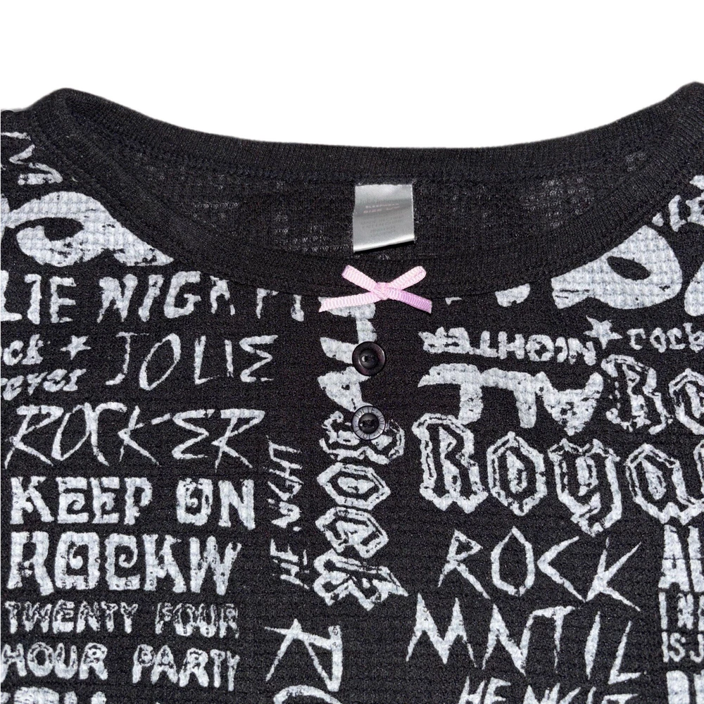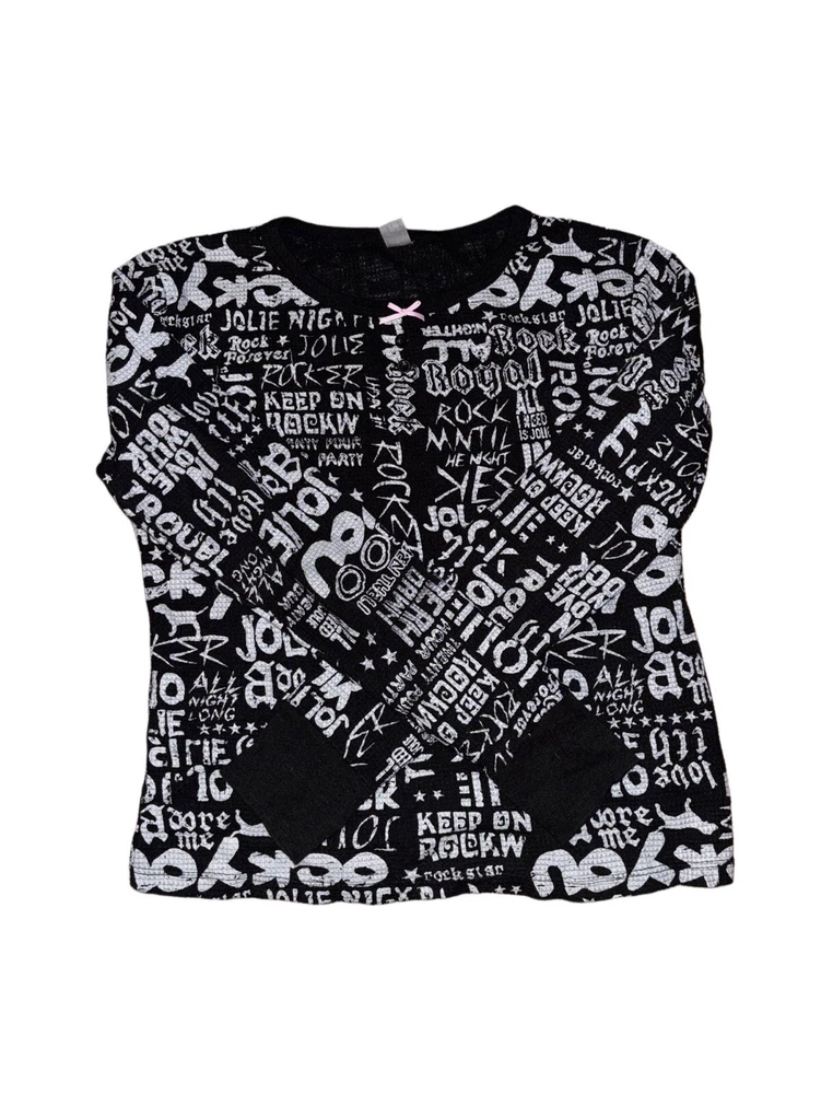 Elevate your casual wardrobe with this Retro Vintage Y2K Punk Rock Graphic Long Sleeve T-Shirt by Jolie. The black t-shirt features a unique all-over print design with a bow accent, perfect for adding a touch of grunge and gothic flair to your look. Made from a lightweight blend of polyester and cotton, this Petite size shirt is ideal for women looking to rock a retro vibe with a regular fit. Machine washable and suitable for everyday wear, this statement piece is a must-have for any vintage-loving fashionista.