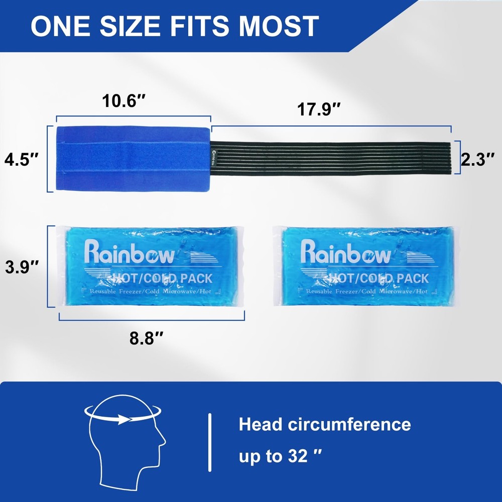 Reusable Hot and Cold Packs for Injuries, 2 Flexible Gel Ice Pack Cold Hot Compress for Joint Pain, Muscle Soreness, Tension Headache, Adjustable Therapy Wrap for Knees, Back, Shoulders, Arms and Legs DUAL GEL ICE PACKS - Migraine relief cold pack comes with a set of two gel packs and an adjustable, one-size-fits-all wrap that make your hands free, you can keep one gel pack in freezer and one out for heat up. NATURAL PAIN RELIEVE - reusable gel ice pack wrap provides lasting pain relief for you and your family to ease joint and muscle pain or relieve pain from fever, inflammation, post surgery by hot and cold therapy. REUSABLE HOT AND COLD COMPRESS - Headache cold pack can be heated up in a microwave or frozen in the freezer, a perfect first aid essential for home or clinical use as it's an ideal life saver for whom suffering from cluster headache, hot flashes, carpal tunnel syndrome, plantar fasciitis, heel pain, arthritis, tendonitis, stiff neck. COMFORTABLE AND EASY TO USE - The gel packs and wrap are made from soft yet durable materials, comfortable to wear. The blue ice packs stay soft and flexible even when taken straight out of the freezer. QUALITY VERSATILE GEL PACK - gel ice pack wrap designed with the inner bag and adjustable elastic strap, allows you to keep ice pack on your head, knees, lower back, elbows, shoulders and other areas for fast, supportive relief. These are perfect headache cold wrap, knee ice pack, shoulder ice pack, neck cold pack.